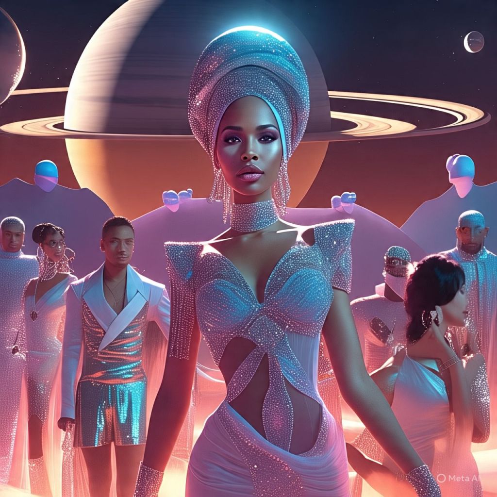 Ms. Reality steps onto a shimmering runway floating above Saturn’s rings. Each step lights up, music booms.