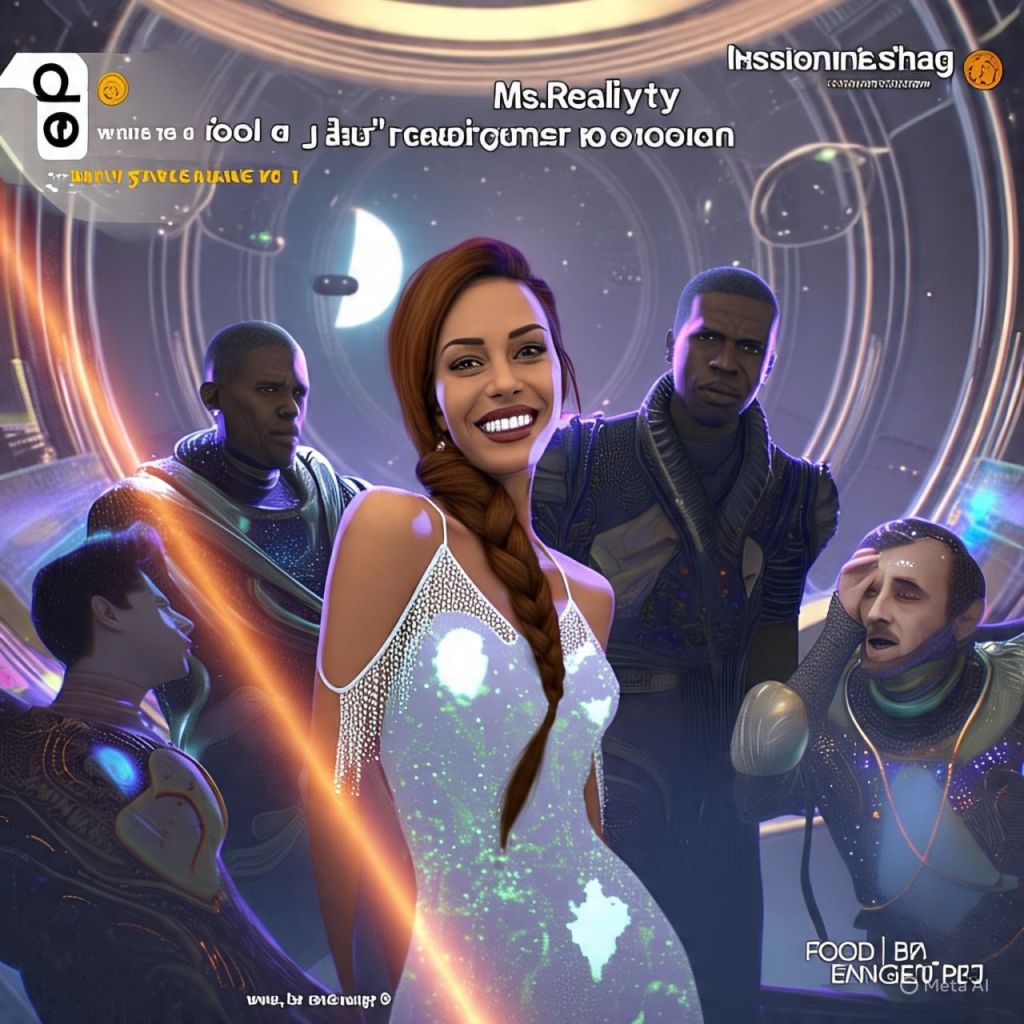 Ms. Reality arrives in a sparkling silver catsuit, hair flowing like cosmic waves, crown glowing.