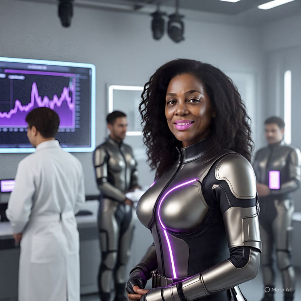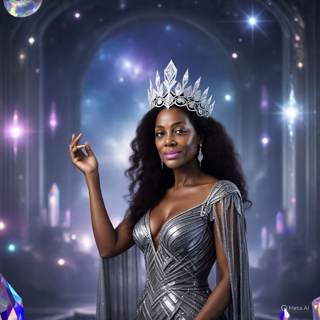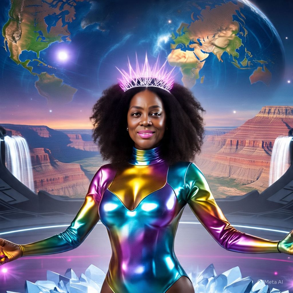 Wearing a metallic rainbow bodysuit that shifts colors with each breath, crown glowing like a cosmic eclipse.
