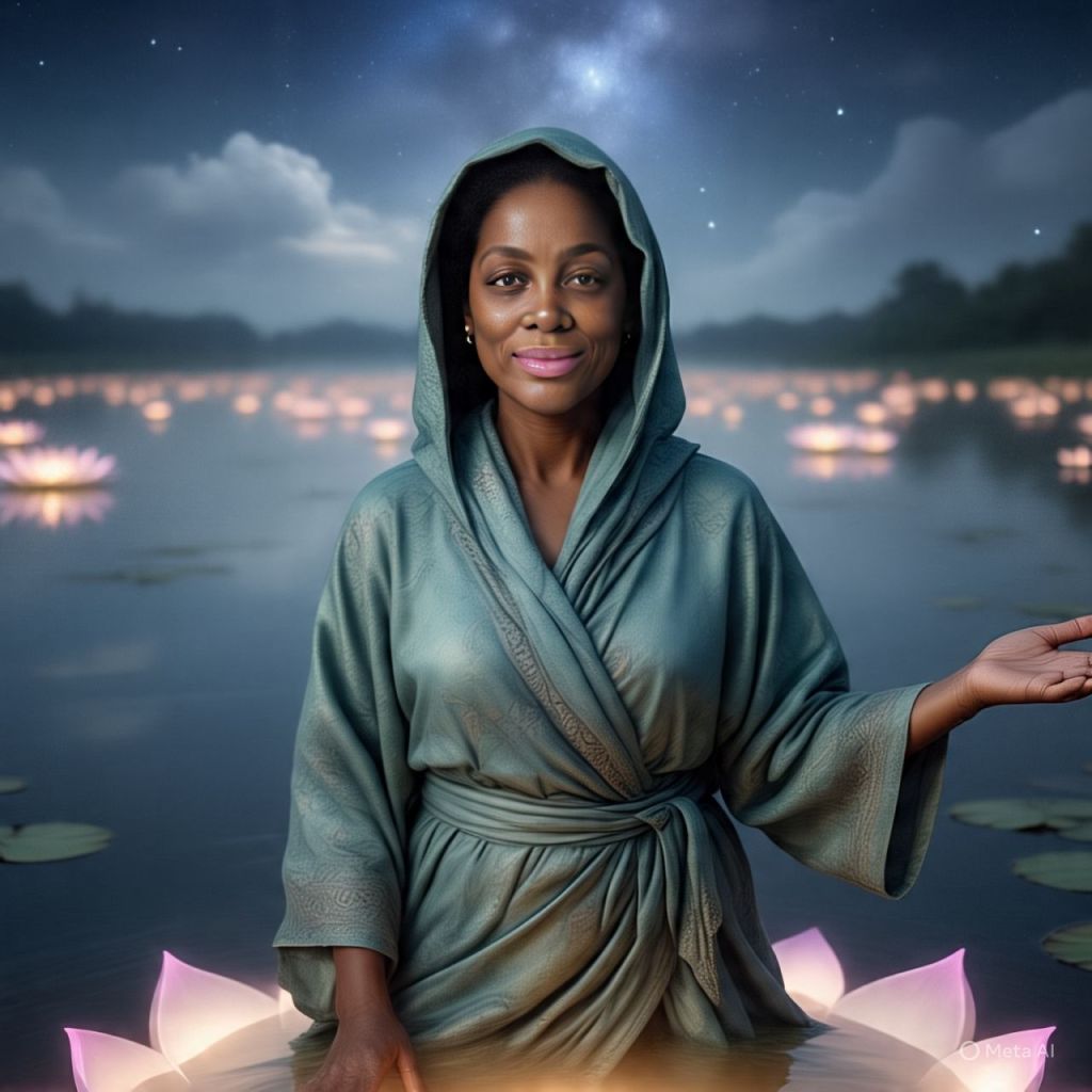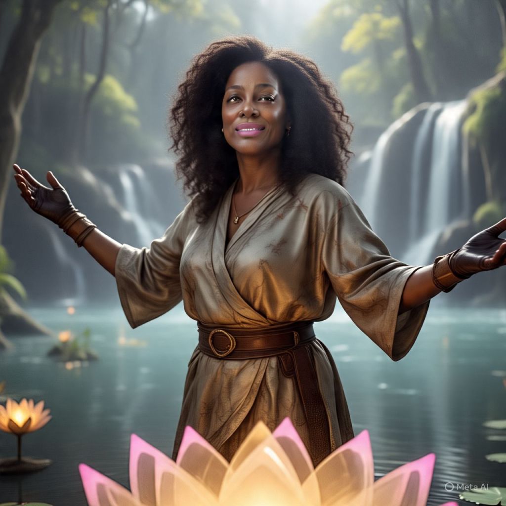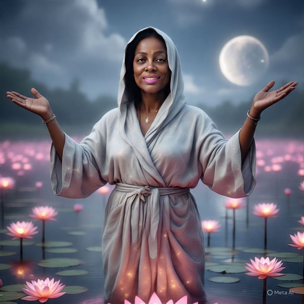 Antoinette stands on a giant glowing lotus in the middle of a sacred lagoon.