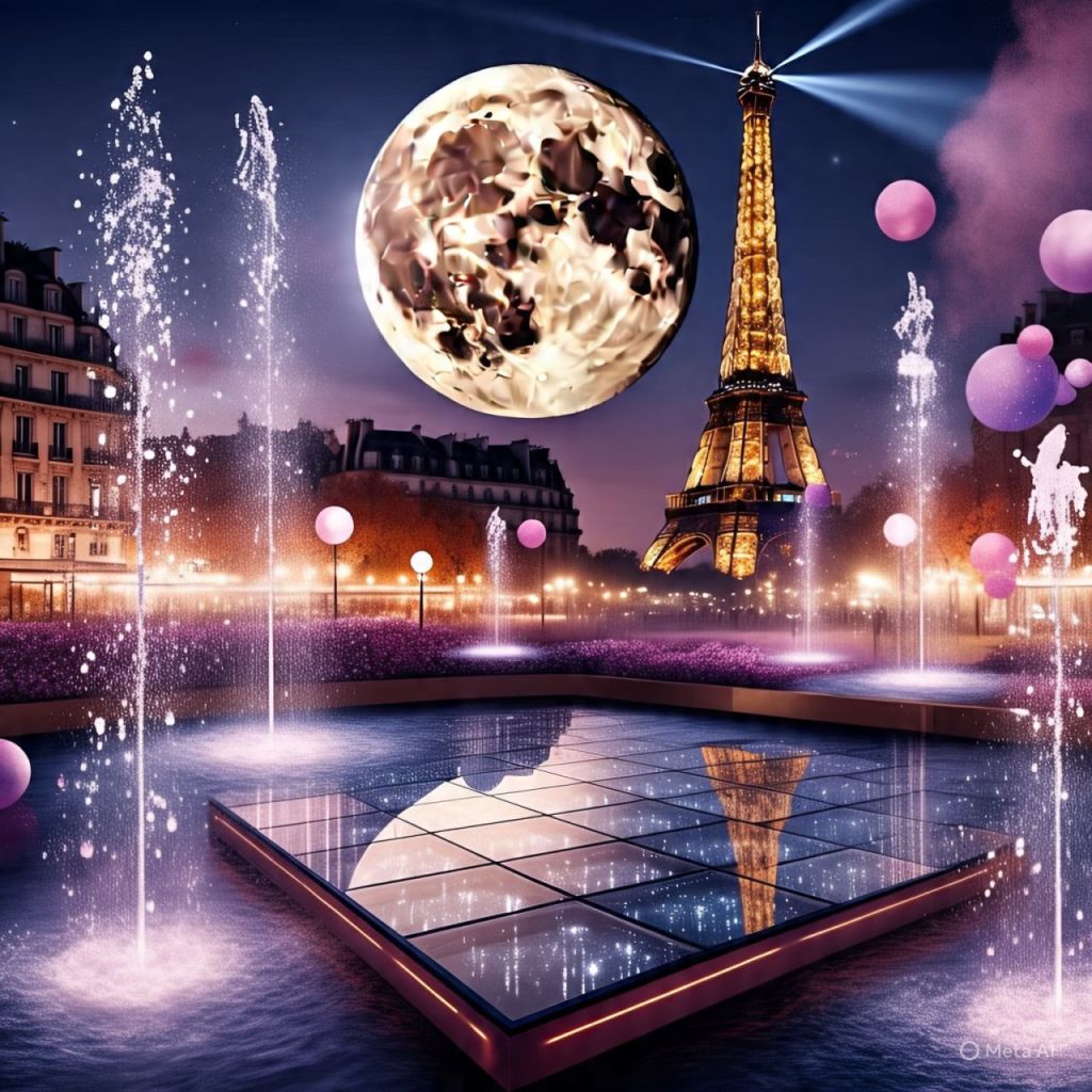 Champagne fountains spraying like cosmic confetti. Paris lights glow in pink and lavender.