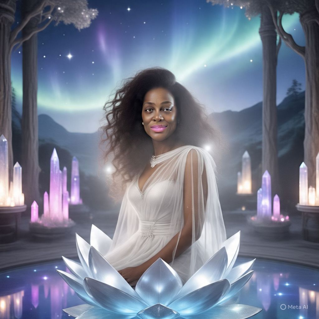 Antoinette rises from a luminous silver lotus throne wearing a flowing sheer white gown made of liquid moonbeams, hair swirling like cosmic storms, crown shimmering with orbiting micro-moons.