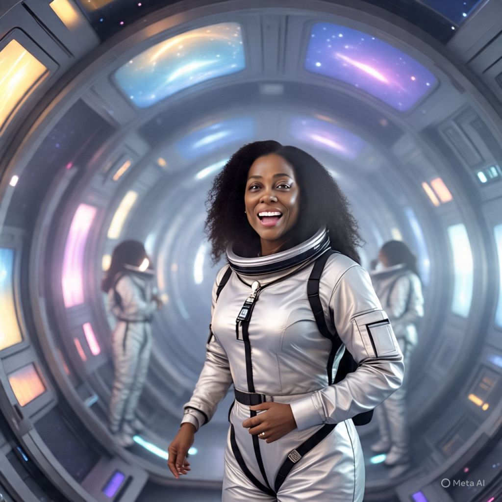 She glides forward, eyes locked on the galaxy: