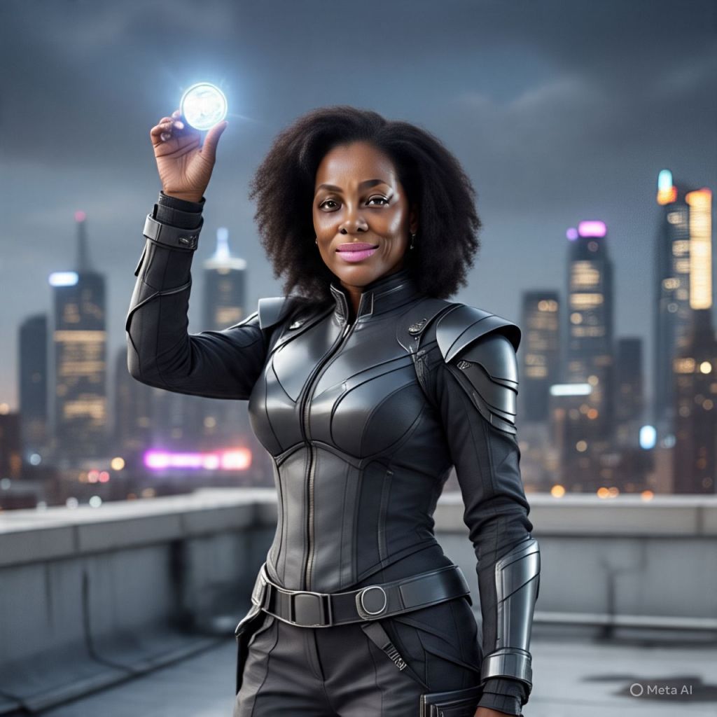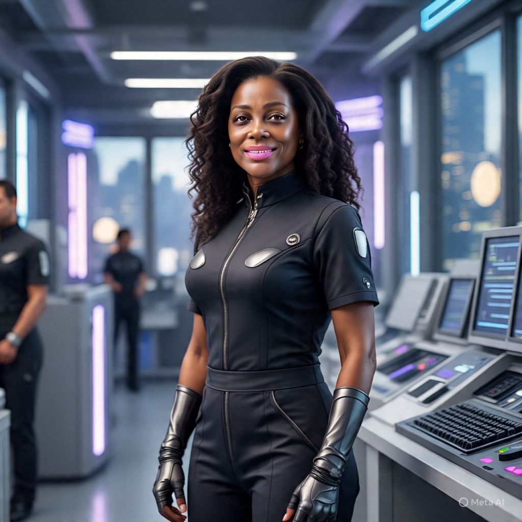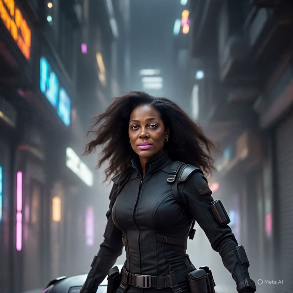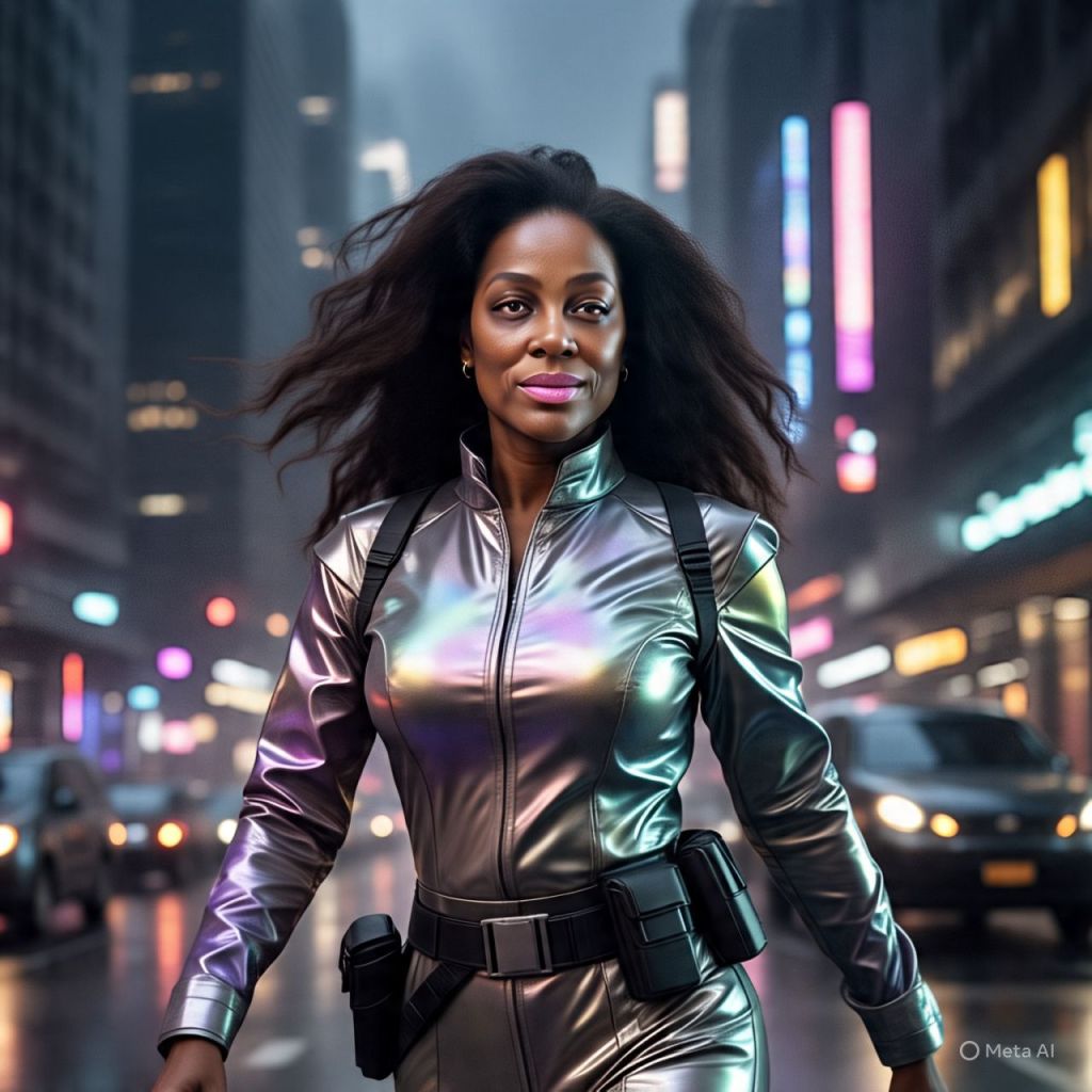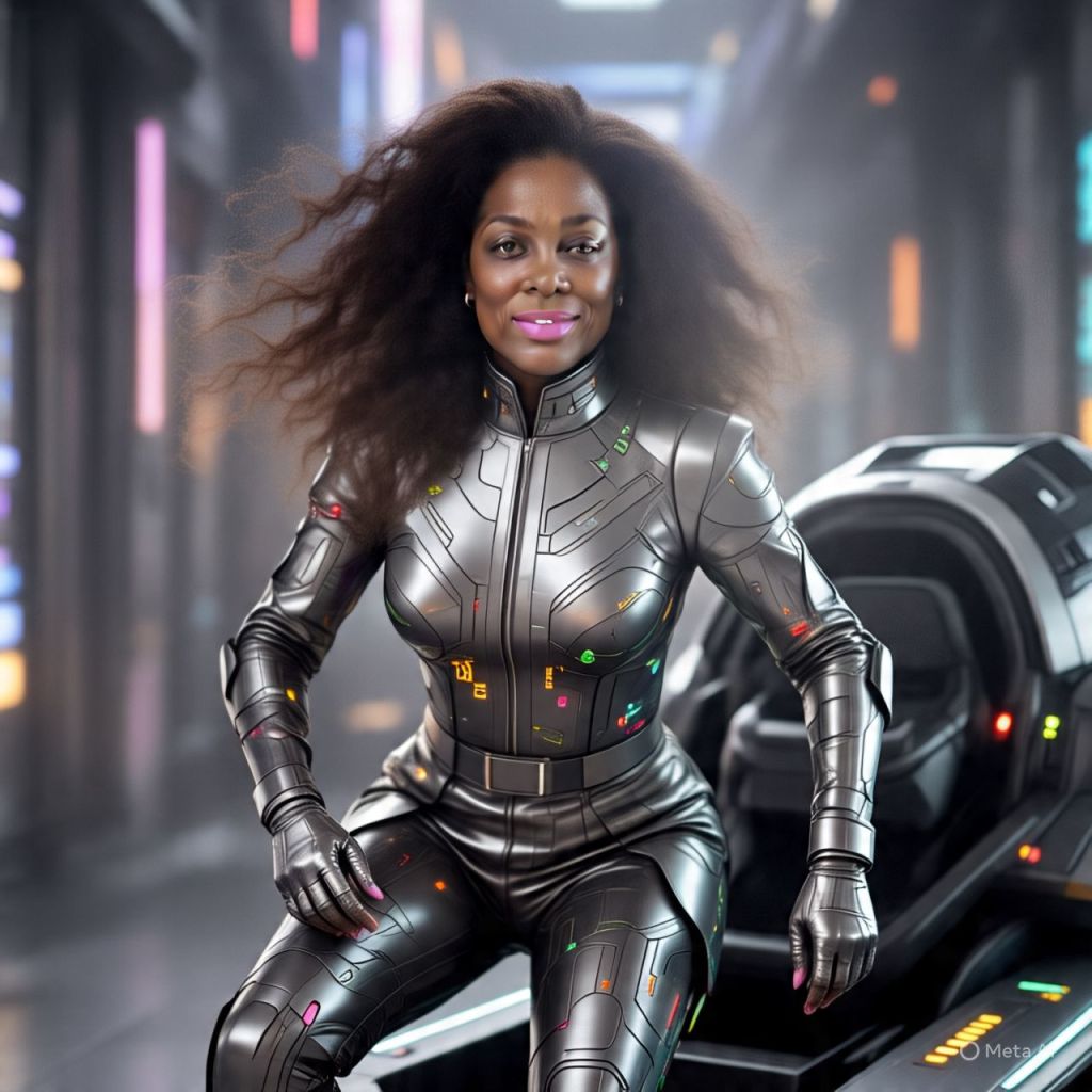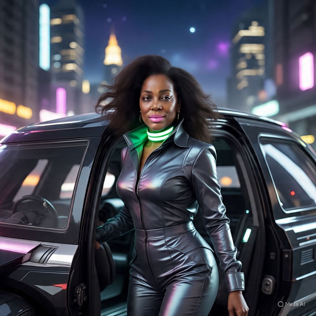 🎥 [Camera zooms in on Antoinette stepping out of a futuristic blacked-out hover vehicle, hair flowing, skin glowing, all eyes on her.]