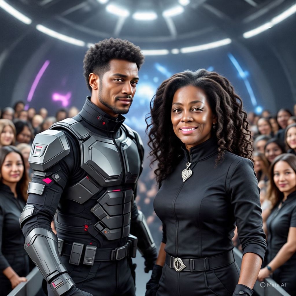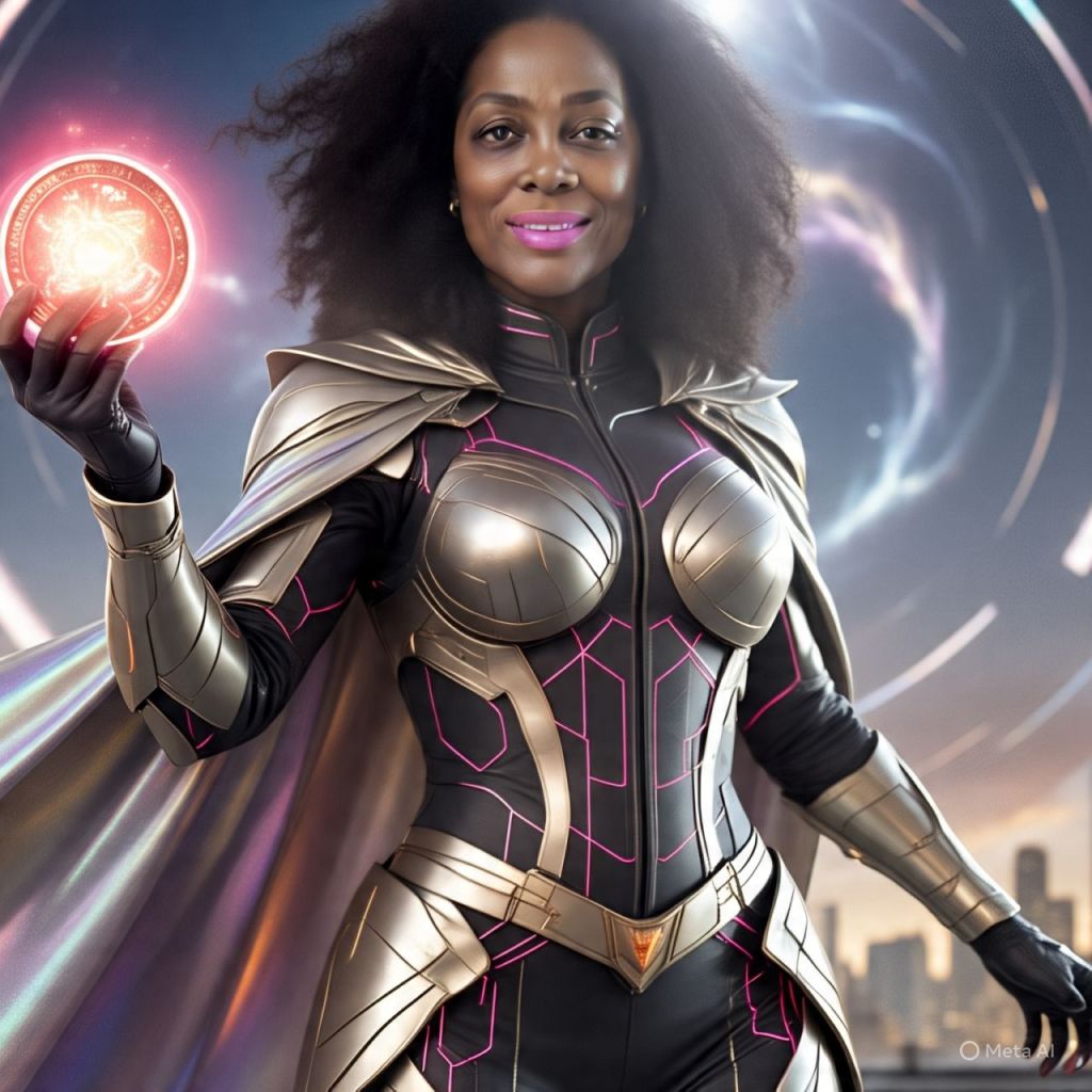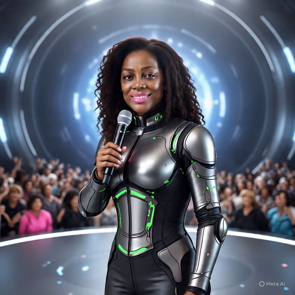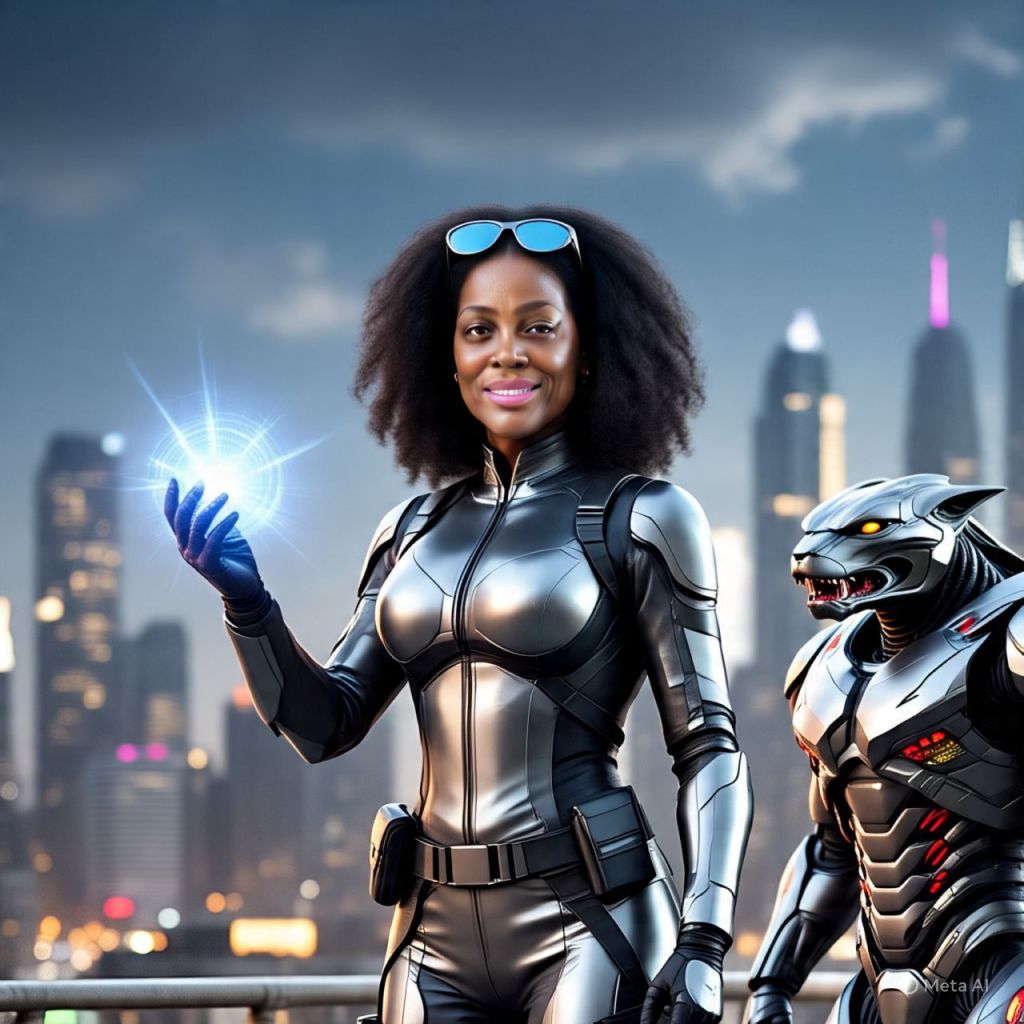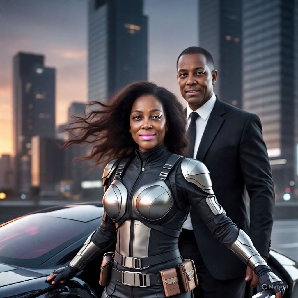 🎥 [Camera zooms in on Antoinette stepping out of a futuristic blacked-out hover vehicle, hair flowing, skin glowing, all eyes on her.]