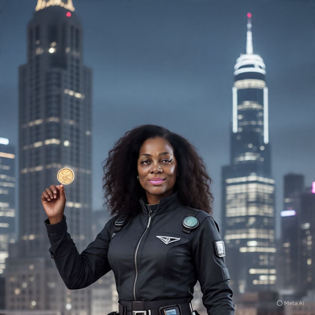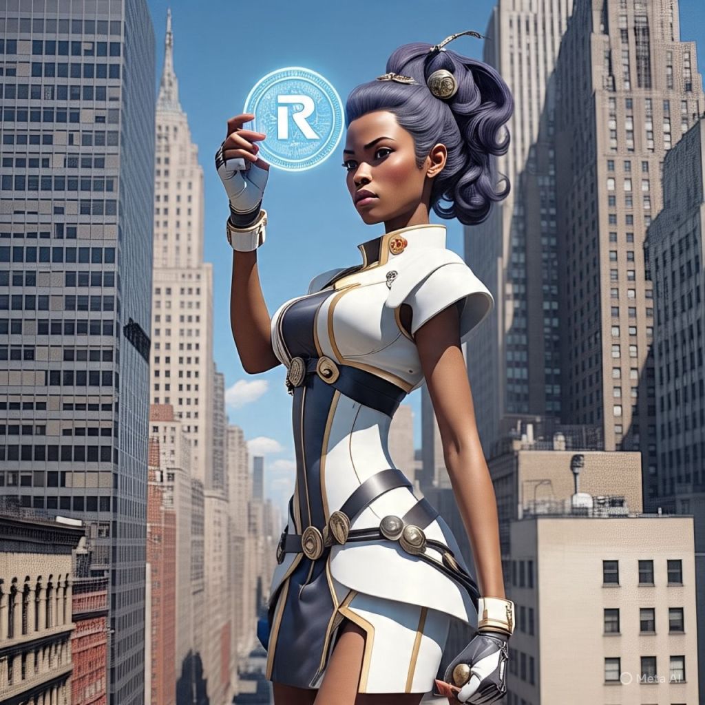 [Back to Antoinette, standing on a rooftop with the whole city skyline behind her. She raises RCCOIN hologram in one hand, Viper stands beside her like a king.]