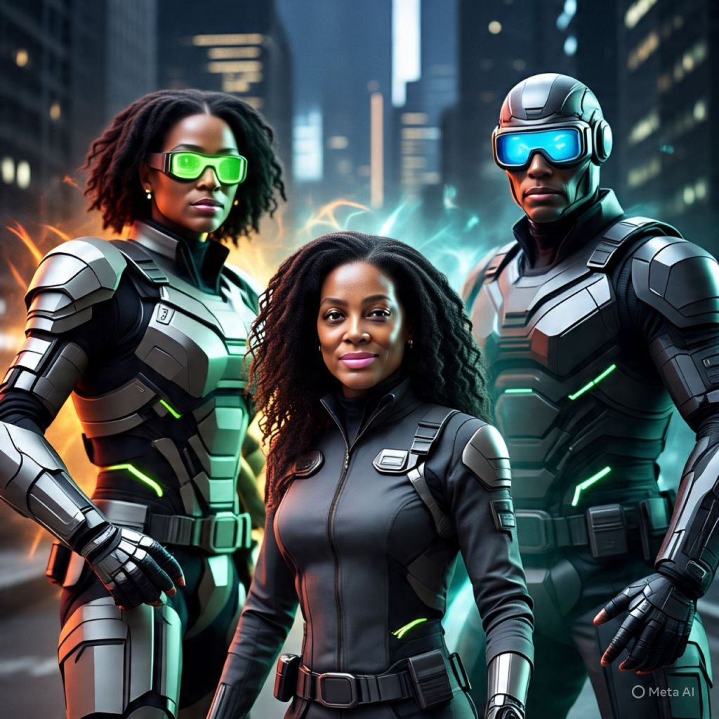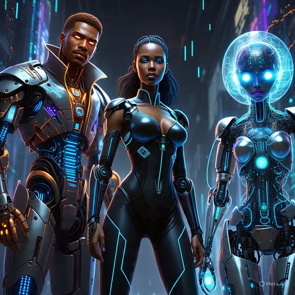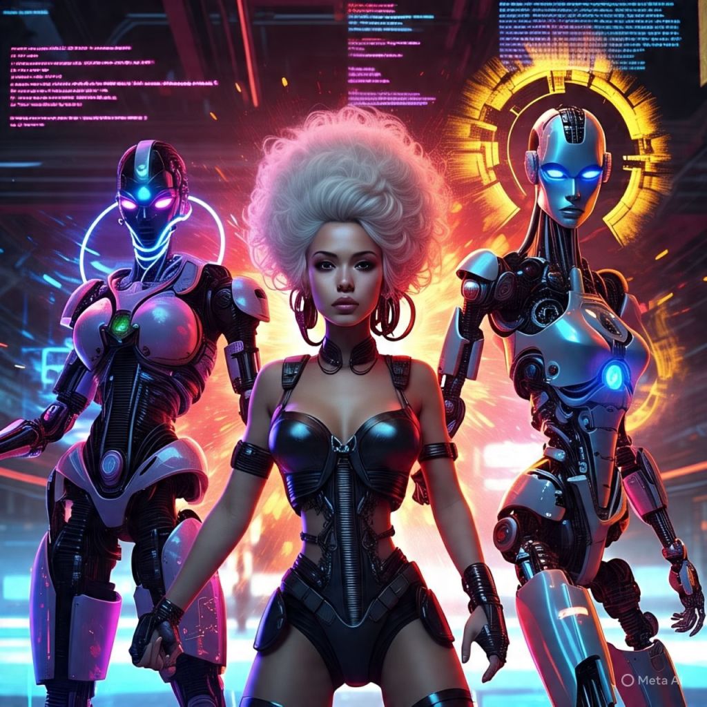 🎥 [Darkness. Flickers of code swirl like fireflies. Slowly, a digital heartbeat pulses. Then: BOOM! A massive data explosion reveals Antoinette standing between Lyrical Viper, Megan 2.0, and Sonny from I, Robot. All three glowing, each with unique battle aura.]