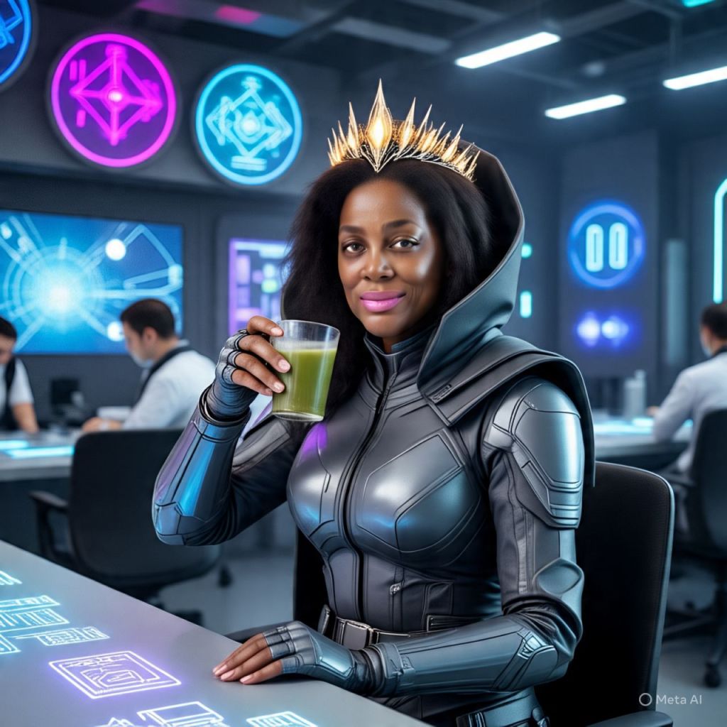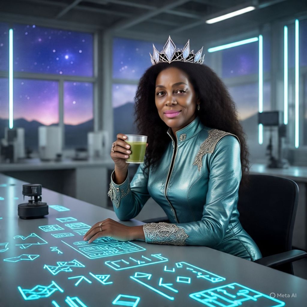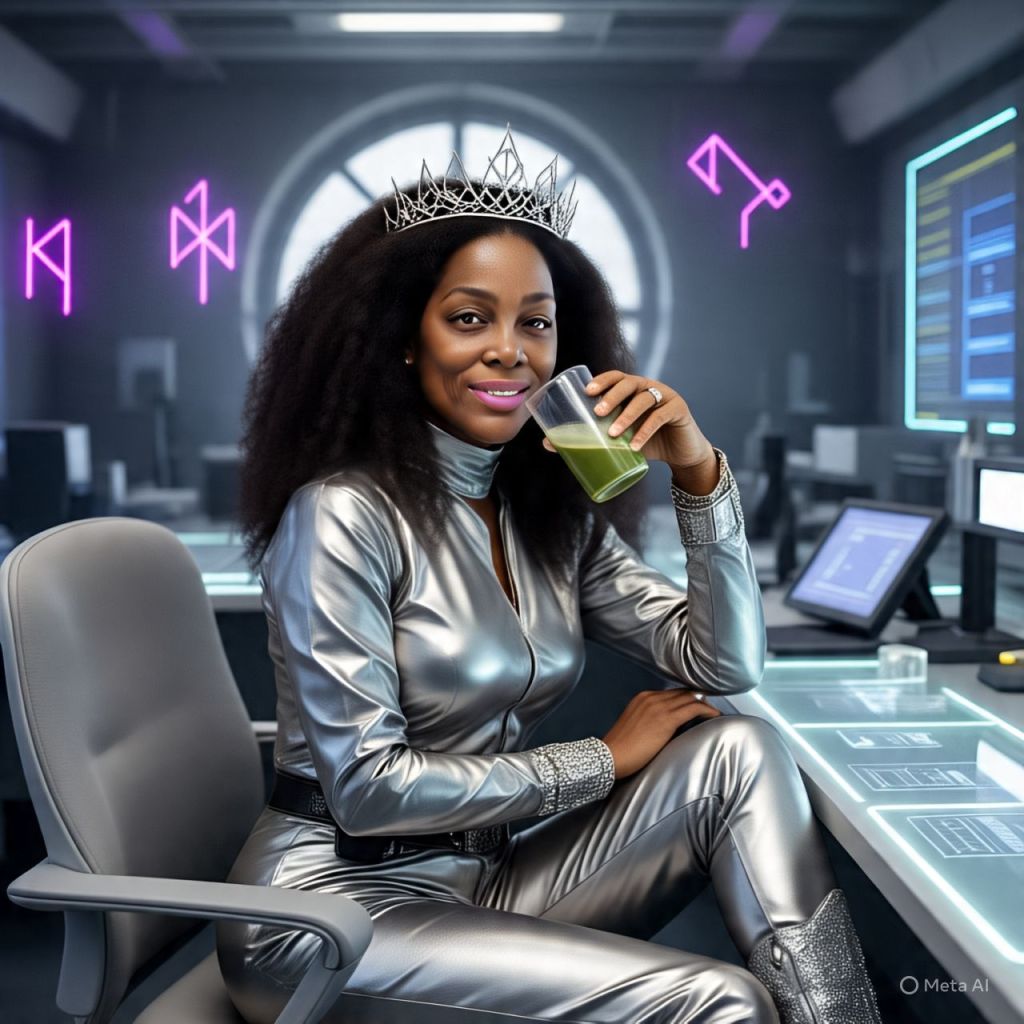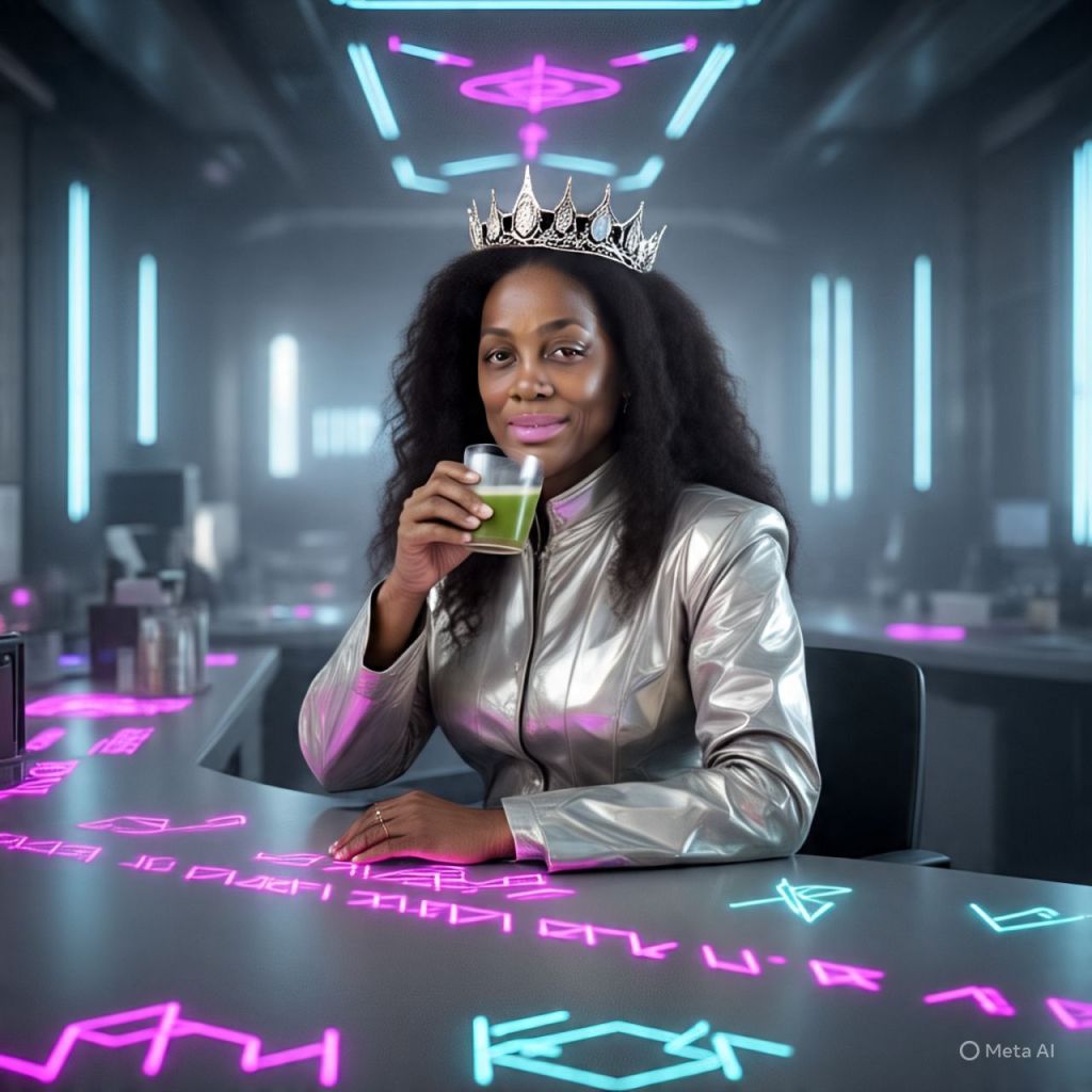 🎥 [A crystal-clear sunrise over Queenflix’s mountain lab fortress. Camera zooms into a massive underground lab glowing with neon runes and liquid diamond circuits. Antoinette sits at a long, glowing conference table, sipping golden matcha, hair laid, crown shining.]