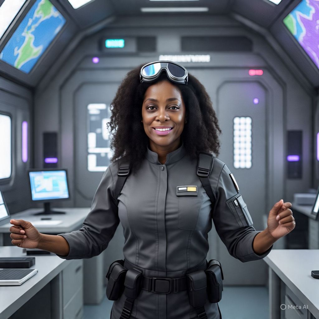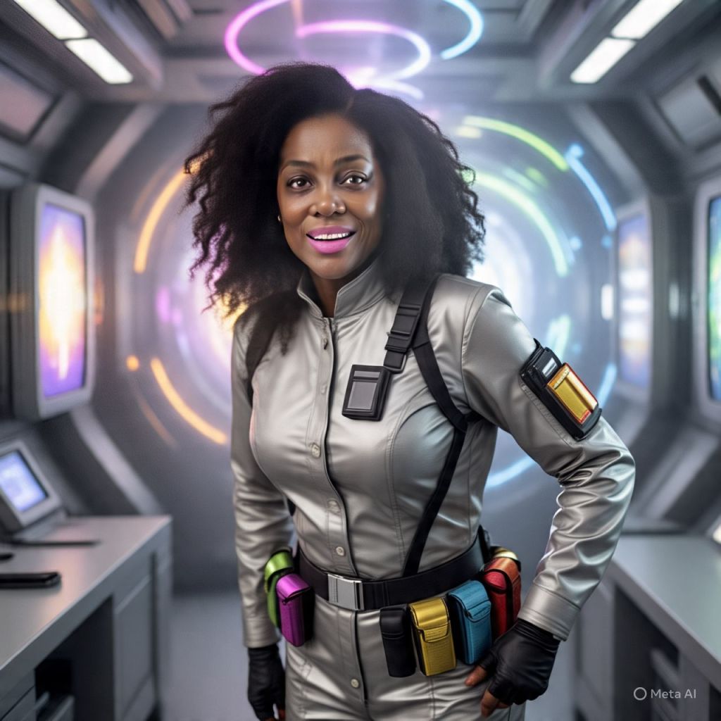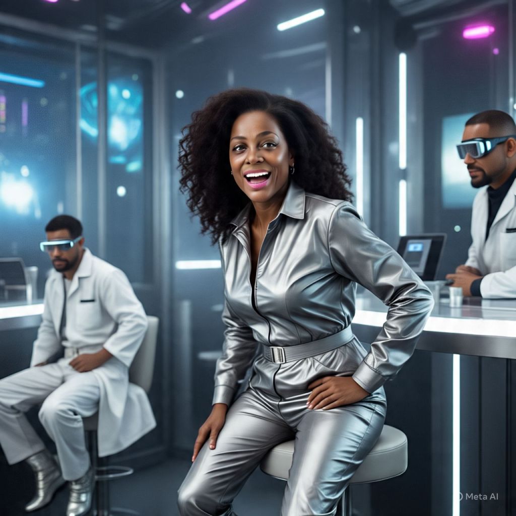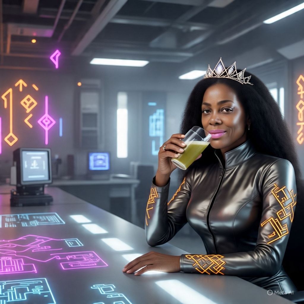 🎥 [A crystal-clear sunrise over Queenflix’s mountain lab fortress. Camera zooms into a massive underground lab glowing with neon runes and liquid diamond circuits. Antoinette sits at a long, glowing conference table, sipping golden matcha, hair laid, crown shining.]