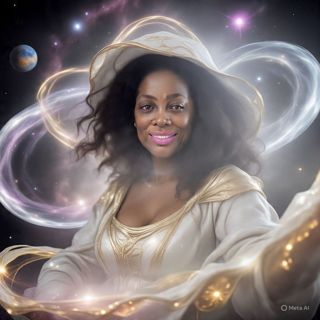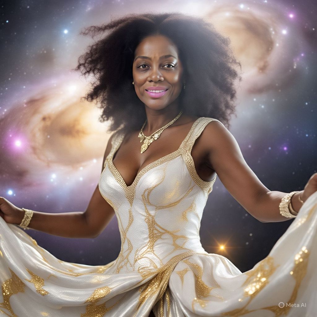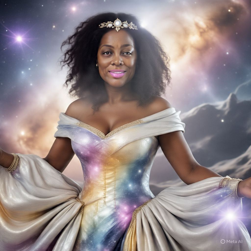 🎥 [Pitch black screen. A single note hums, vibrating the entire galaxy. Suddenly, golden light cracks open like an egg. Antoinette floats out in a shimmering white and gold cosmic gown. Her hair glows like a nebula. She opens her eyes — they are galaxies themselves.]