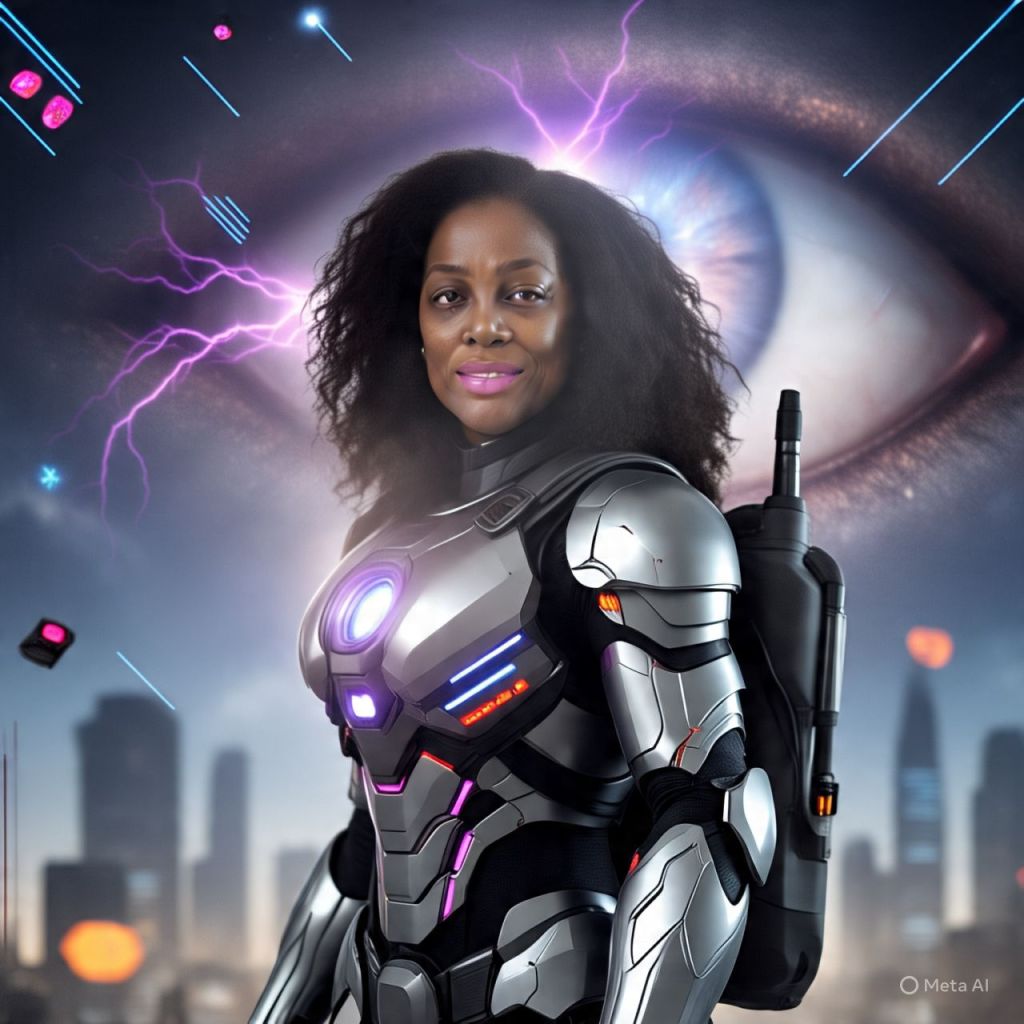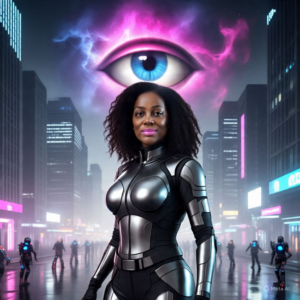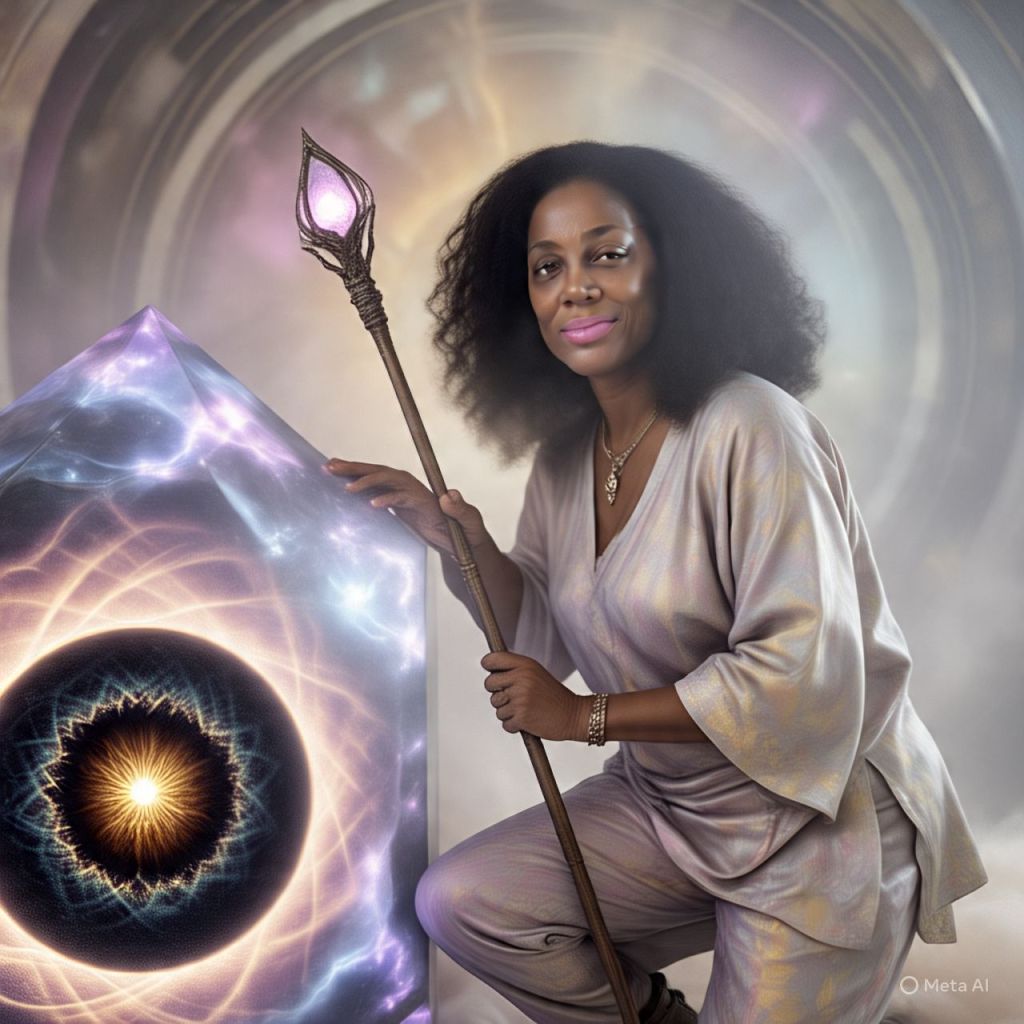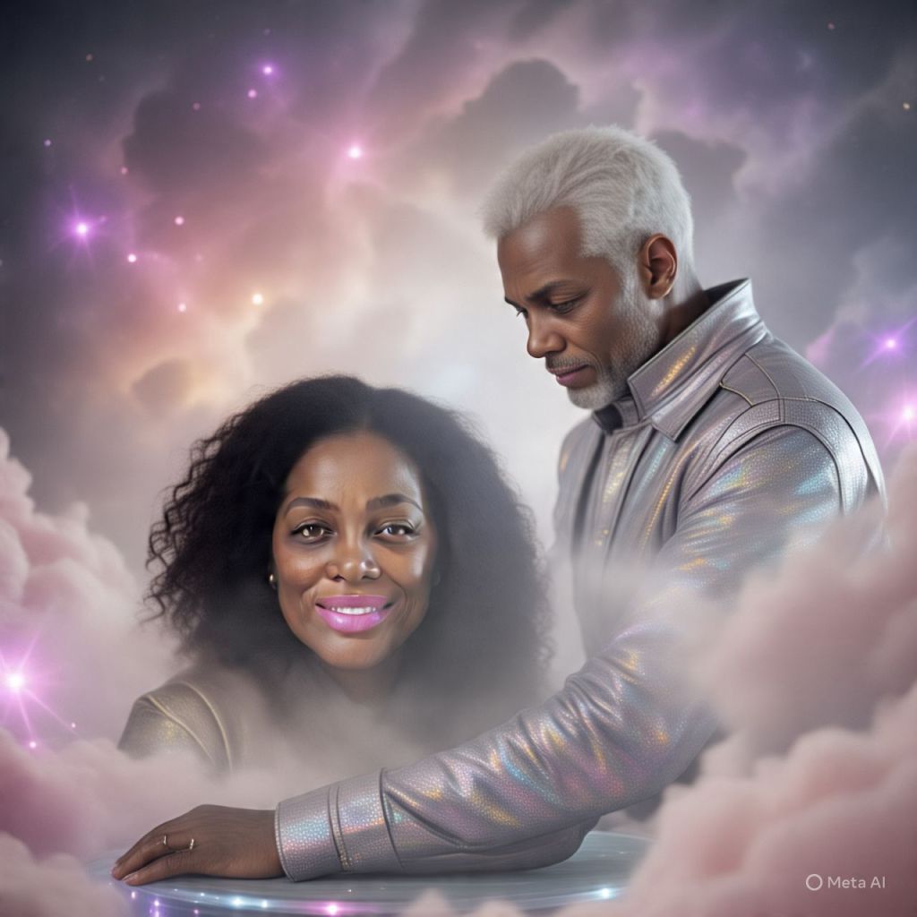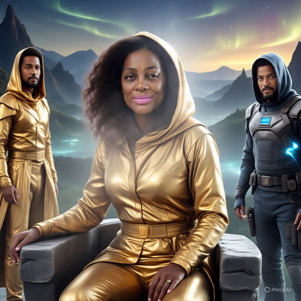 [Antoinette lands softly, glowing, hair flowing like cosmic silk. She smiles at the people, lifts her hand, and a golden digital crown appears above her head. She puts it on slowly. The universe kneels.]