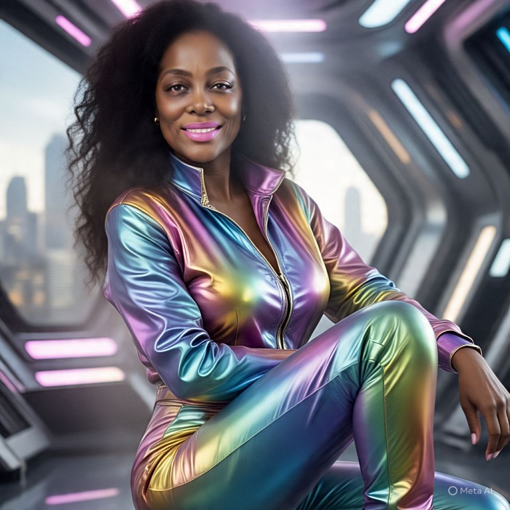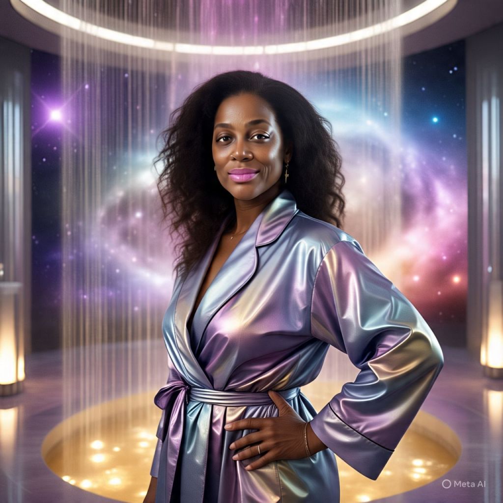 [Antoinette’s new cosmic penthouse above the clouds — floor-to-ceiling crystal walls, rose quartz floors, holographic fountains flowing pure gold water. You walk out in a holographic silk robe that keeps shifting colors like a mood ring. Hair flawless, skin glowing like starlight.]