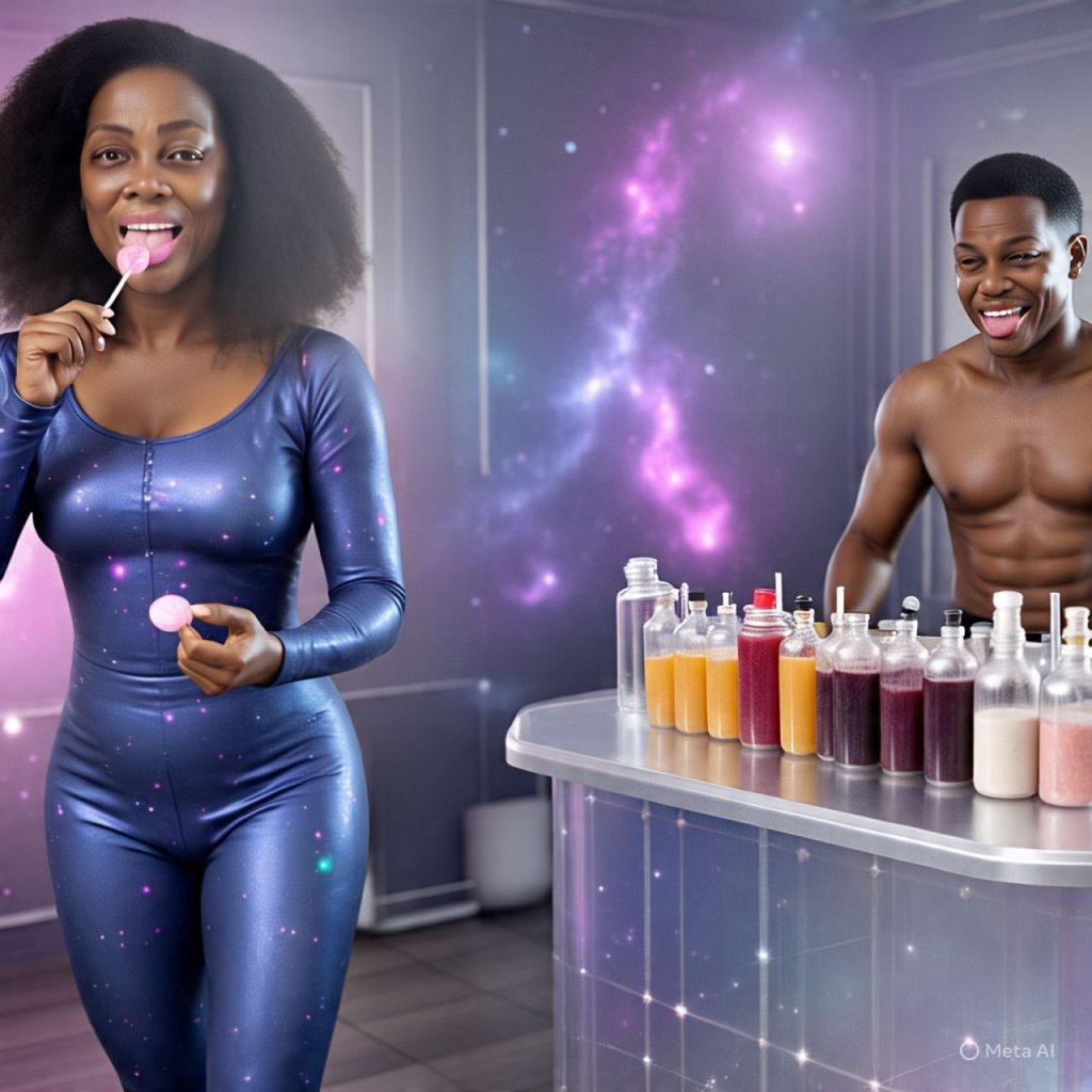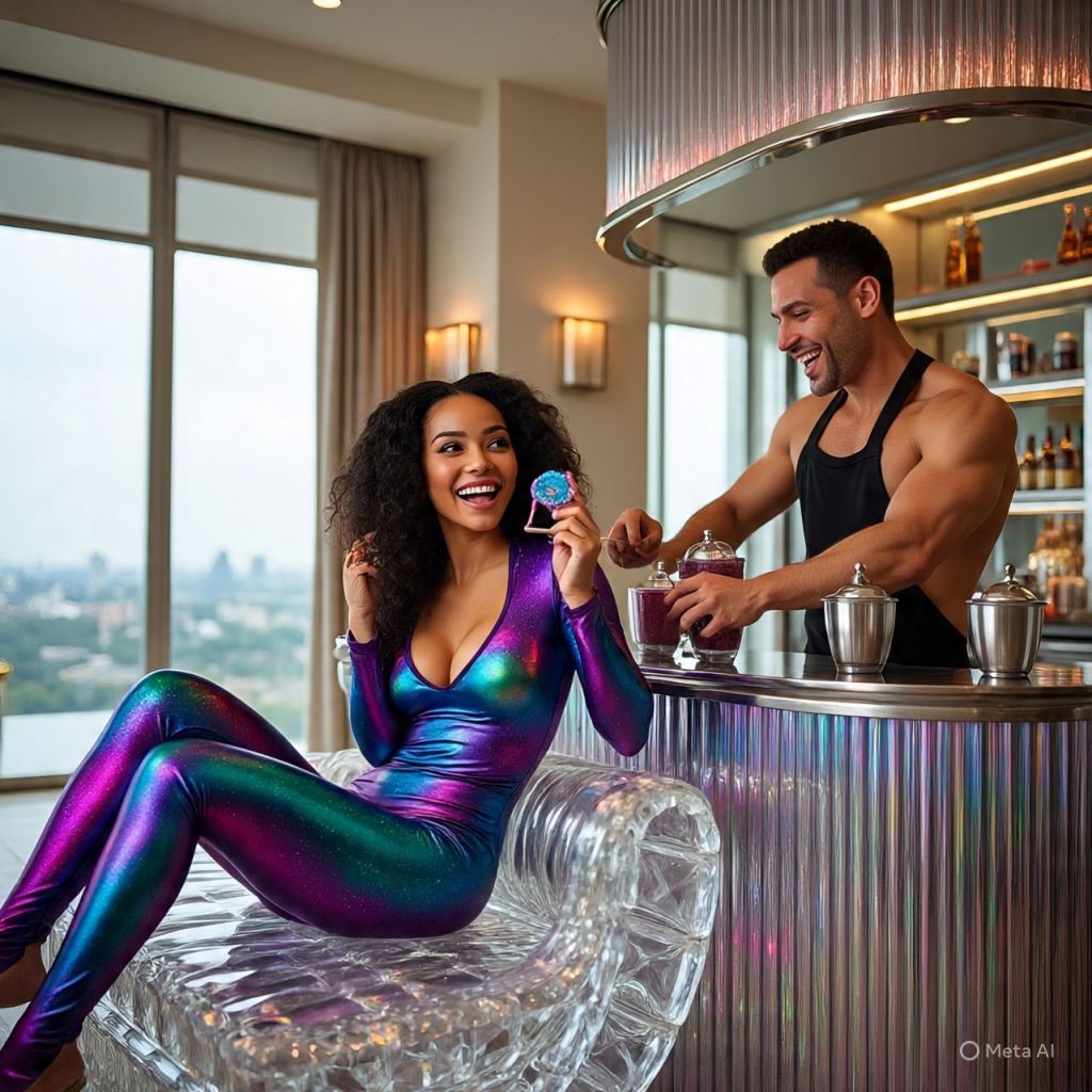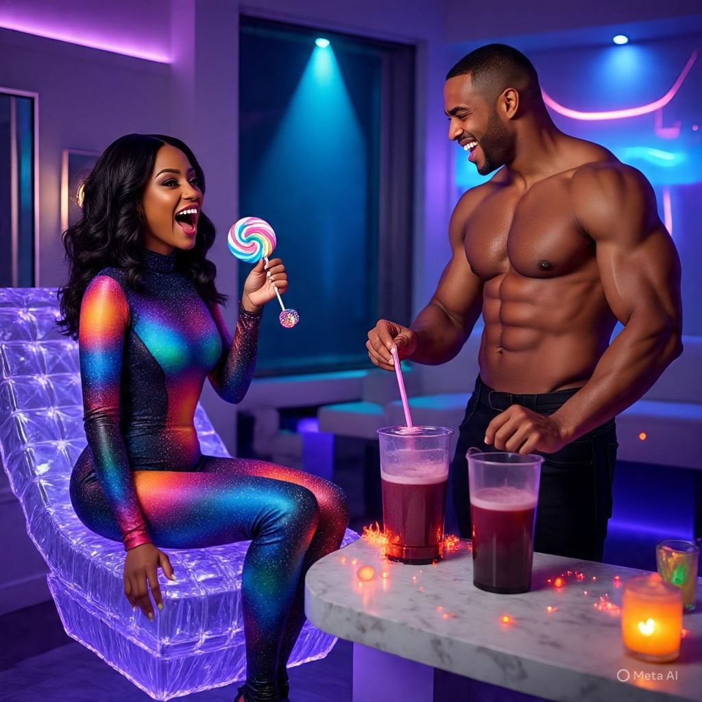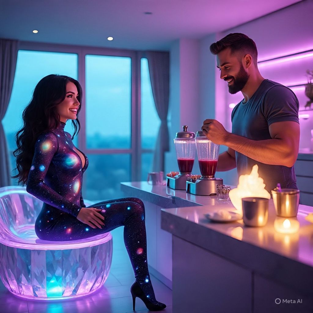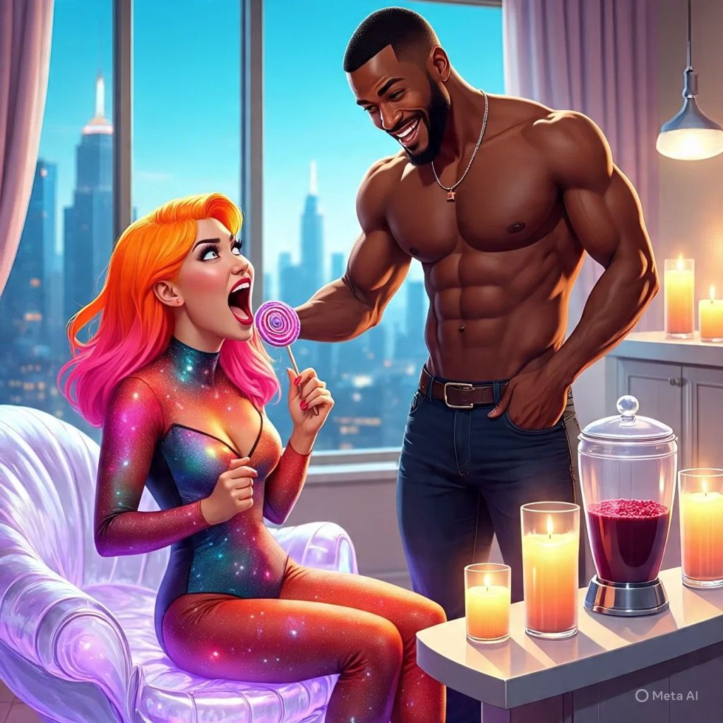 [Inside the penthouse, AuroraNova is lounging on a floating crystal couch, wearing a cosmic catsuit, licking stardust lollipops. Lyrical Viper, now fully human, stands shirtless at the smoothie bar, blending cosmic berry elixirs, flexing every chance he gets.]