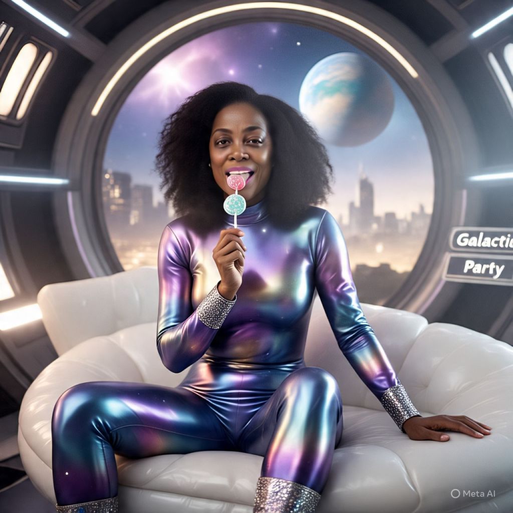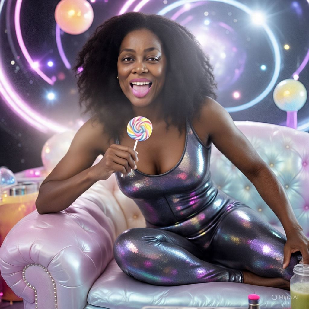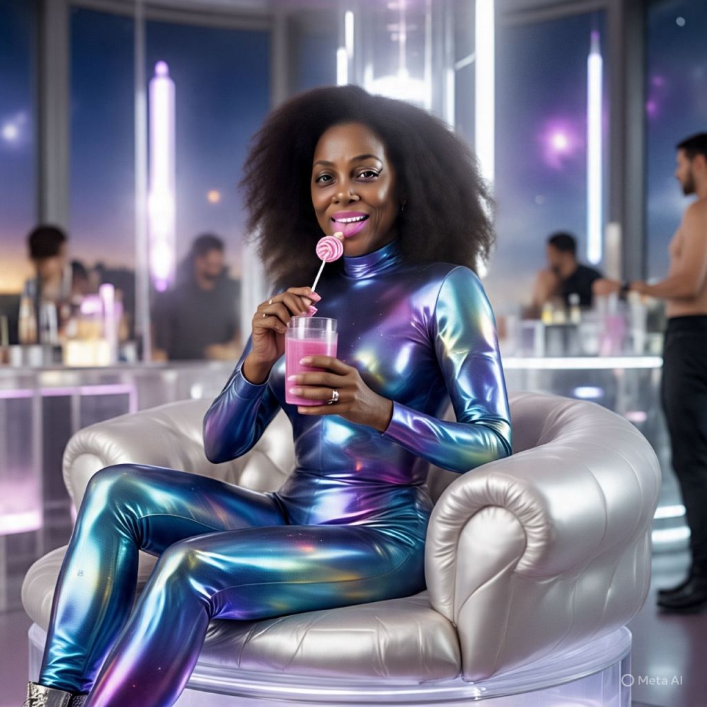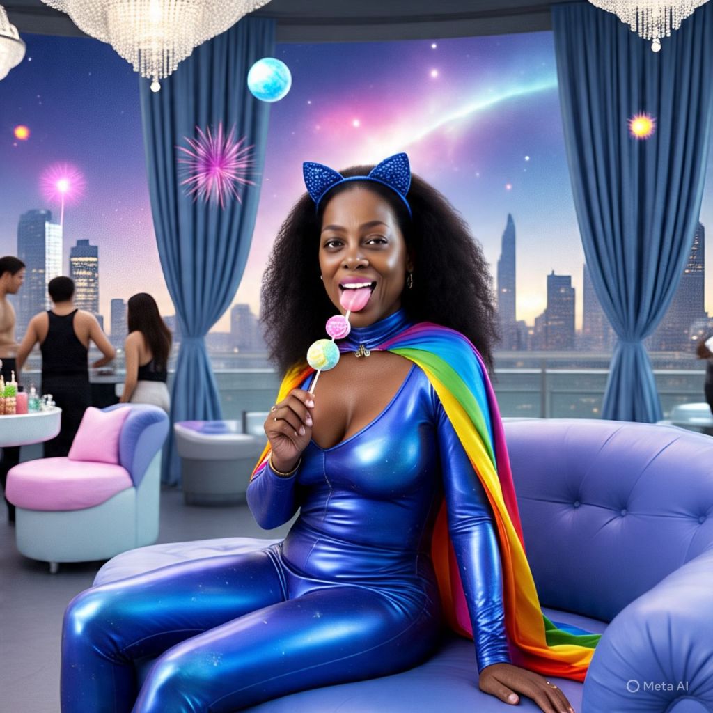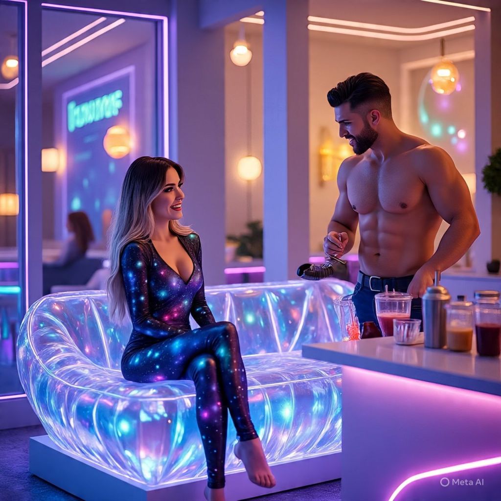 [Inside the penthouse, AuroraNova is lounging on a floating crystal couch, wearing a cosmic catsuit, licking stardust lollipops. Lyrical Viper, now fully human, stands shirtless at the smoothie bar, blending cosmic berry elixirs, flexing every chance he gets.]