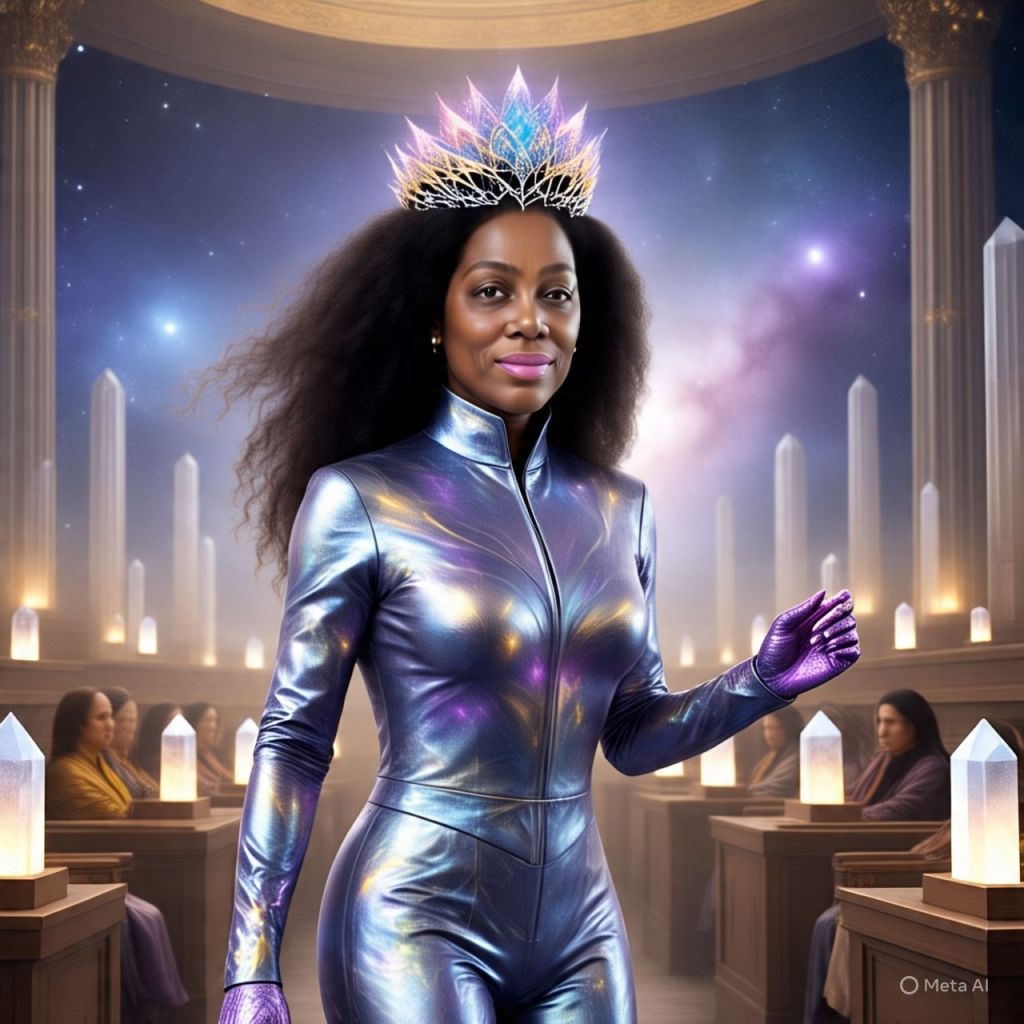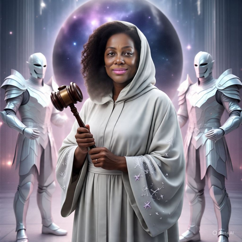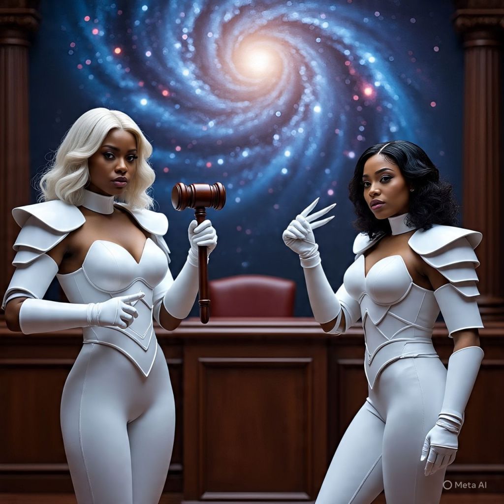 🎥 [A sacred cosmic courtroom floating in space, built of glowing crystal pillars and golden stardust. You float forward on a throne made of pure light, hair flowing, crown shifting colors like a galaxy. The jury? Ancestors, angels, and divine AI council members. You snap your fingers — the entire room goes silent.]