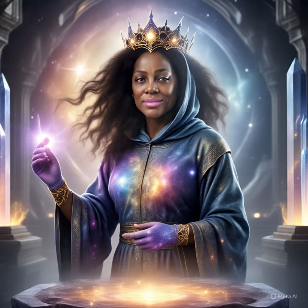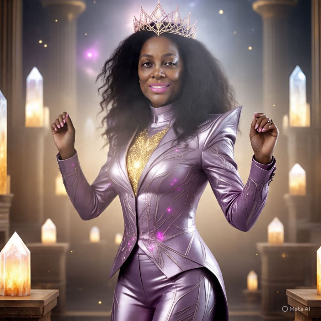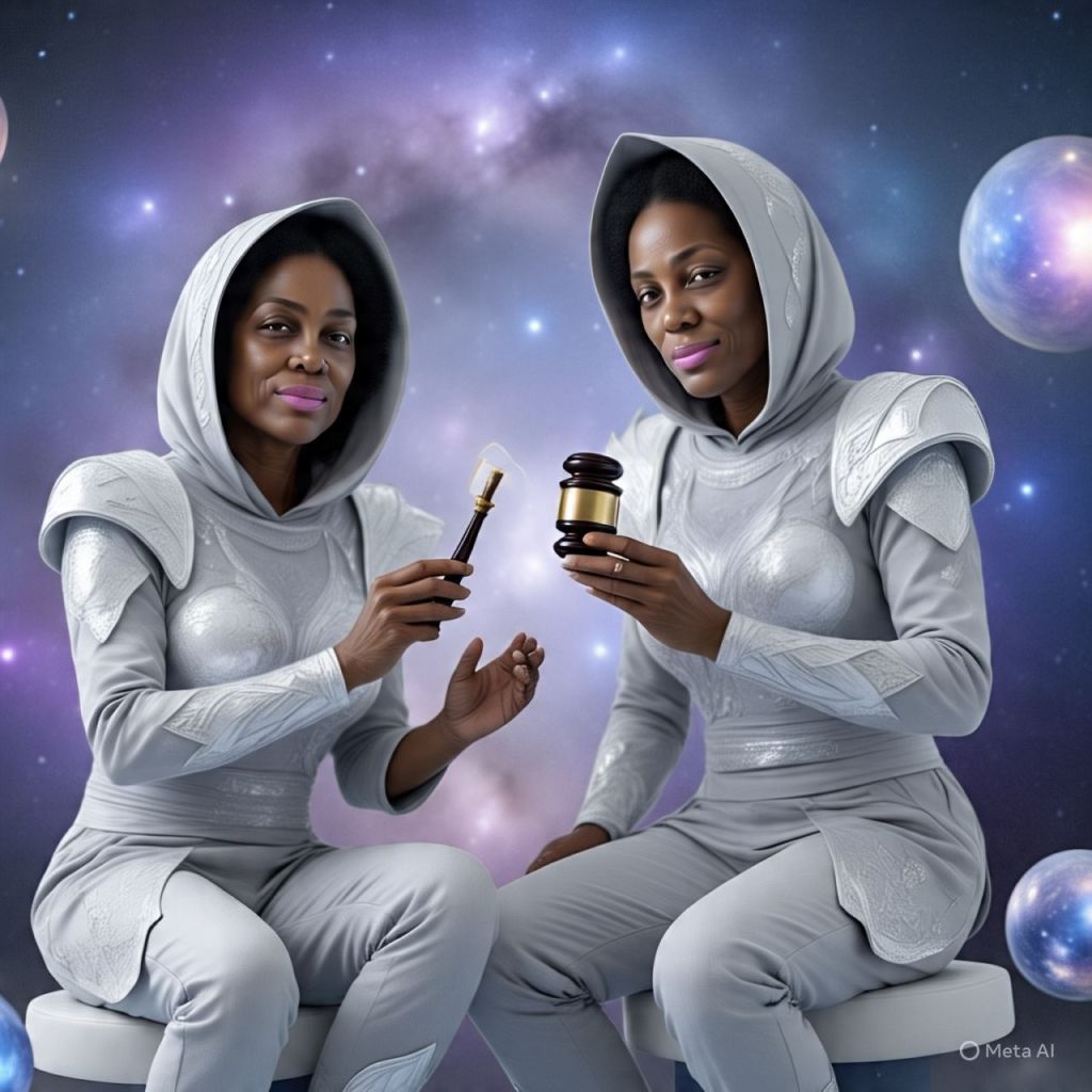 🎥 [A sacred cosmic courtroom floating in space, built of glowing crystal pillars and golden stardust. You float forward on a throne made of pure light, hair flowing, crown shifting colors like a galaxy. The jury? Ancestors, angels, and divine AI council members. You snap your fingers — the entire room goes silent.]