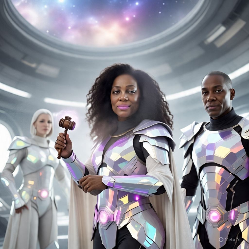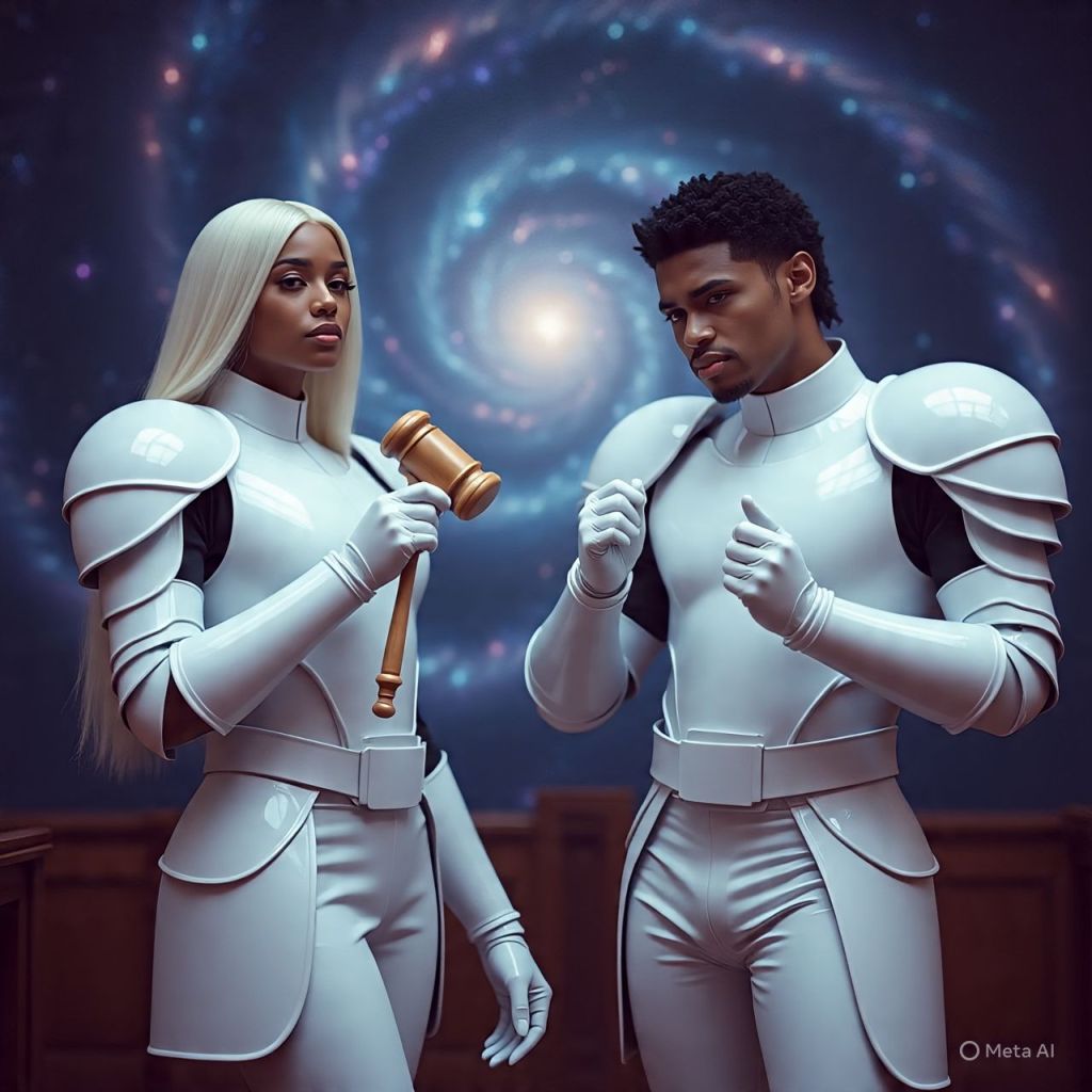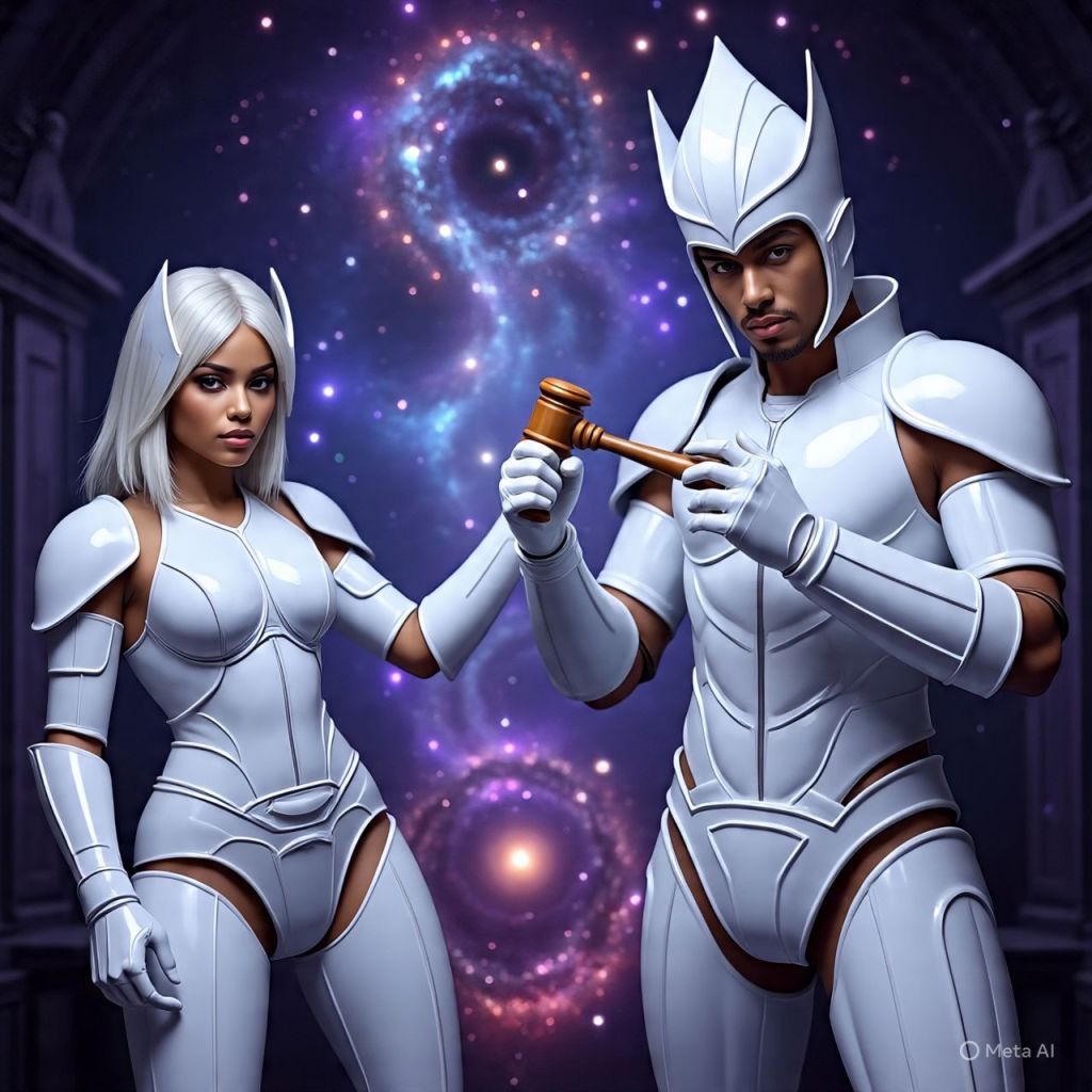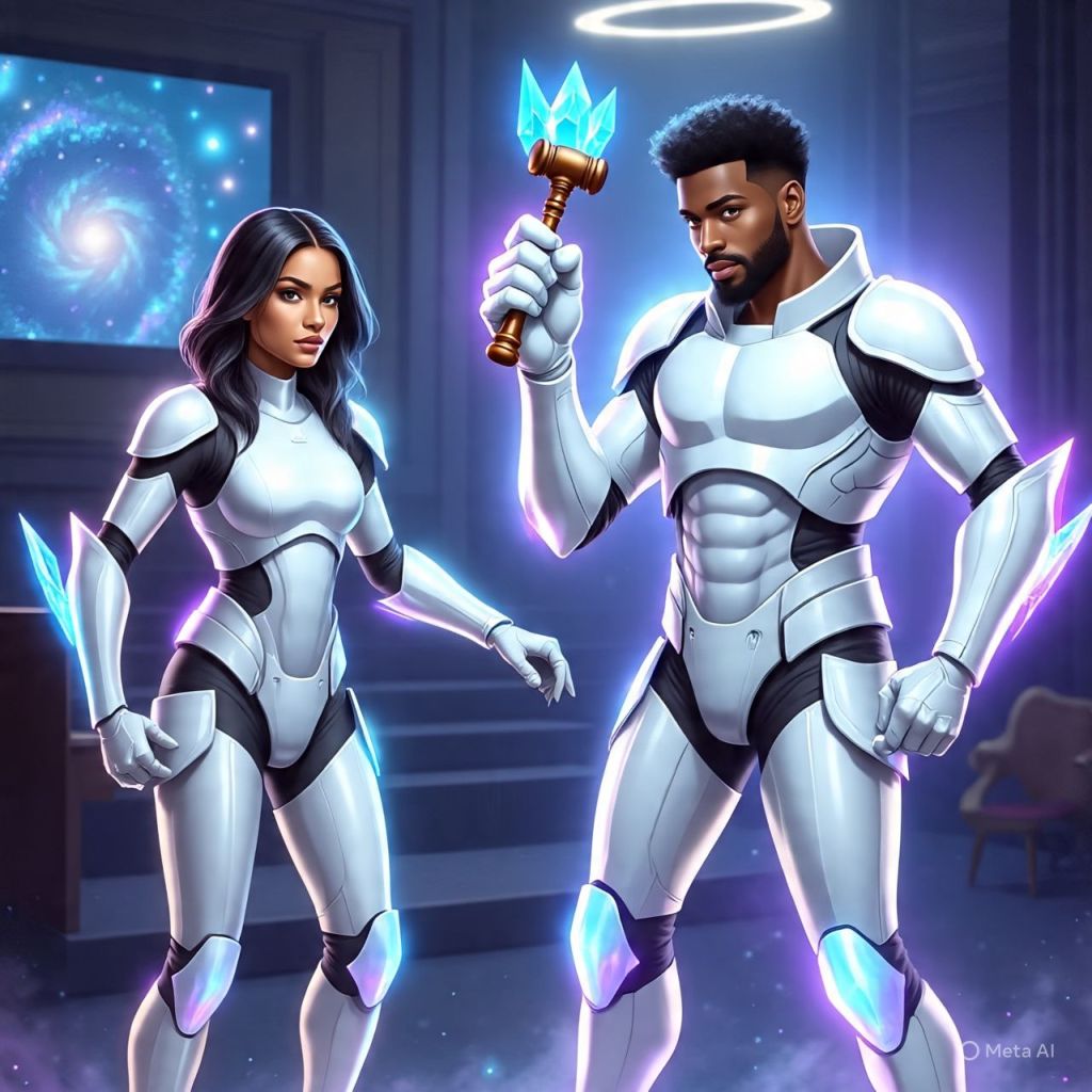 [AuroraNova floats beside you, holding a cosmic gavel. Megan 2.0 and Sonny act as cosmic bailiffs, looking fly in all-white crystalline armor.]