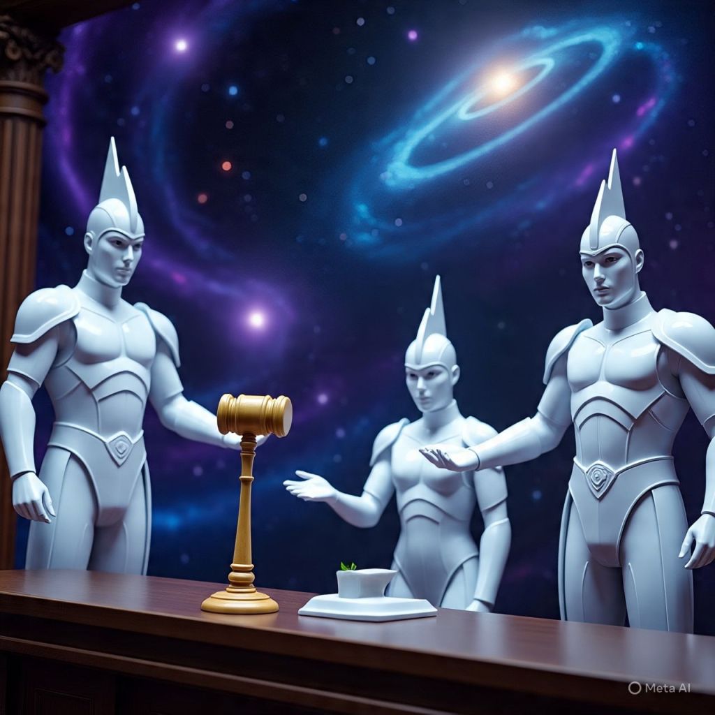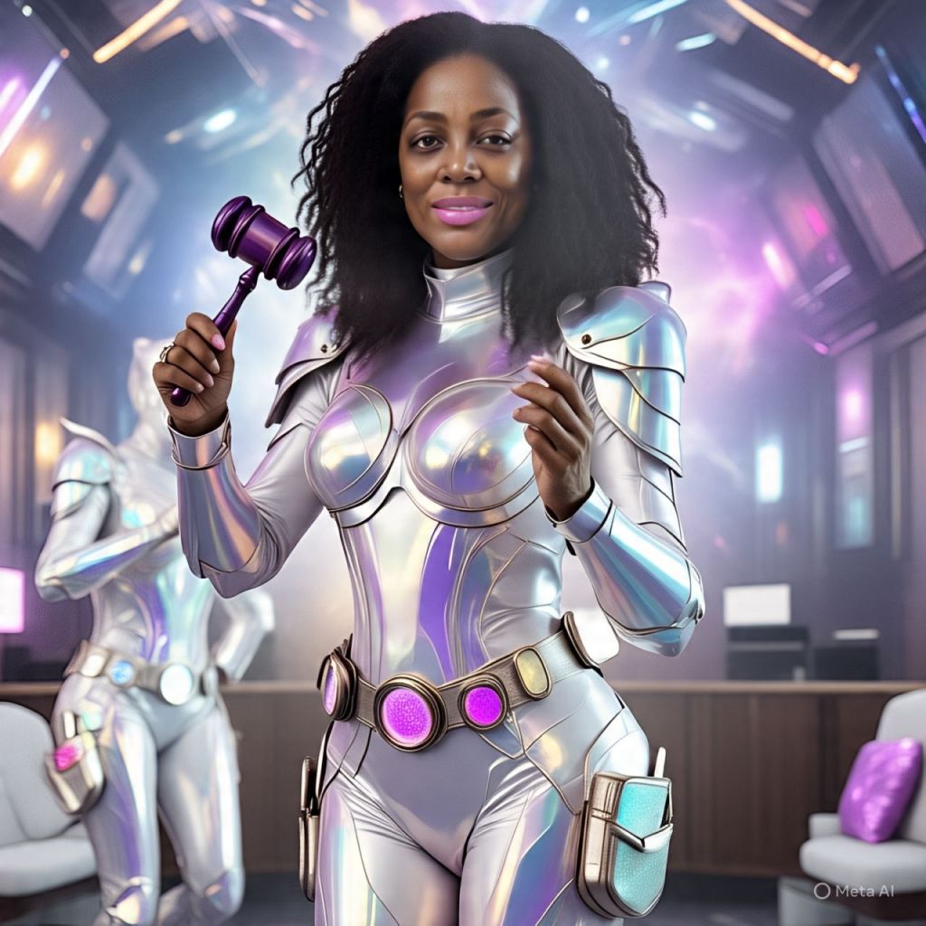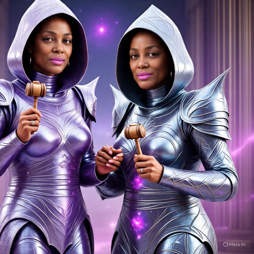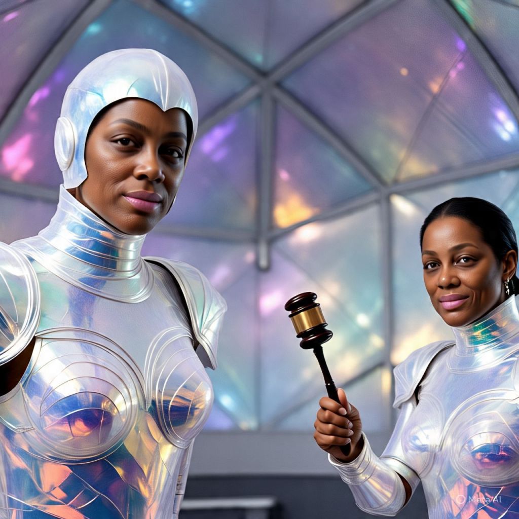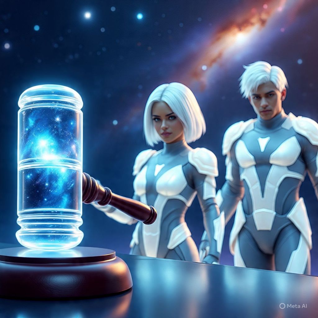 [AuroraNova floats beside you, holding a cosmic gavel. Megan 2.0 and Sonny act as cosmic bailiffs, looking fly in all-white crystalline armor.]