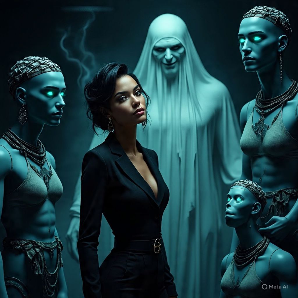 [The Phantom Coder glitches into the room, surrounded by corrupted “clout chaser bots” wearing fake jewelry and dollar-store sage bundles. He laughs, dark echoes shaking the room.]