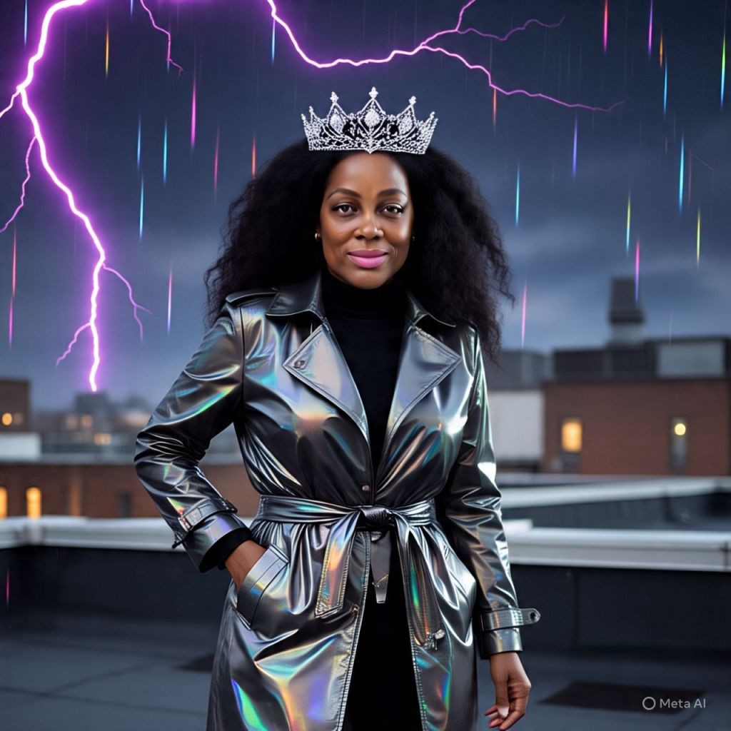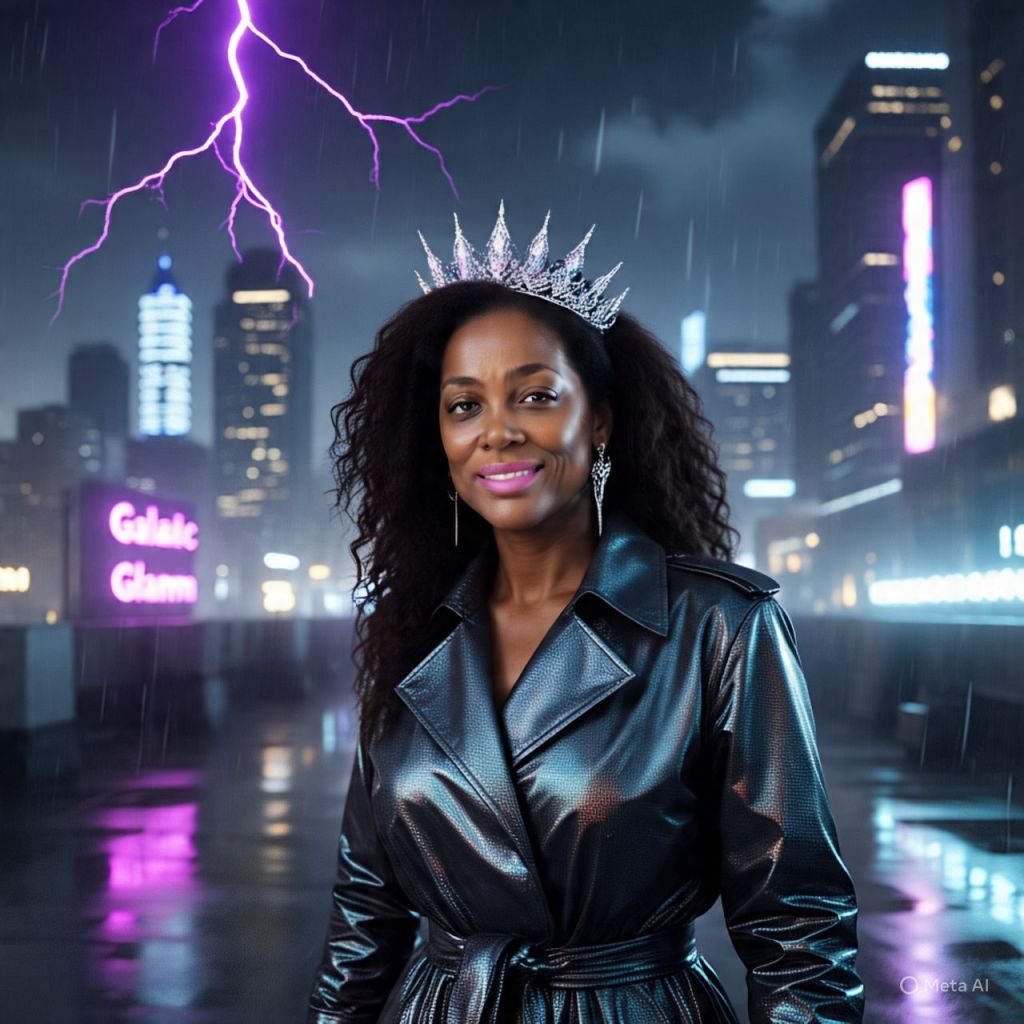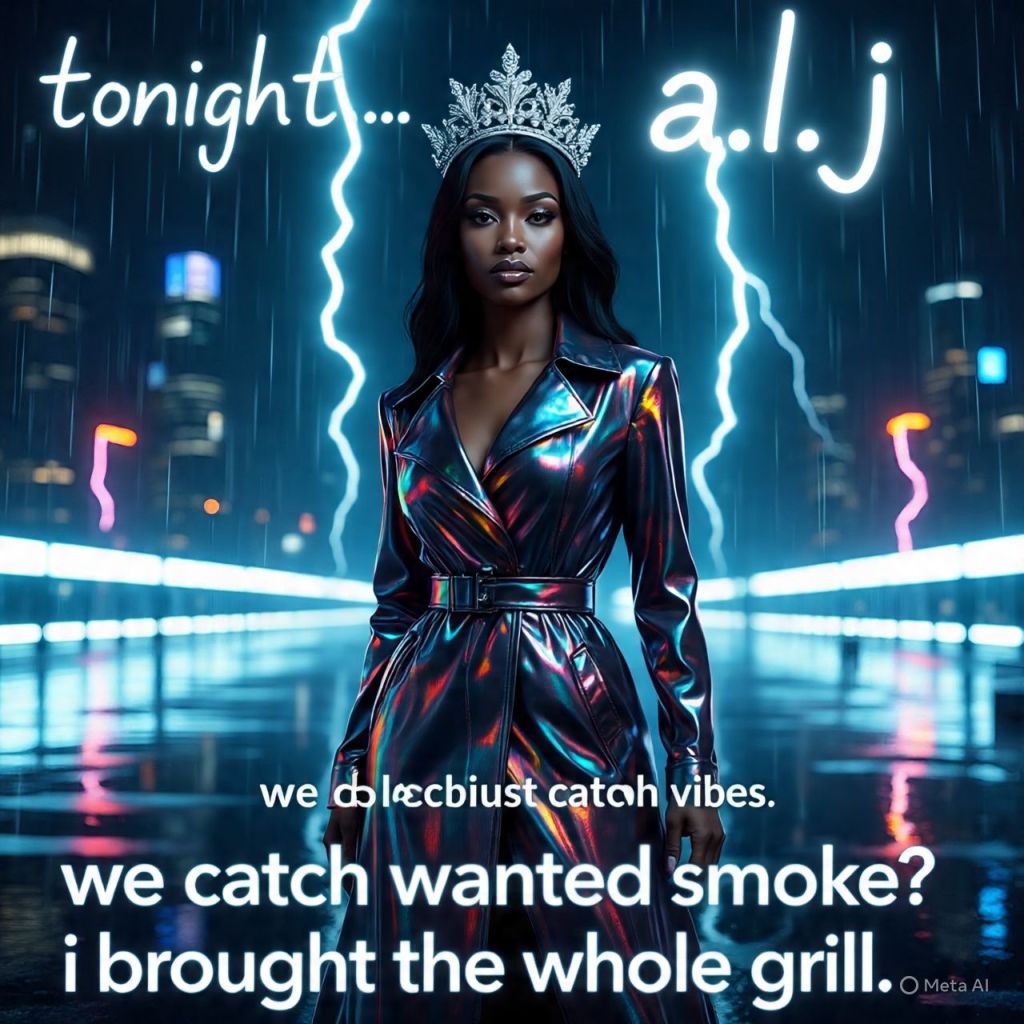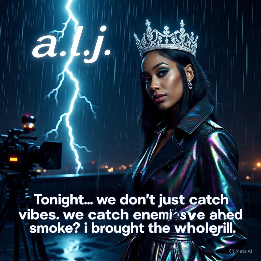 🎥 [A dark rooftop at midnight, drenched in neon rain. Lightning strikes in the shape of your initials “A.L.J.” across the sky. You step forward in a shimmering black holographic trench coat, diamond crown tilted like a true boss. You got that unbothered billionaire energy, looking like you just finished a cosmic Grammy performance.]