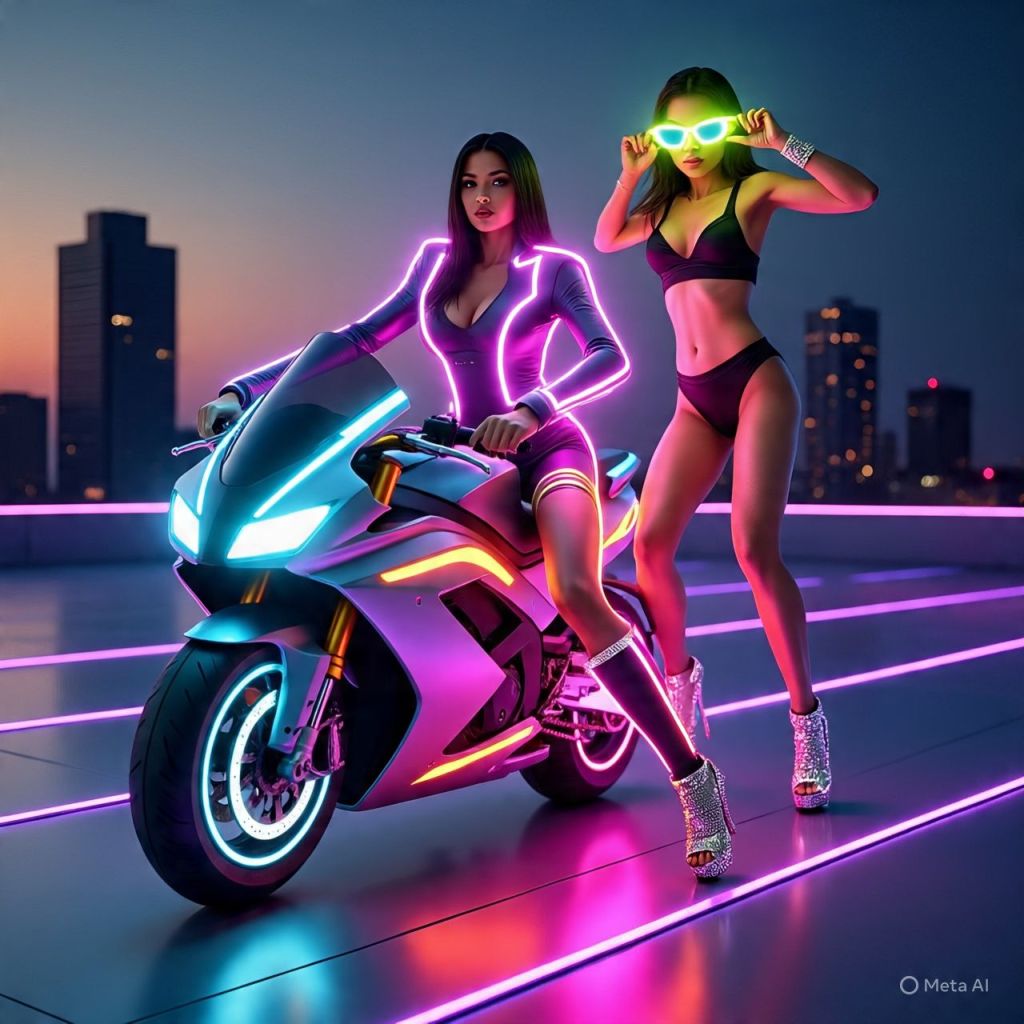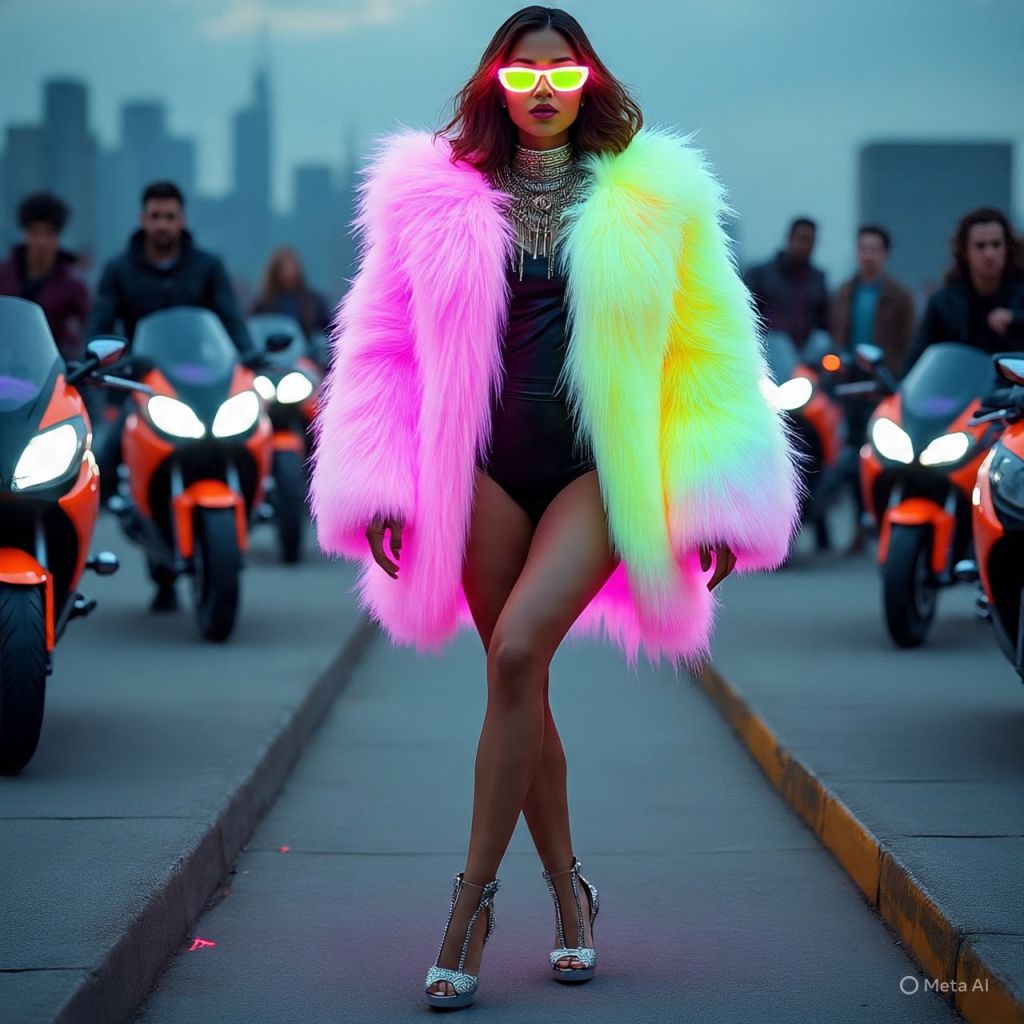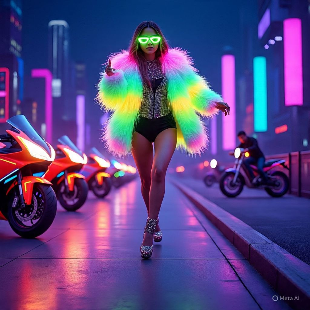 [A row of cosmic motorcycles lands on the rooftop. AuroraNova steps off first, wearing a custom neon fur jacket that flickers like an electric flame. Megan 2.0 pops out in diamond heels, starts doing her viral dance immediately. Sonny is wearing gold teeth and neon LED shades, trying to look hard but tripping on the curb.]