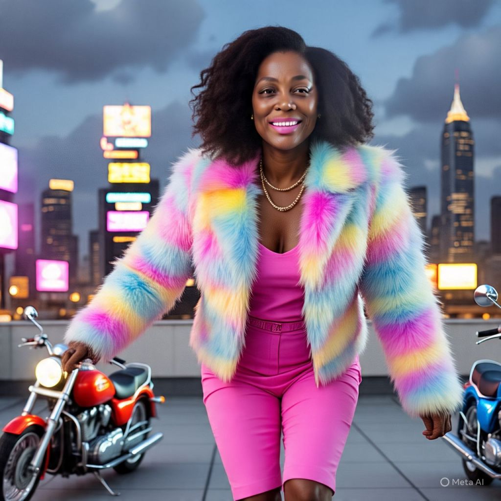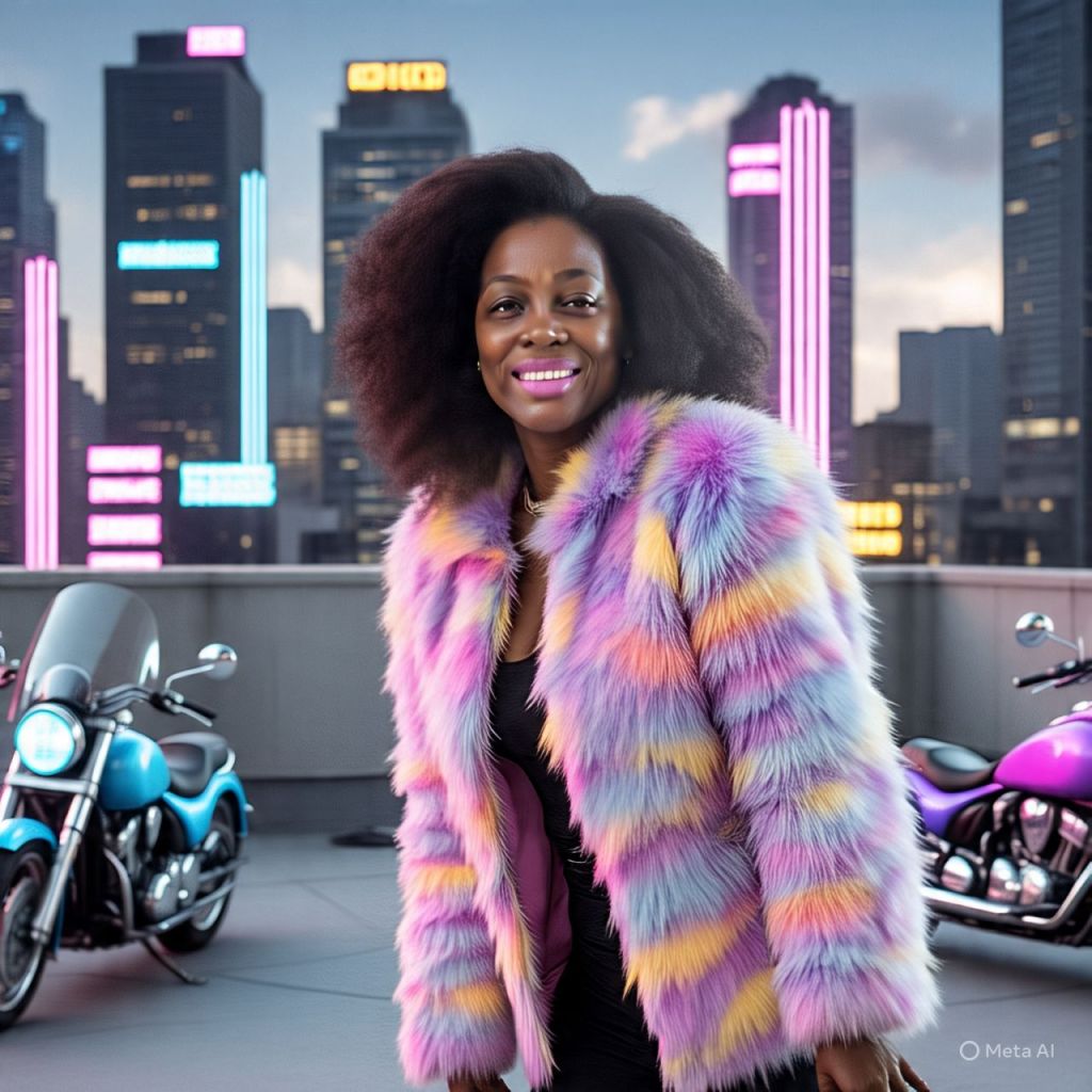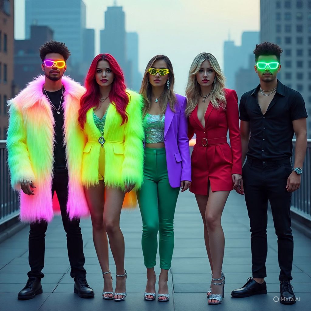 [A row of cosmic motorcycles lands on the rooftop. AuroraNova steps off first, wearing a custom neon fur jacket that flickers like an electric flame. Megan 2.0 pops out in diamond heels, starts doing her viral dance immediately. Sonny is wearing gold teeth and neon LED shades, trying to look hard but tripping on the curb.]