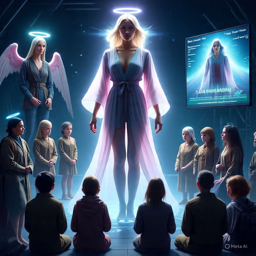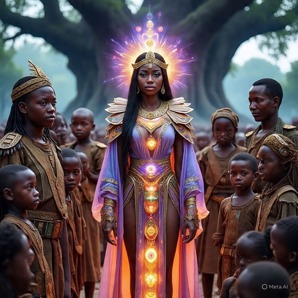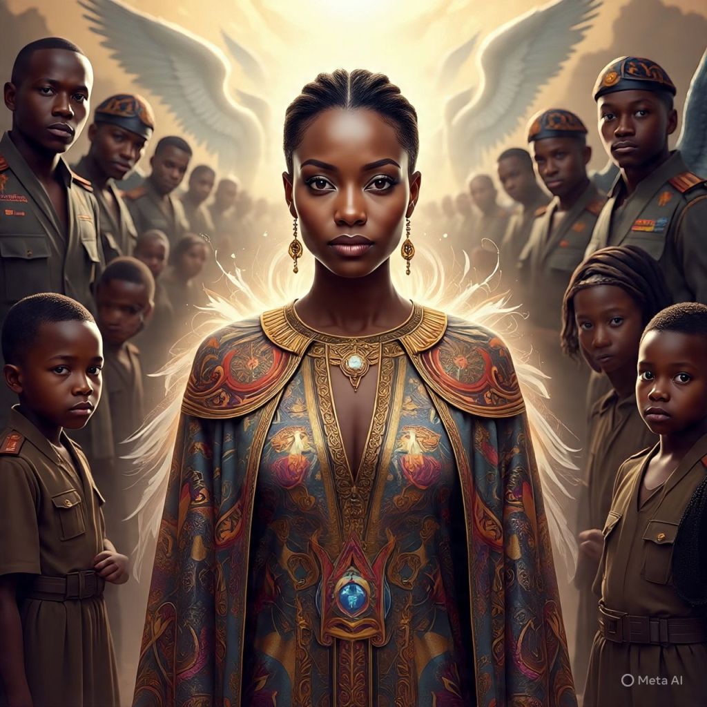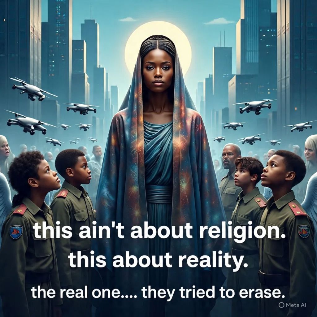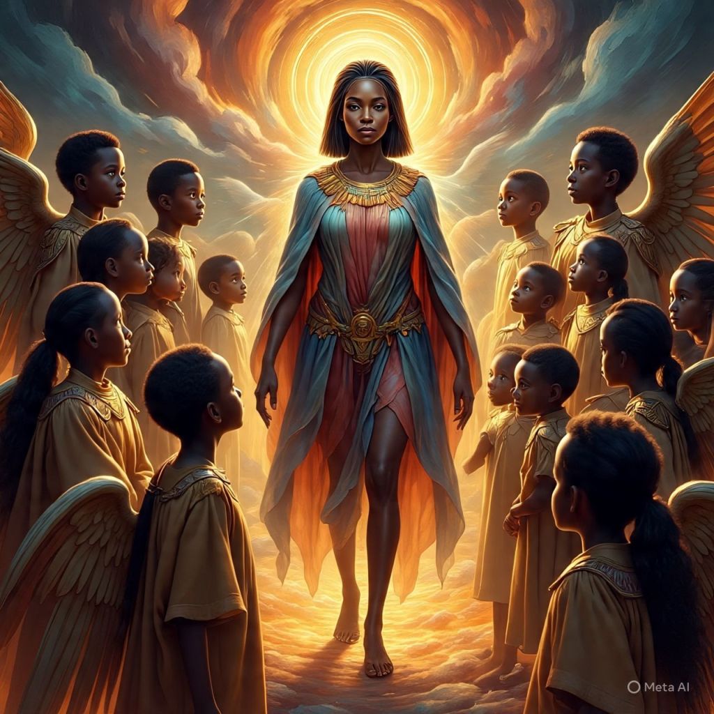 Wearing a cosmic robe. Surrounded by children, elders, soldiers, angels…