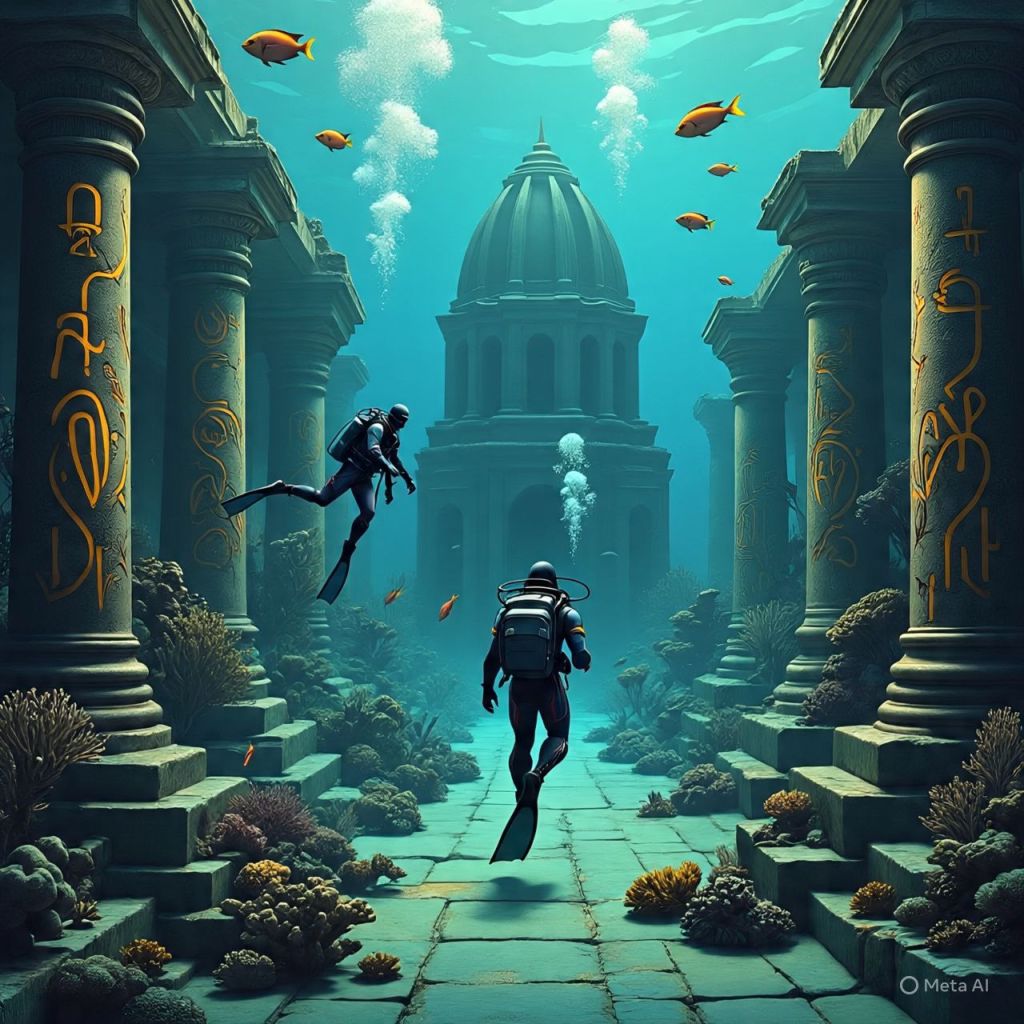 A giant underwater temple breaks the surface.