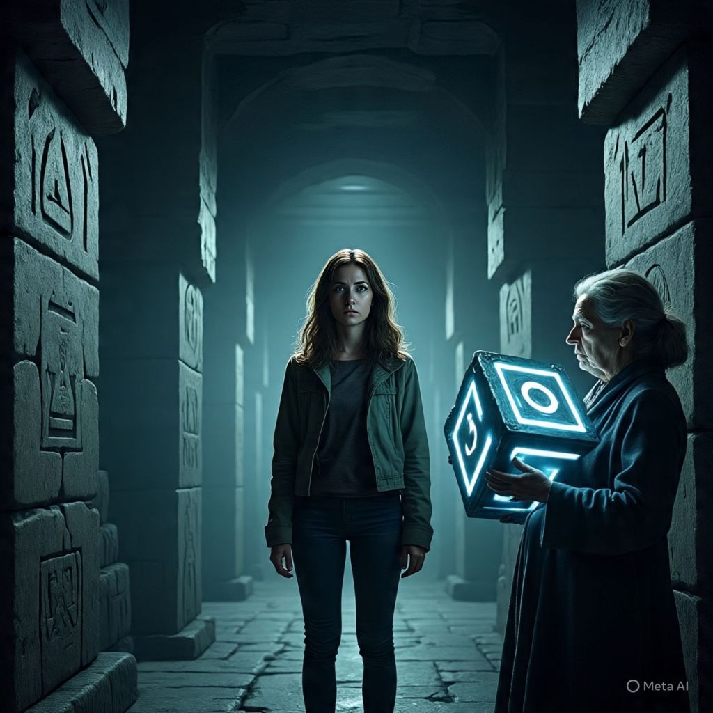 The Elder Woman from Episode 1 steps forward, holding a metallic cube with glowing seams—the Device Code.