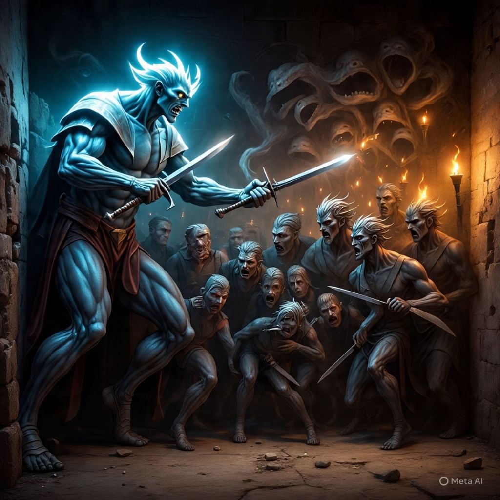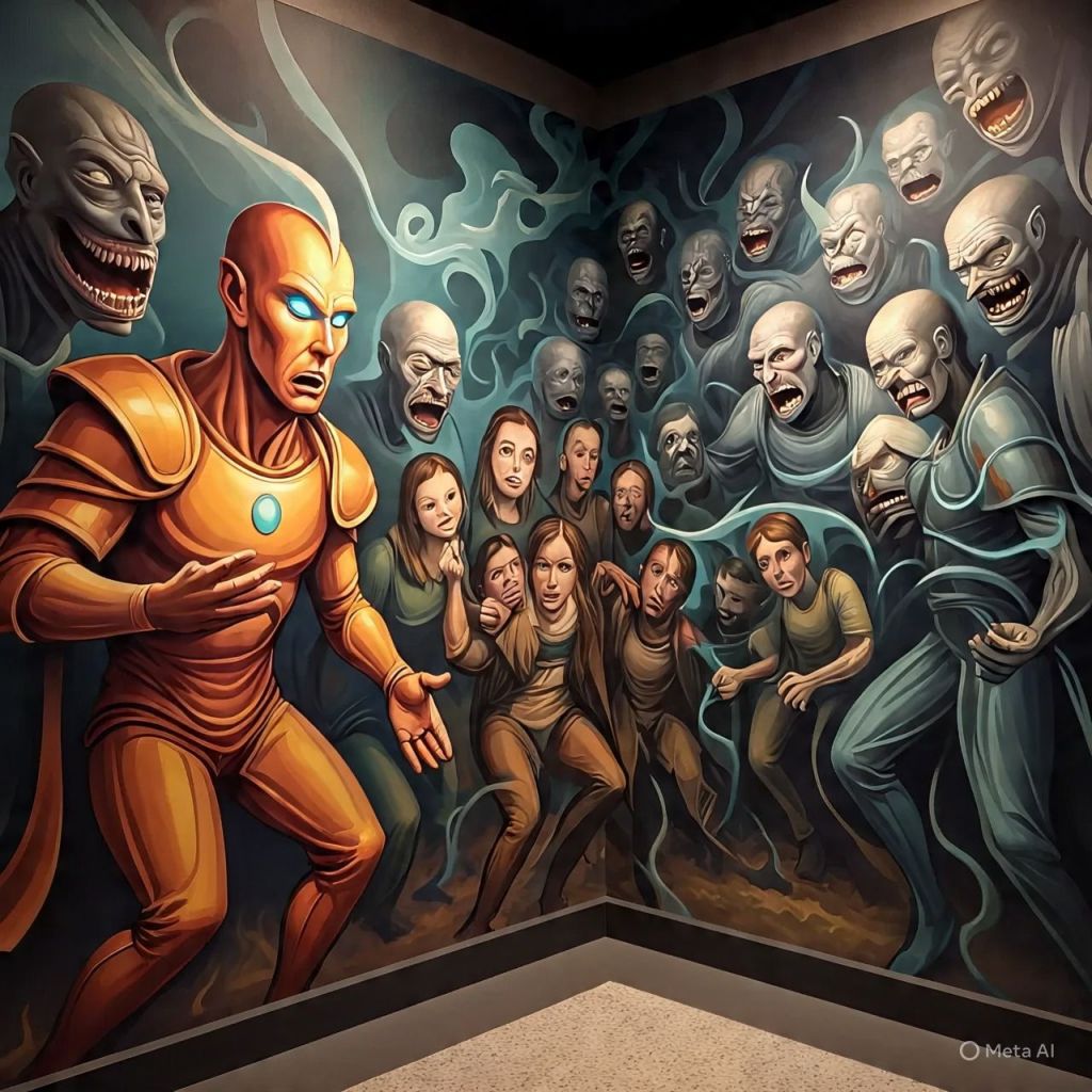 He freezes mid-sentence, eyes turning white, voice layered: