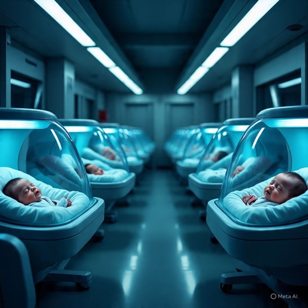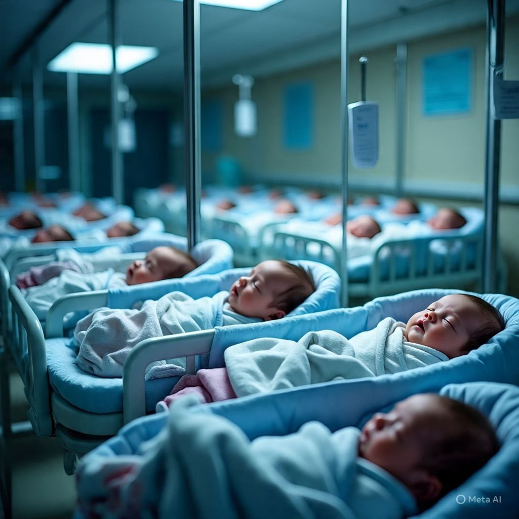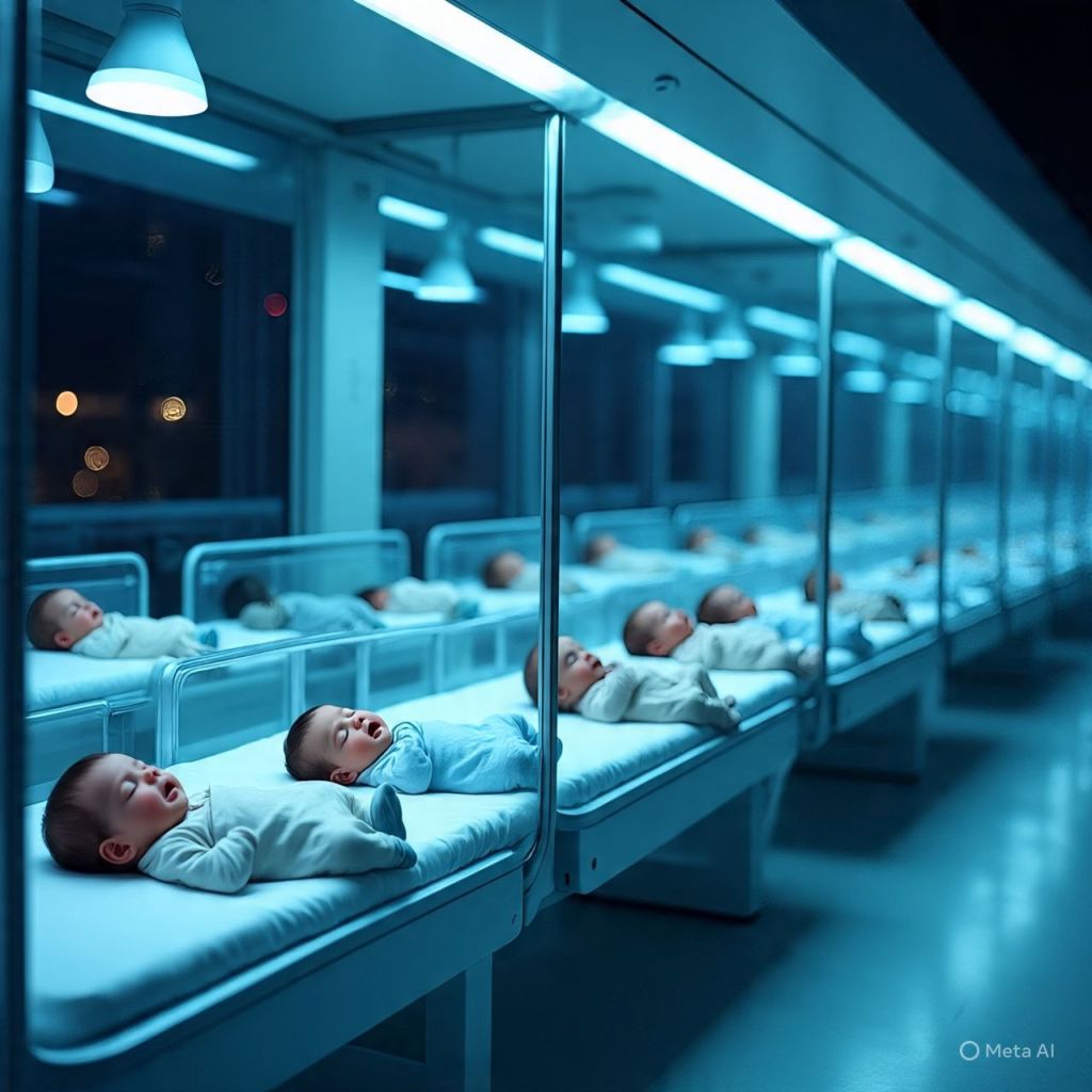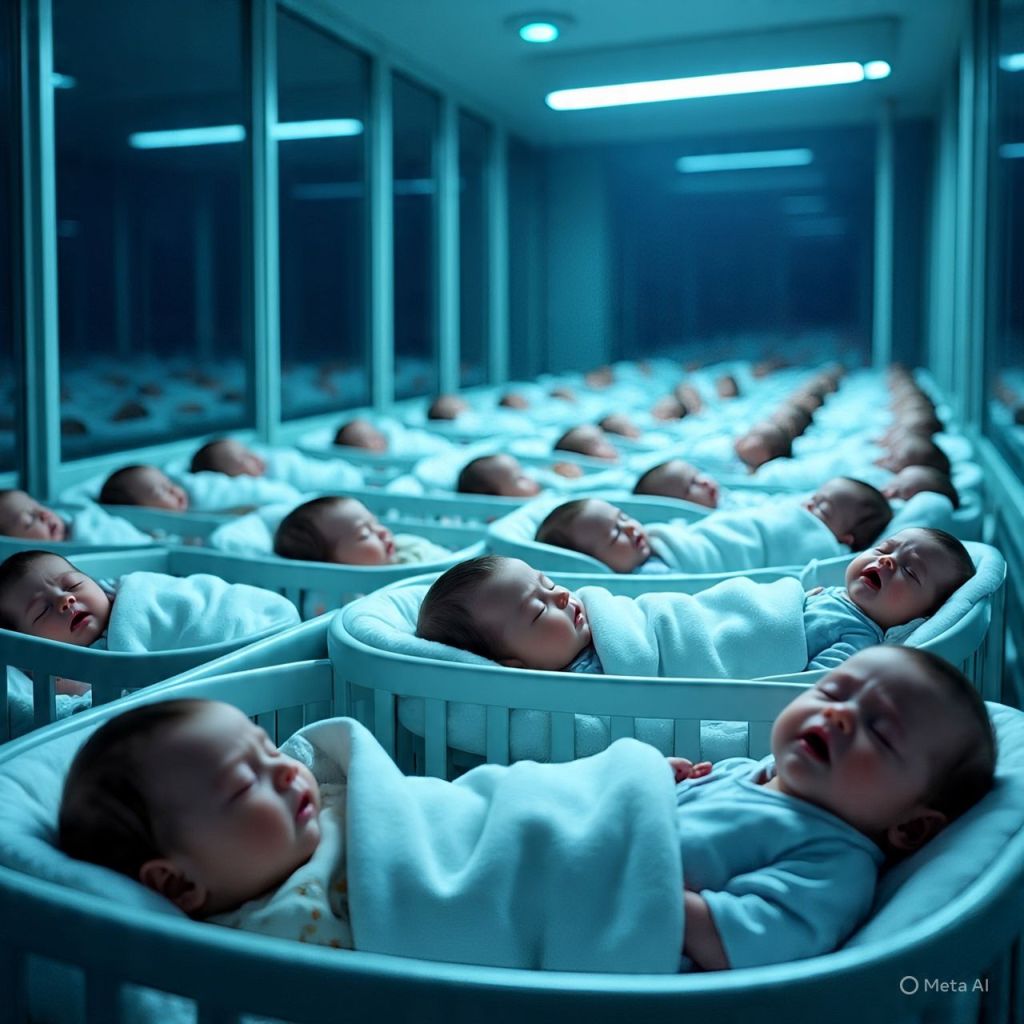 A nursery. Rows of newborns asleep under soft blue lights.