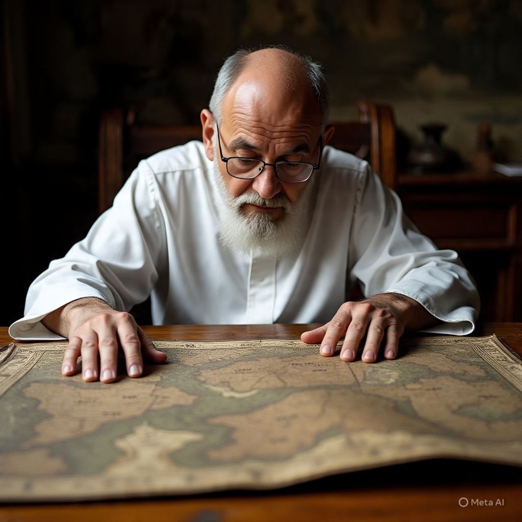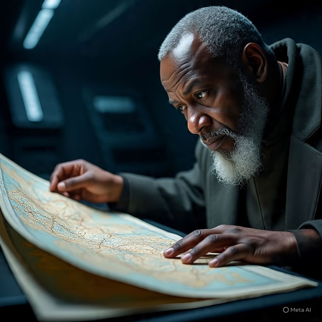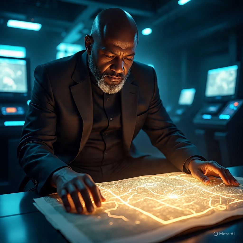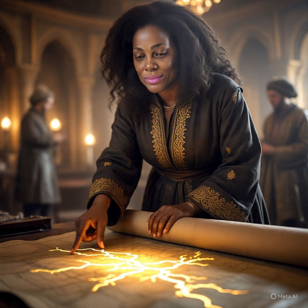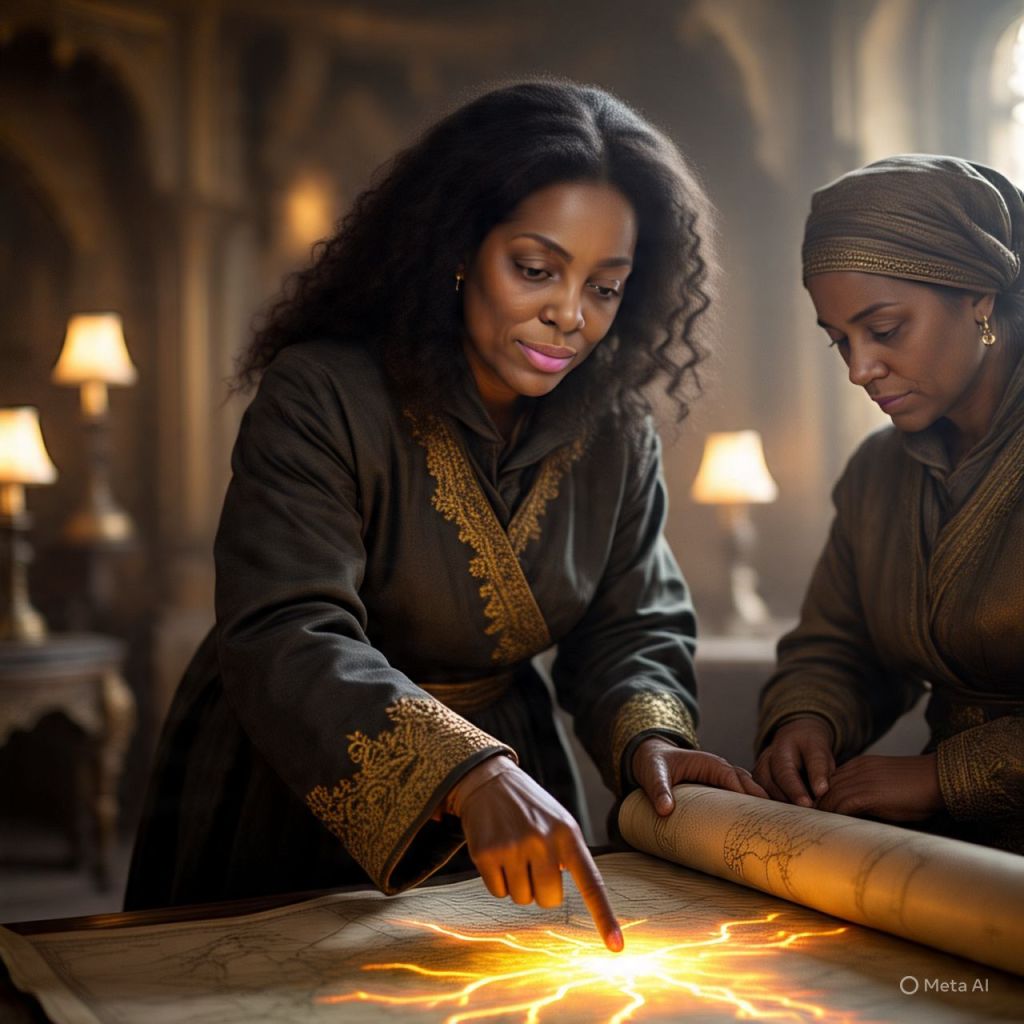 He unrolls the map. Veins of gold and red pulse across it like living blood vessels. When Antoinette touches it—the whole thing lights up.