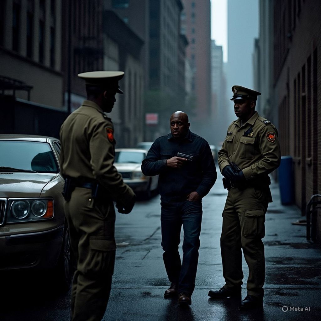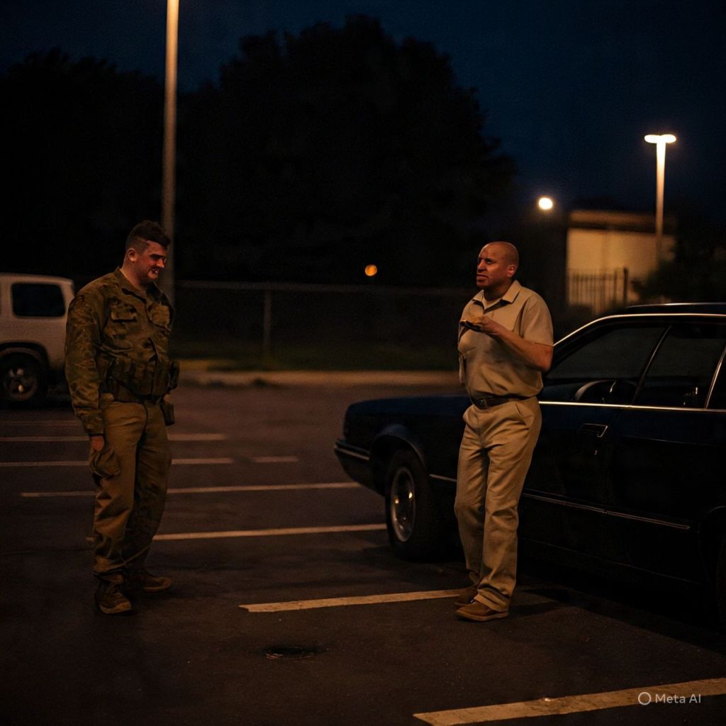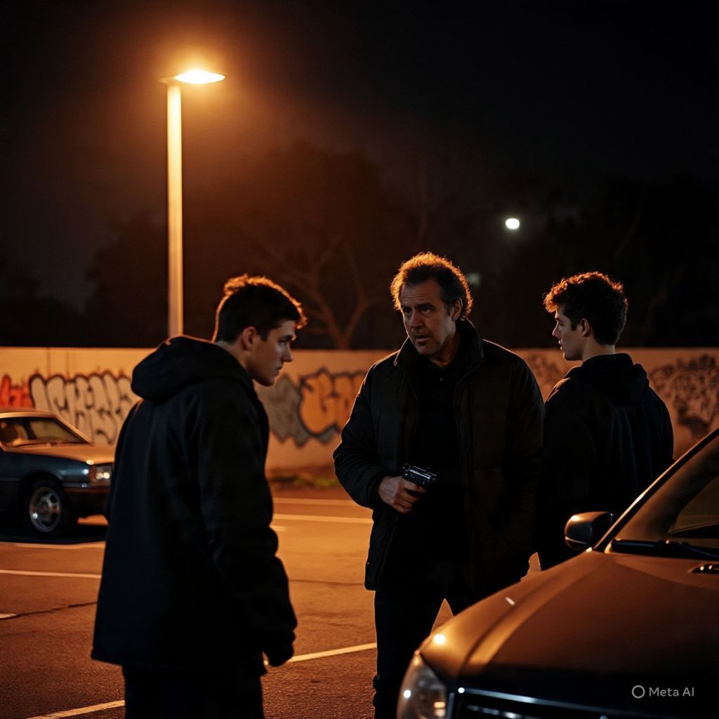 Tension snaps. Derrick pulls his gun, firing wild into the night. The soldiers scatter, shooting back. Bullets ricochet off cars, glass shatters, alarms blare.