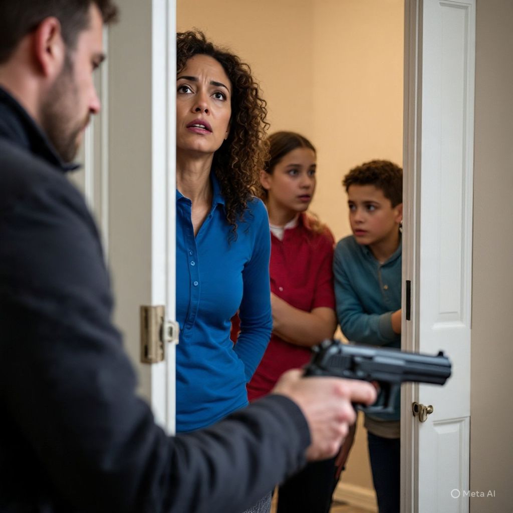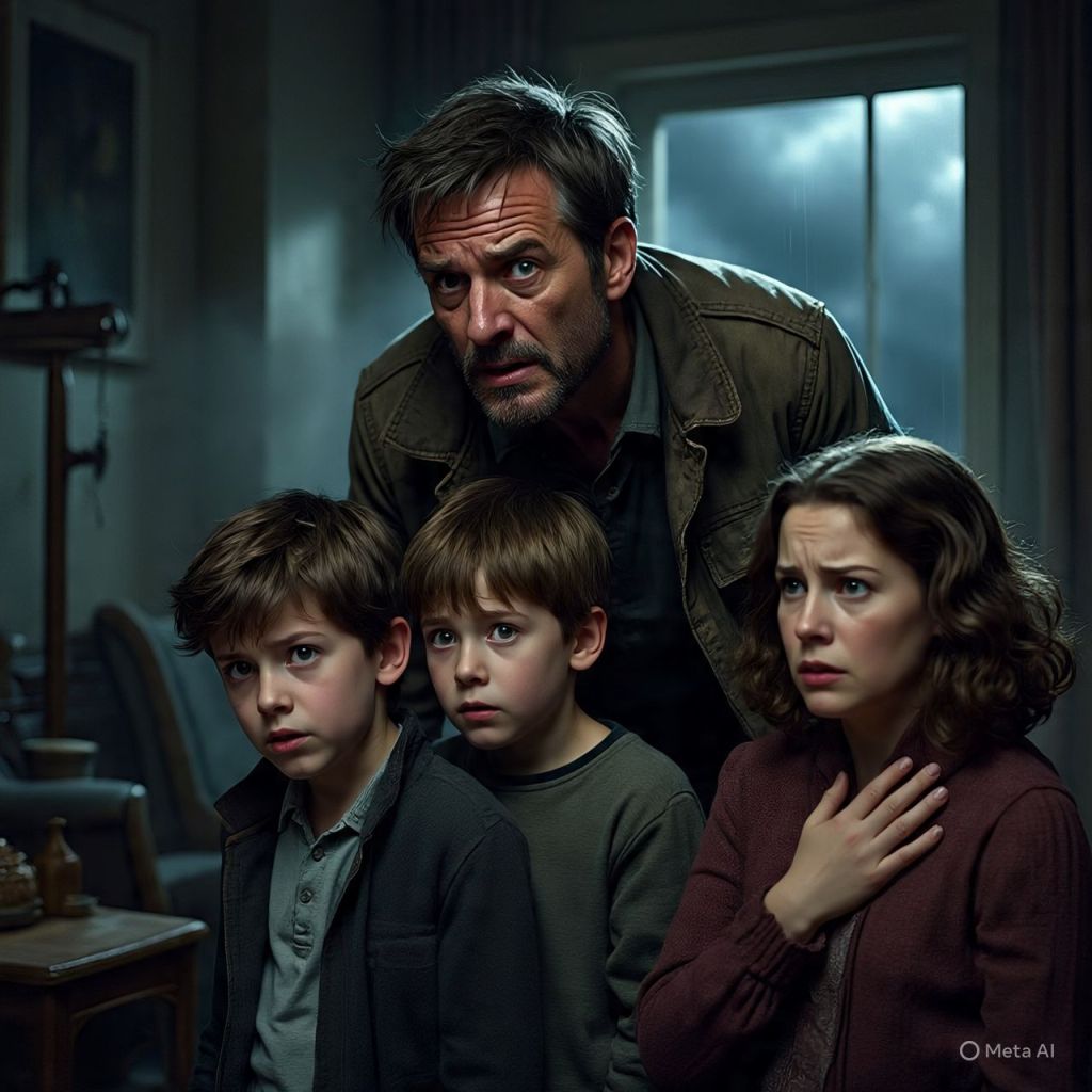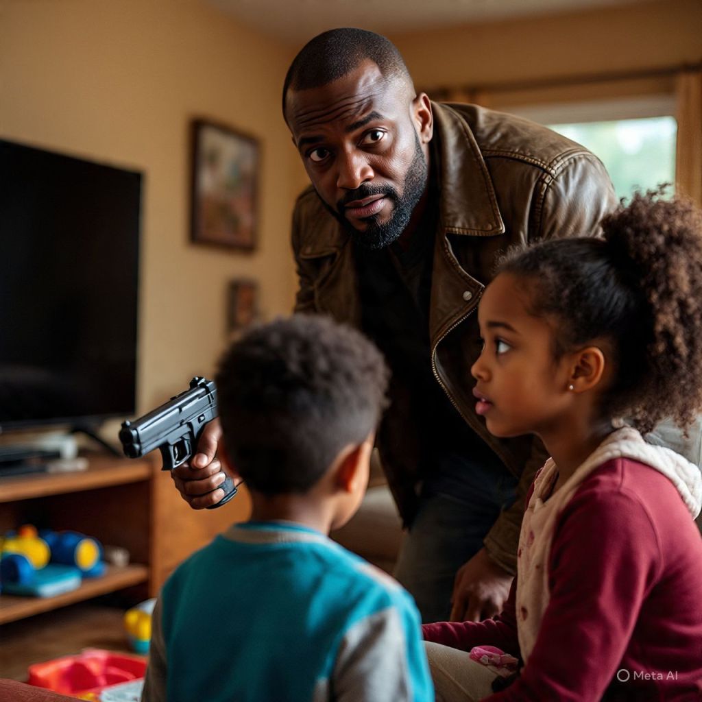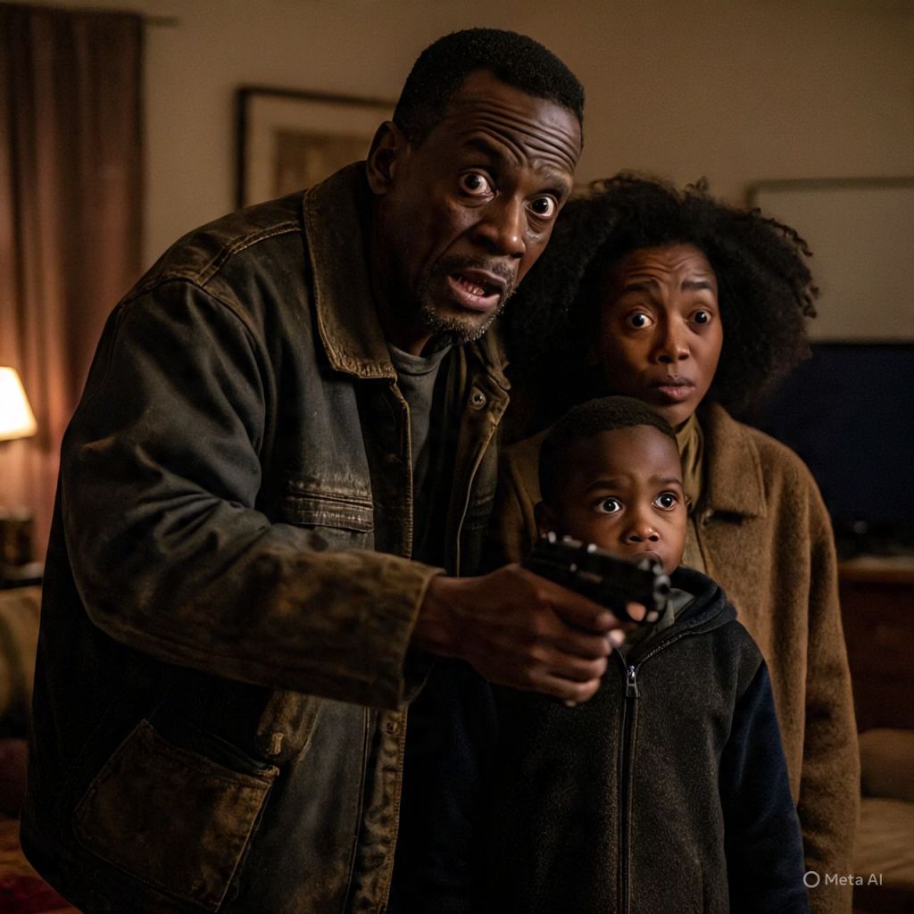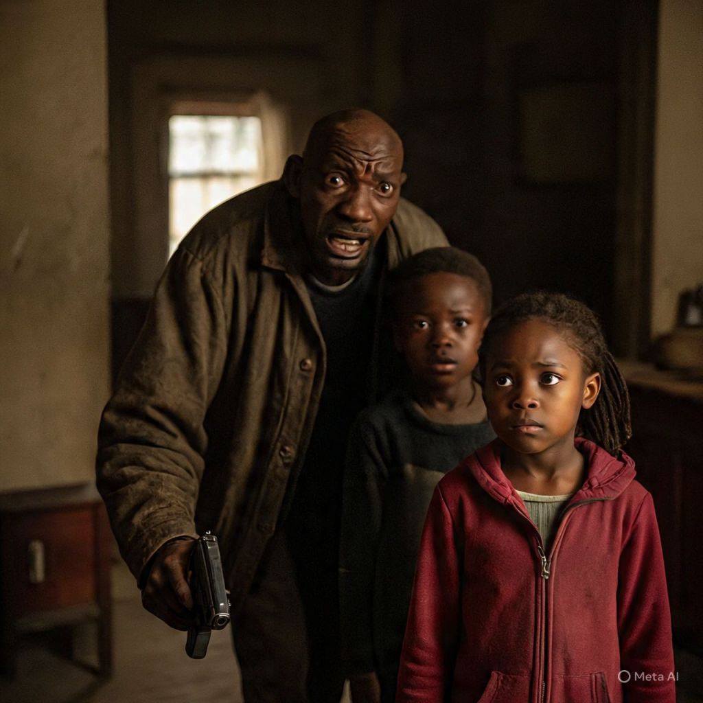 He storms inside, bleeding, gun still in his hand. Antoinette and the kids freeze.