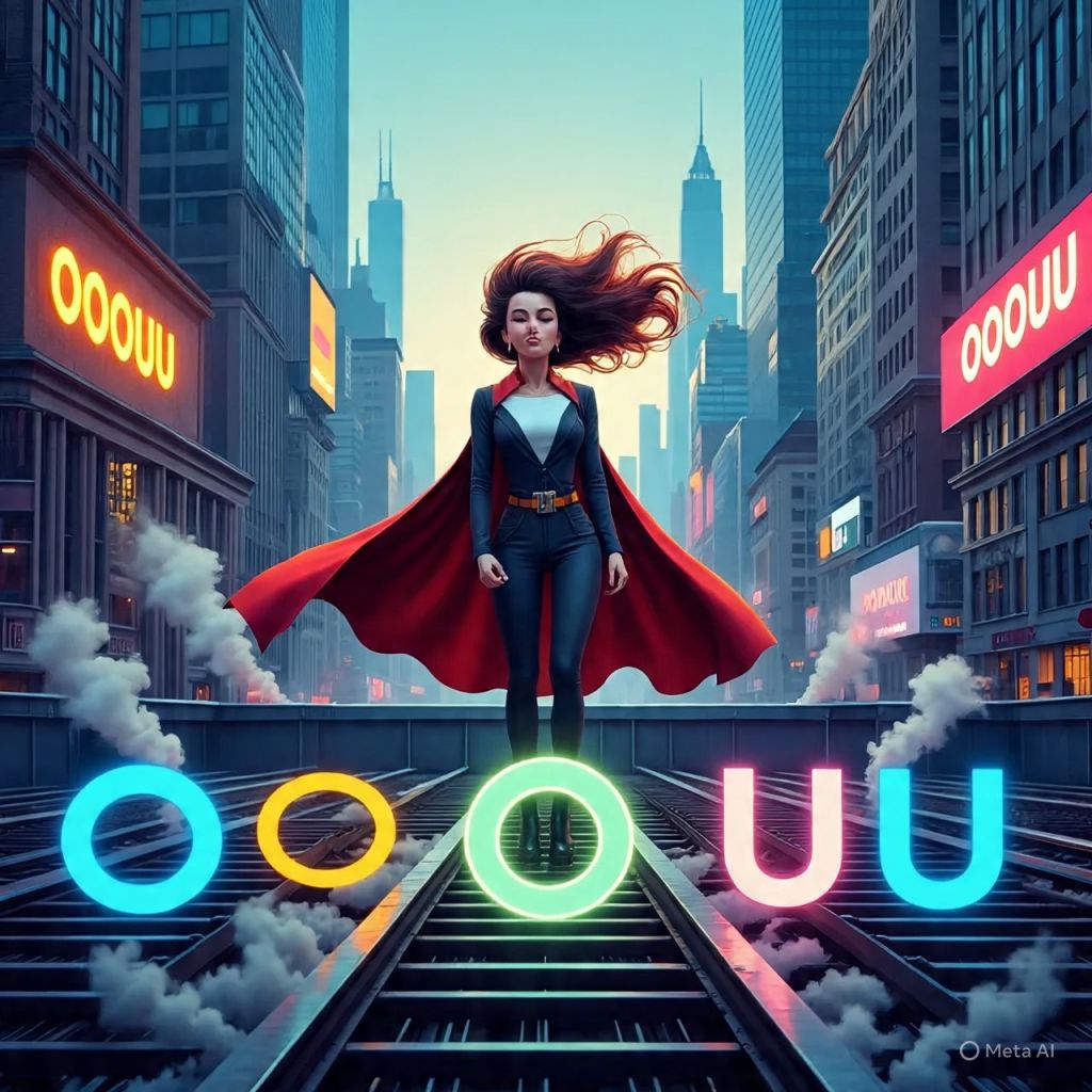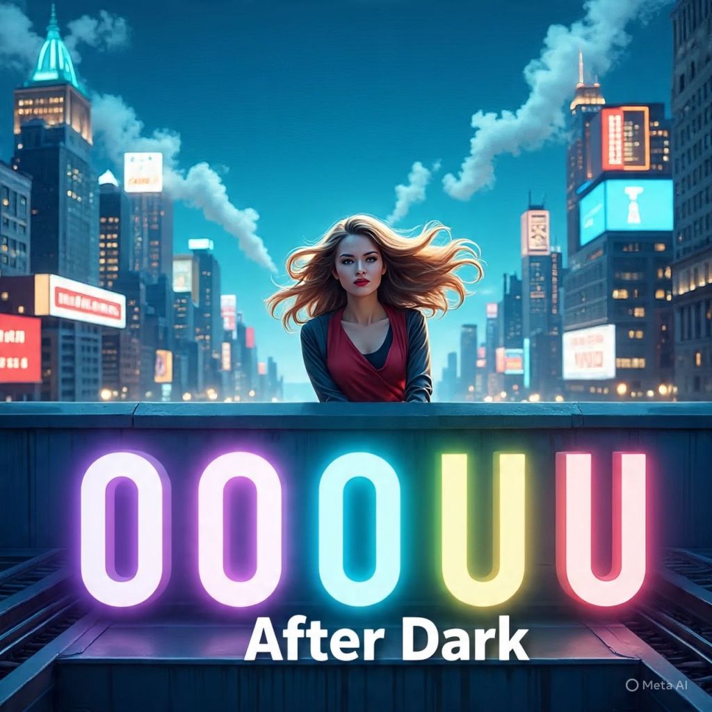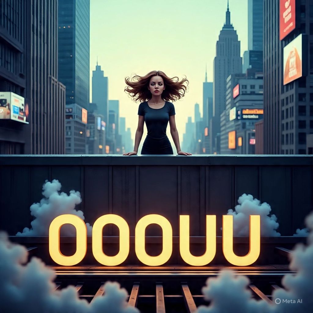 Skyscrapers bending slightly as if they’re leaning in to listen. Neon clouds hover above spelling “OOUU” in bright pink and gold.