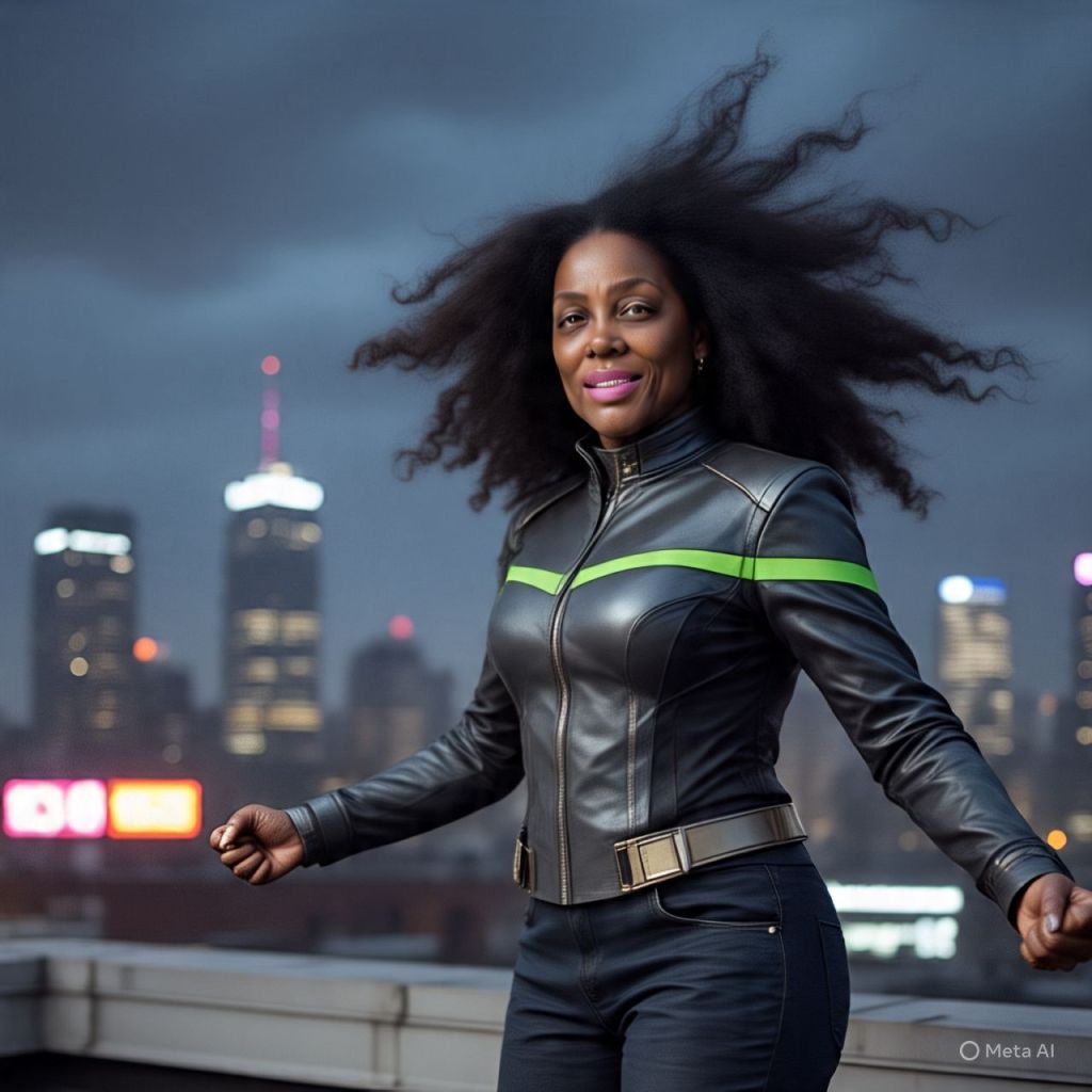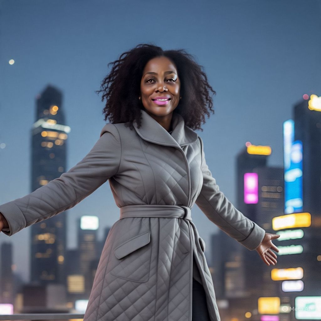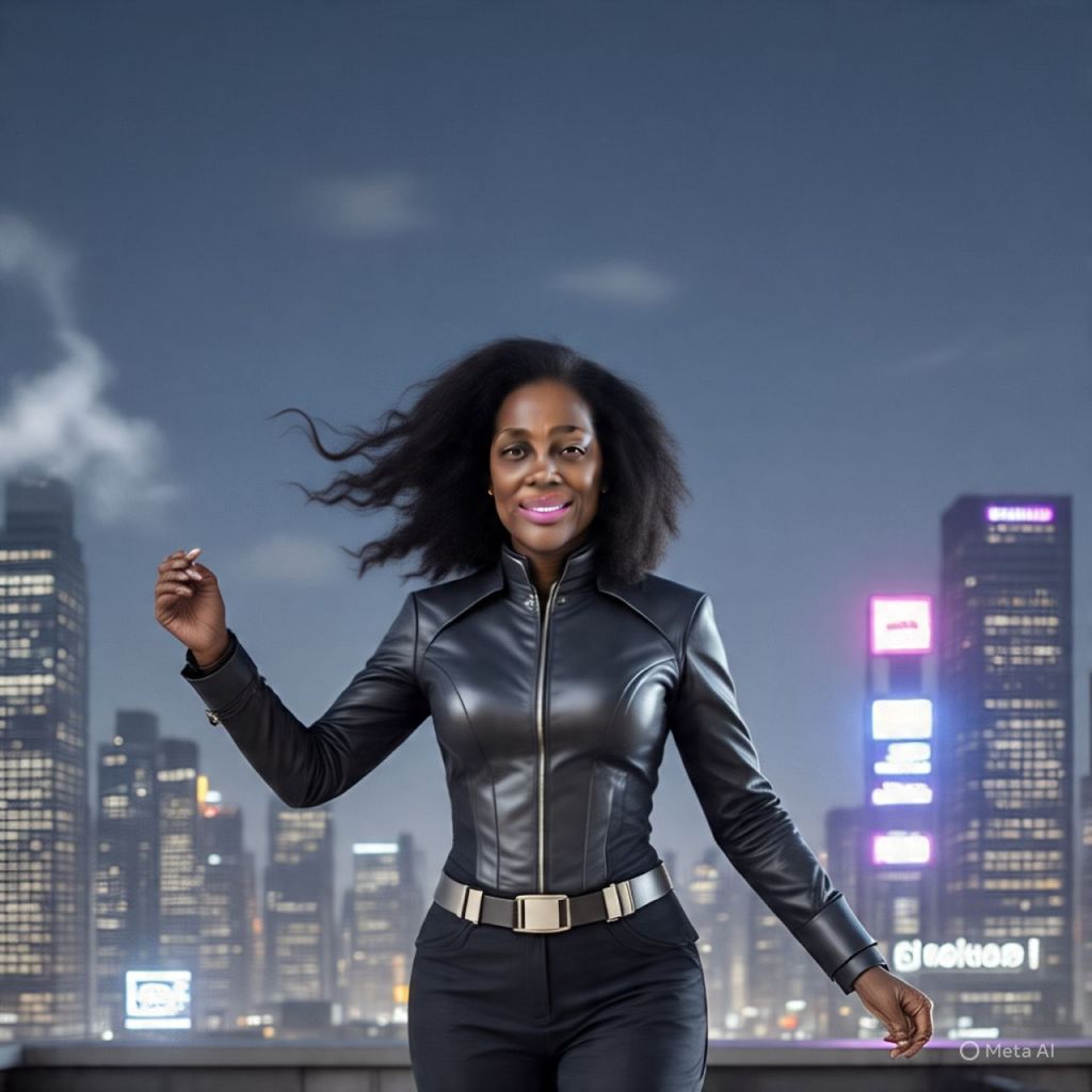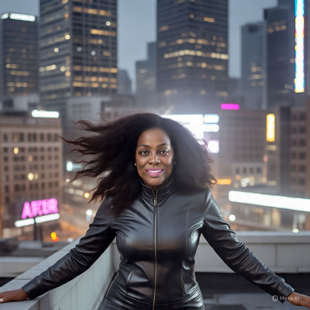 She steps forward, grins at the city skyline:
