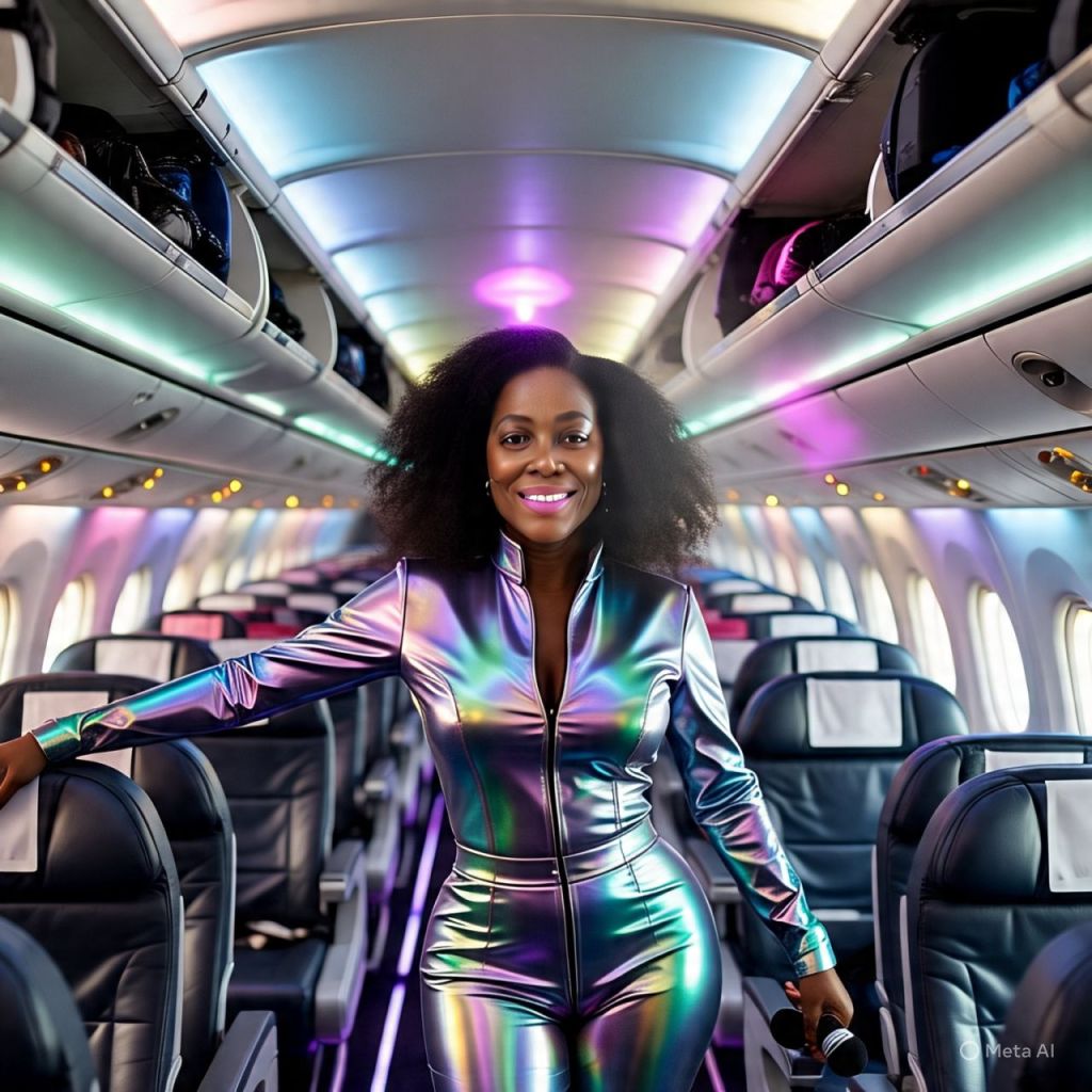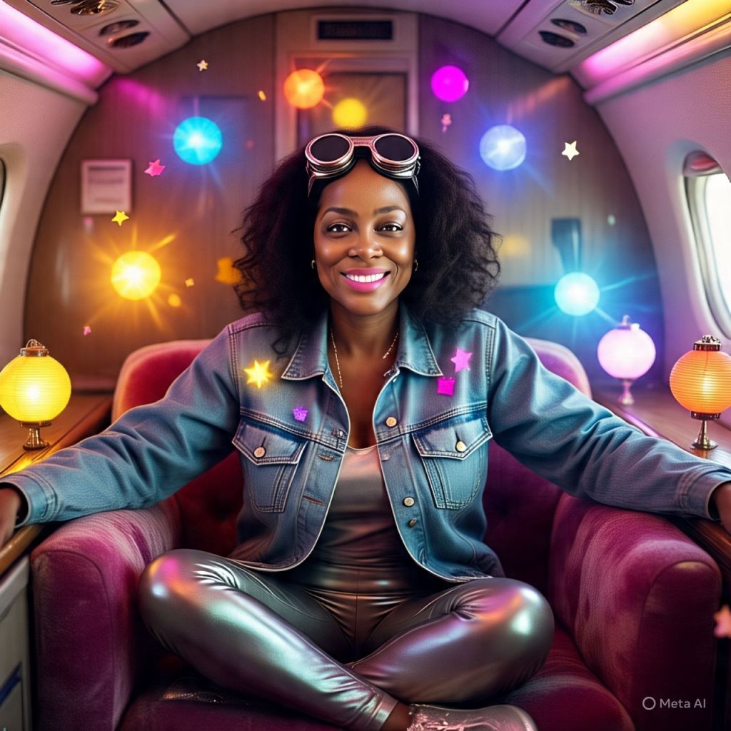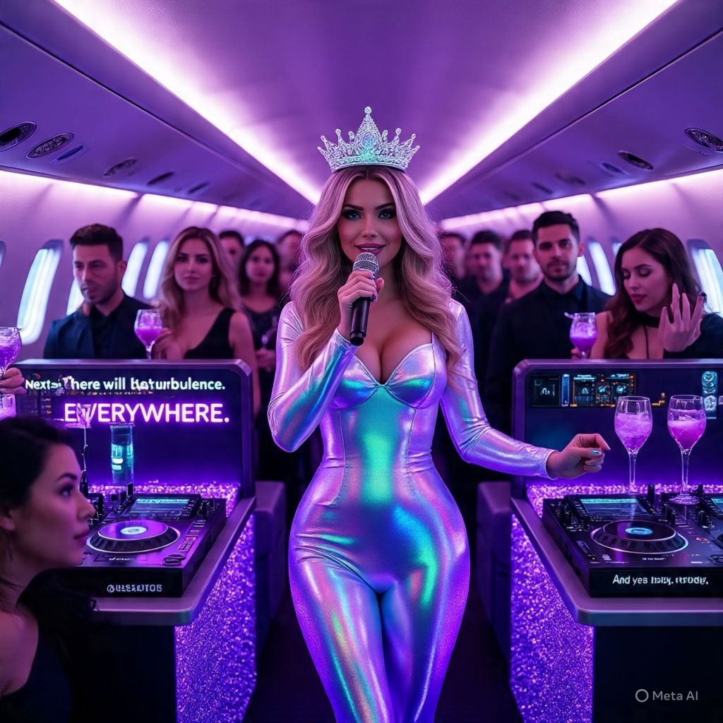 A diamond-encrusted jet with purple neon lights inside, twerking angels serving cosmic cocktails, and a DJ booth spinning freaky bass.
