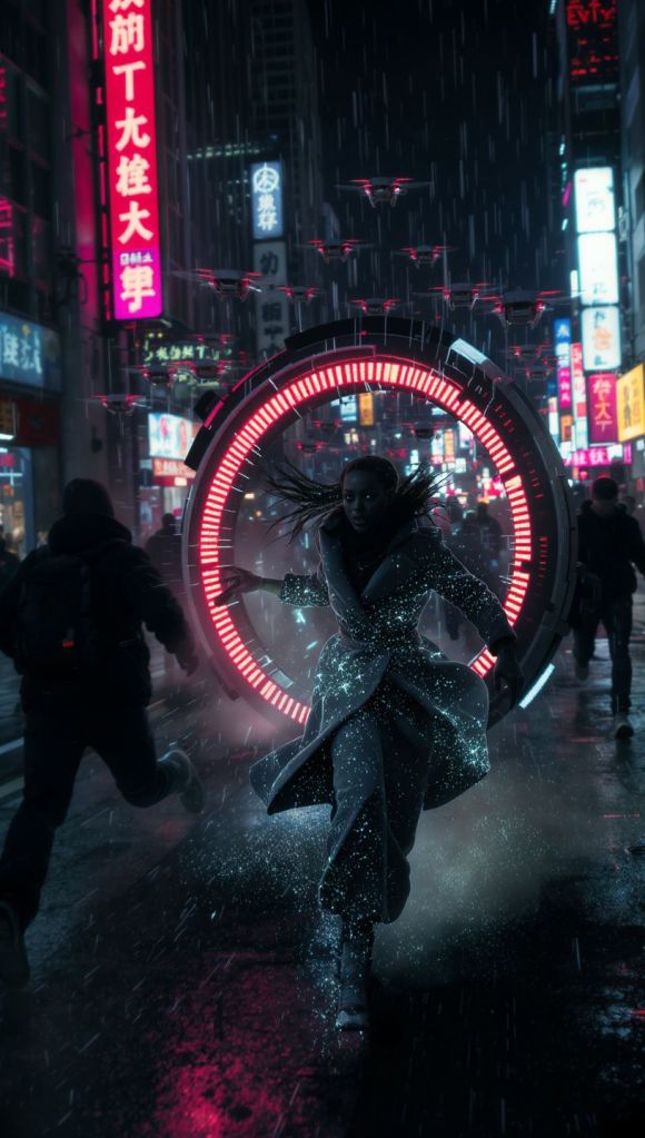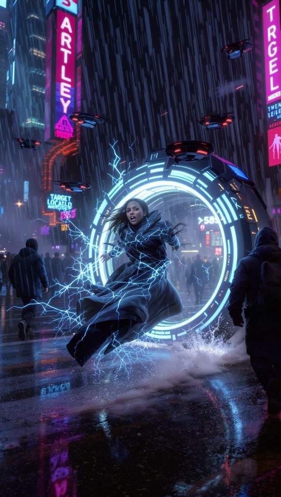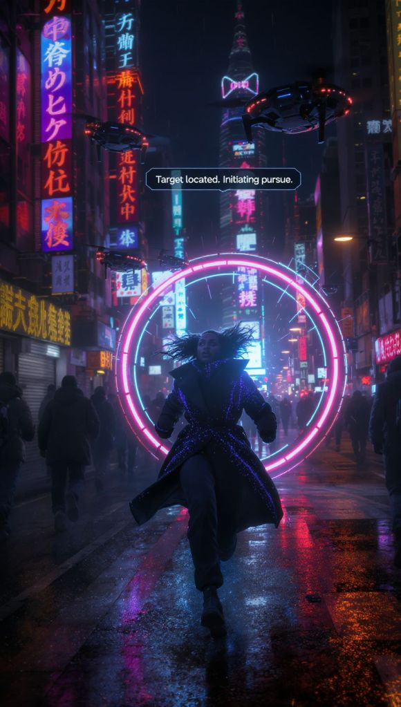 The world is overwhelming — hover cars glide above, holographic billboards scream propaganda, and robotic guards scan civilians.