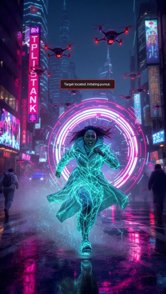 Antoinette bolts through the crowded neon street, pushing past futuristic pedestrians.
