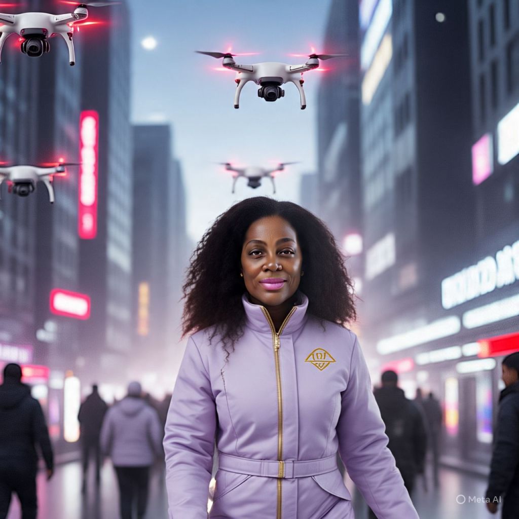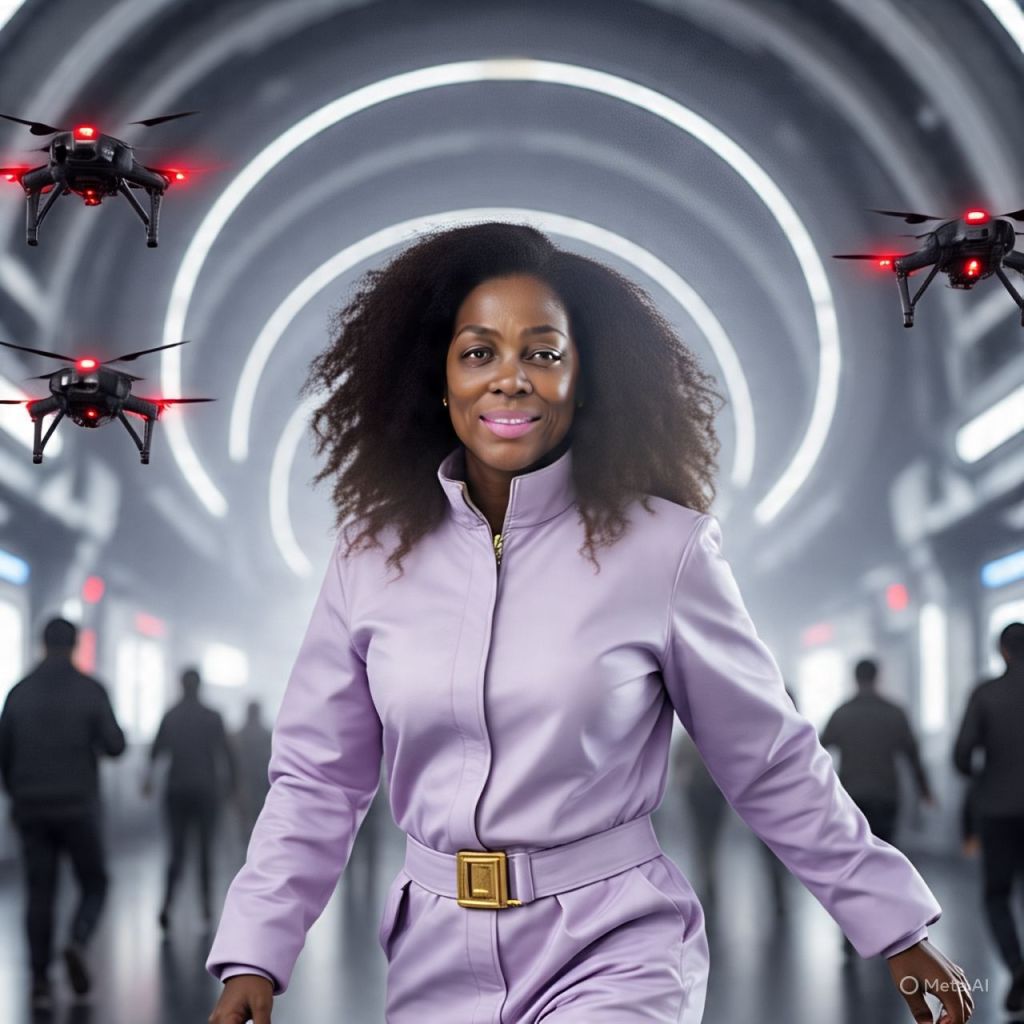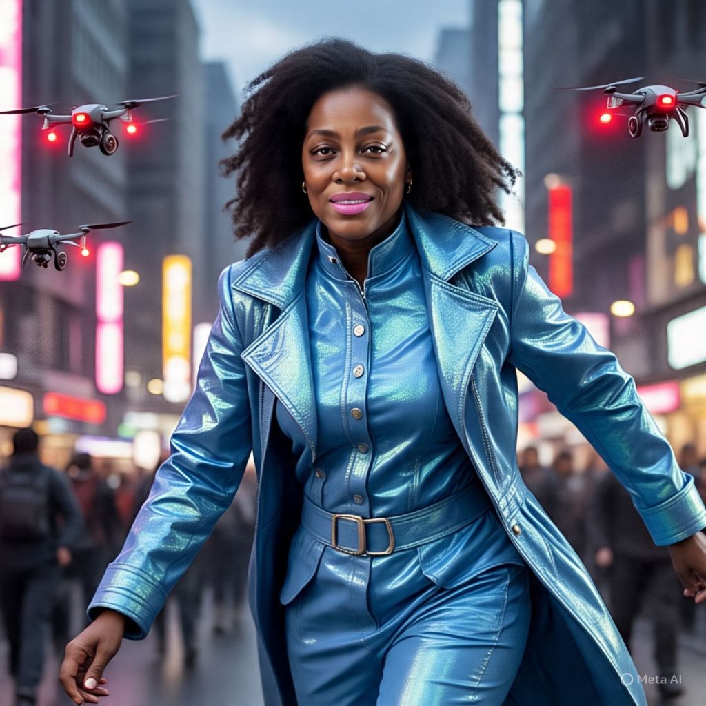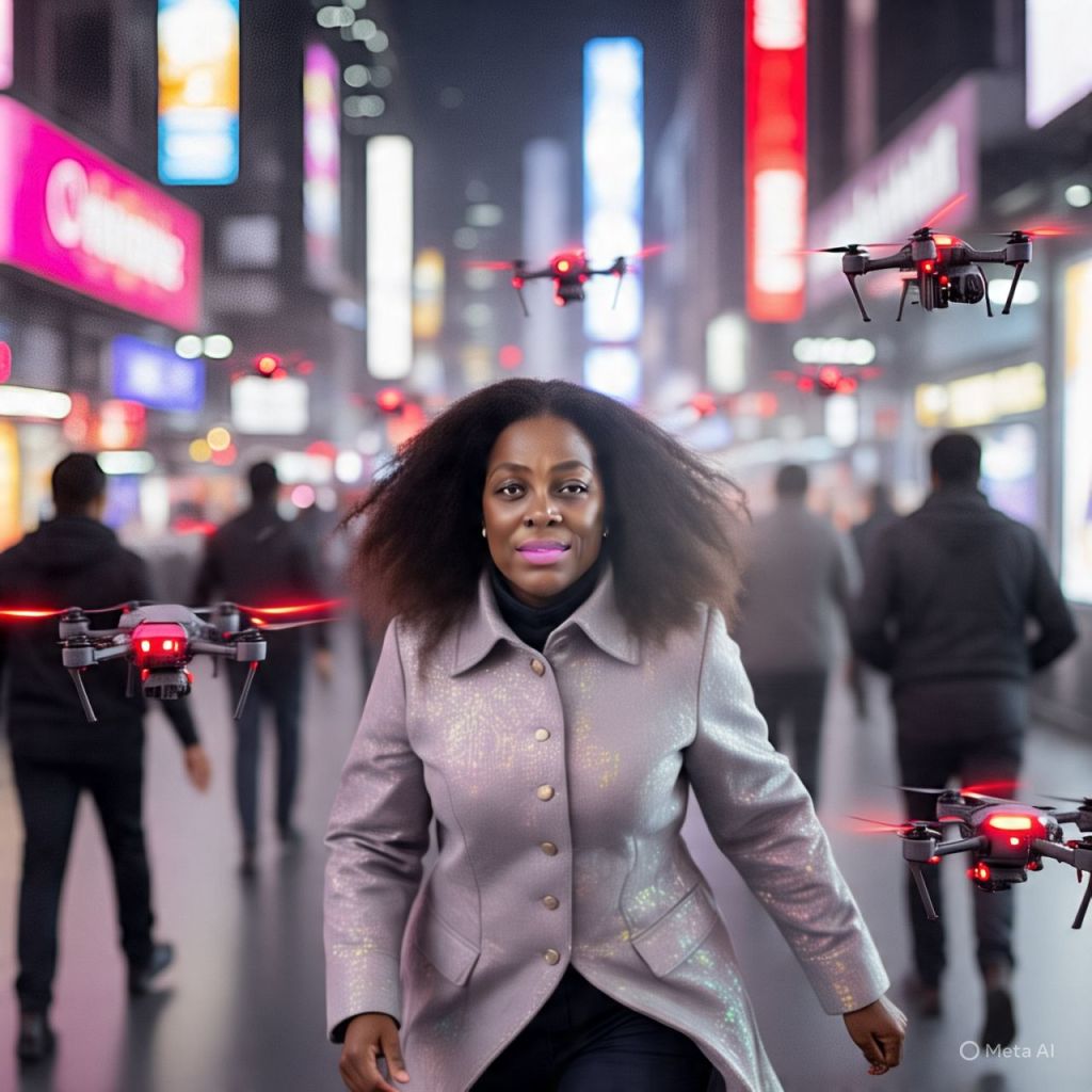 The drones swoop down, firing stun blasts. Antoinette sprints, weaving through the crowd.