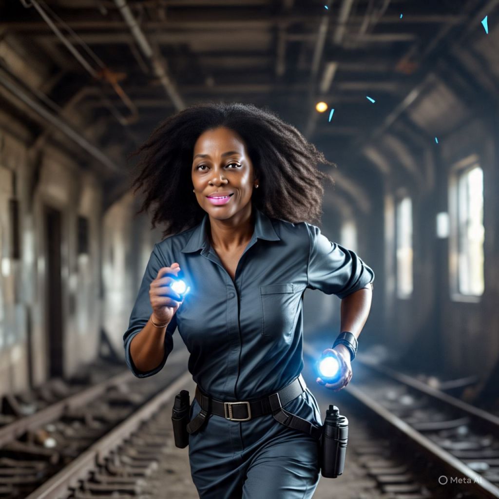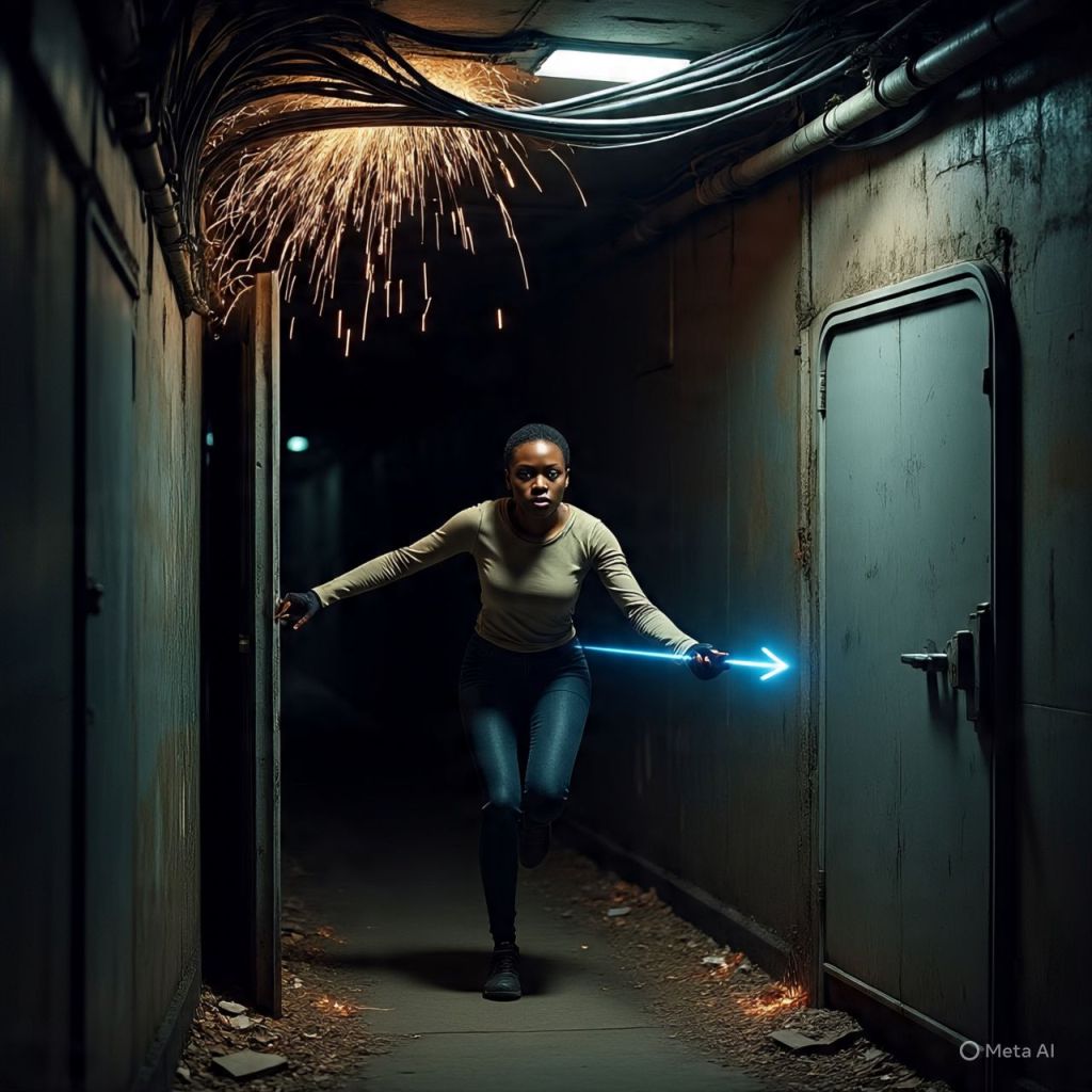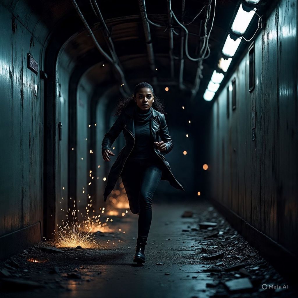Antoinette sprints through the tunnel, drones still echoing behind. Sparks rain from broken wires above.