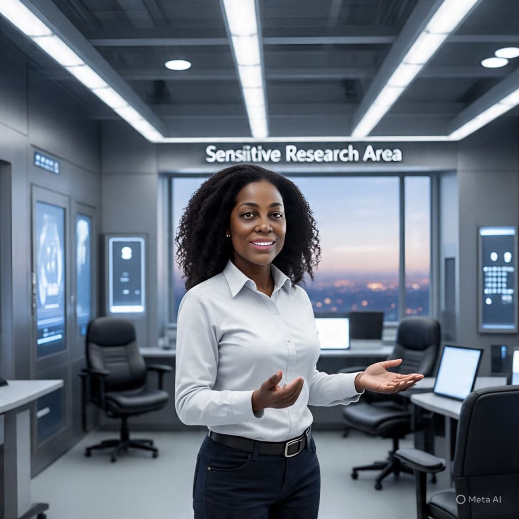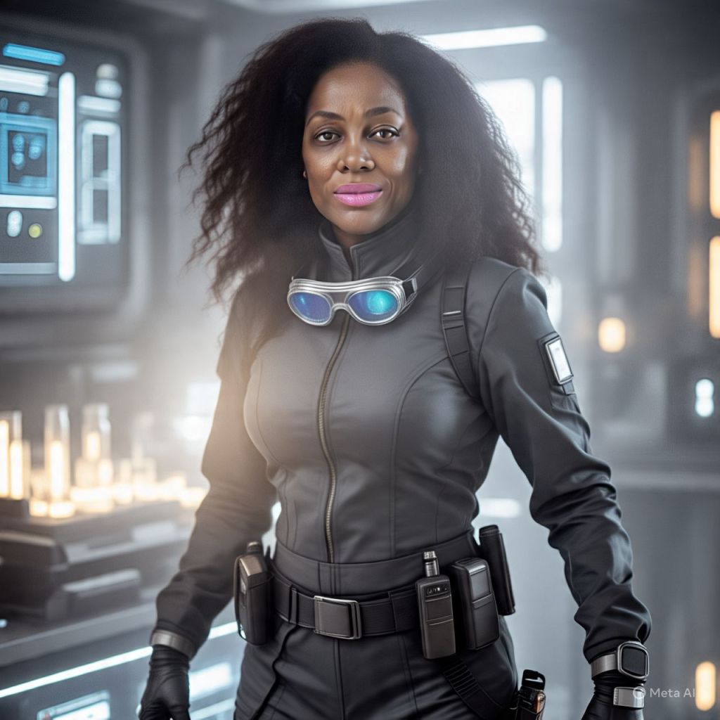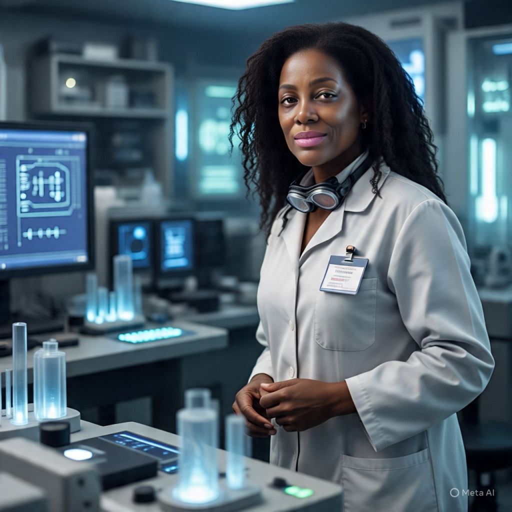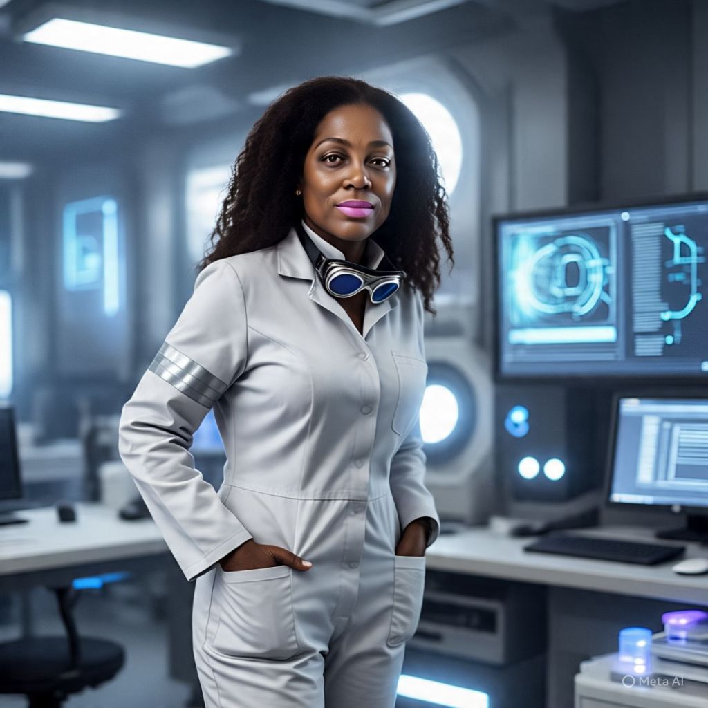 Dr. Elara Myles (34) stands there — sharp, brilliant, and intense. Lab coat half-open, goggles hanging from her neck.