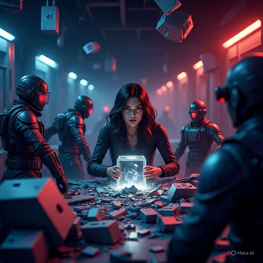 ENFORCER DRONES charge. Antoinette smashes one into the ground using the cube’s energy like a gravity wave — realistic physics, sparks flying.