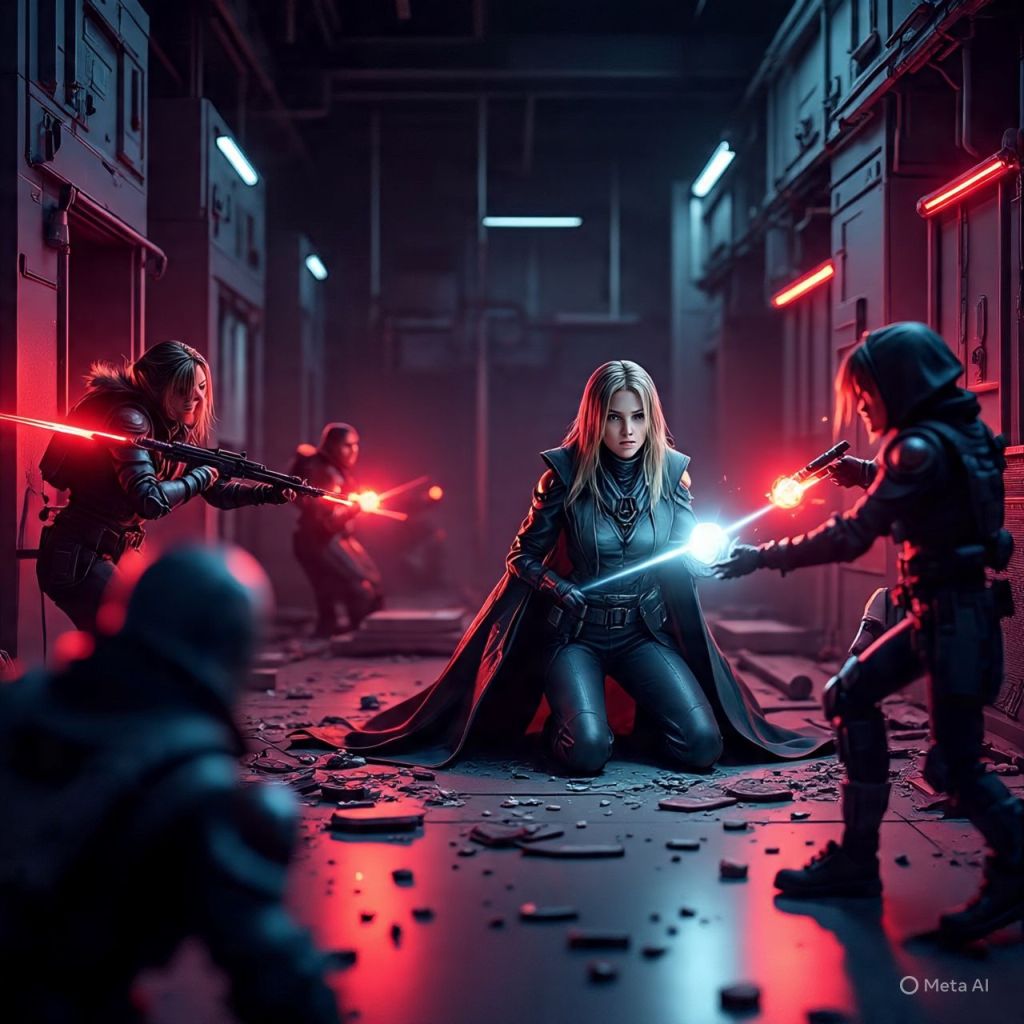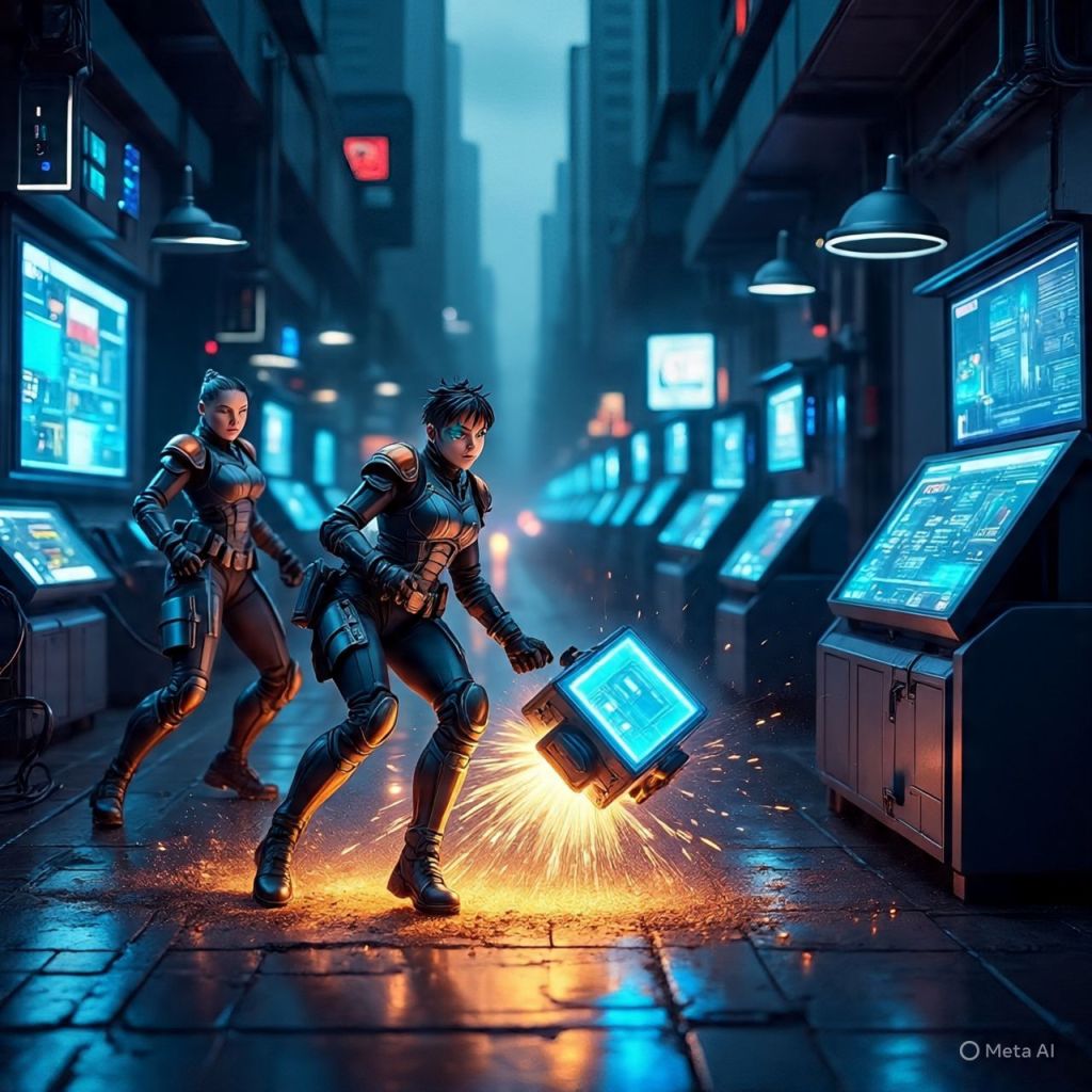 Elara hacks into a wall console mid-fight, disabling part of the drones’ targeting system. Futuristic, but logical.