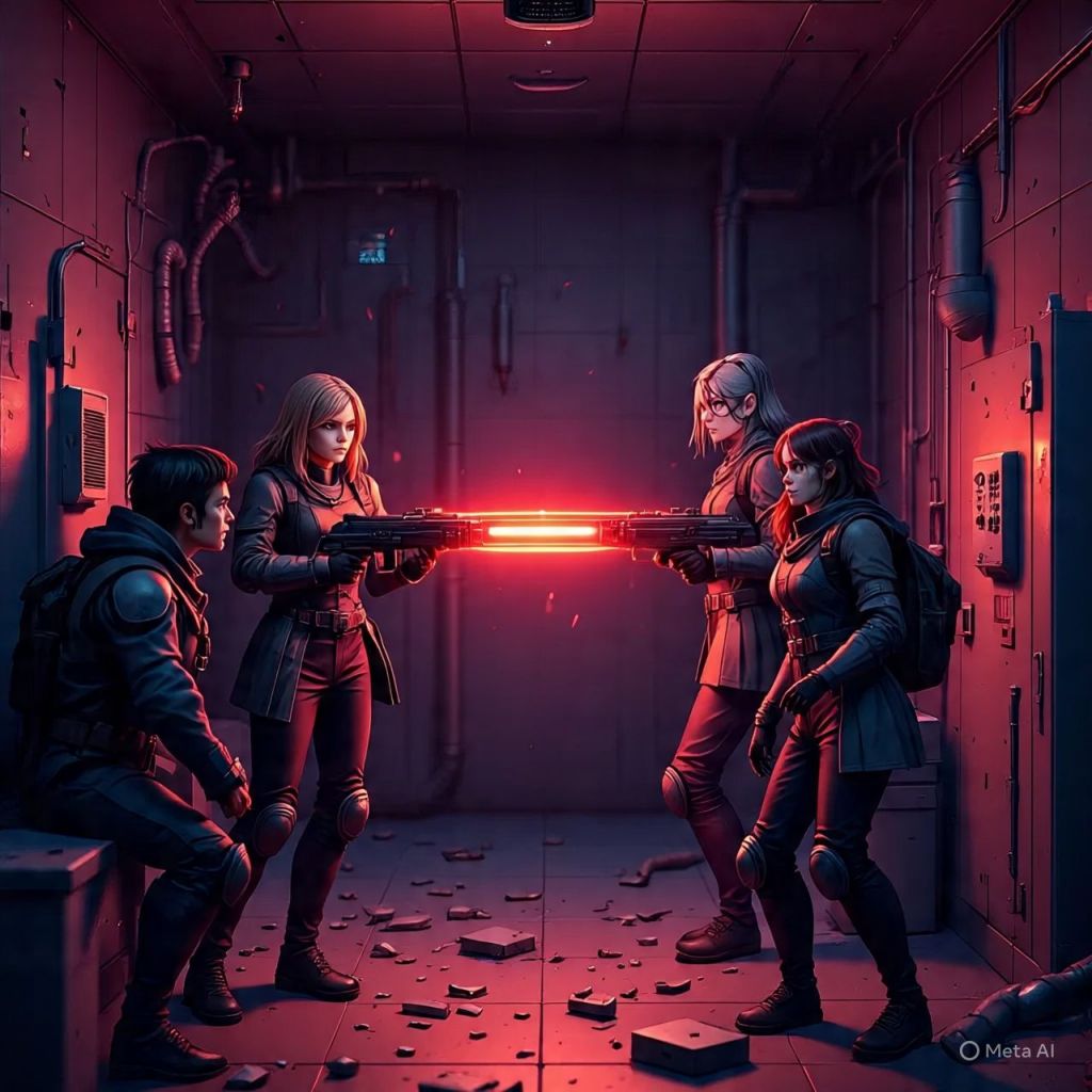 The new enemies close in. Red lights from their weapons reflect off the broken walls. Antoinette and Elara are trapped.