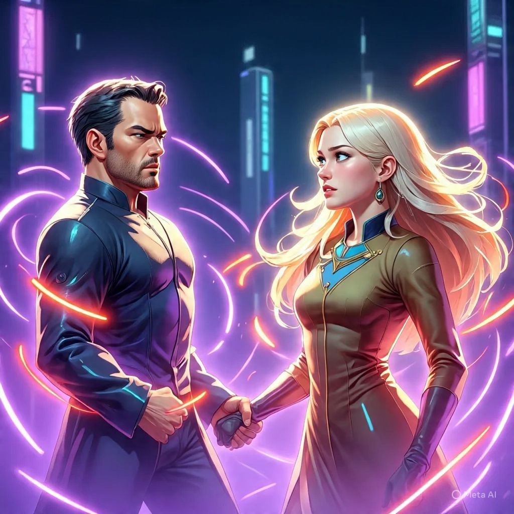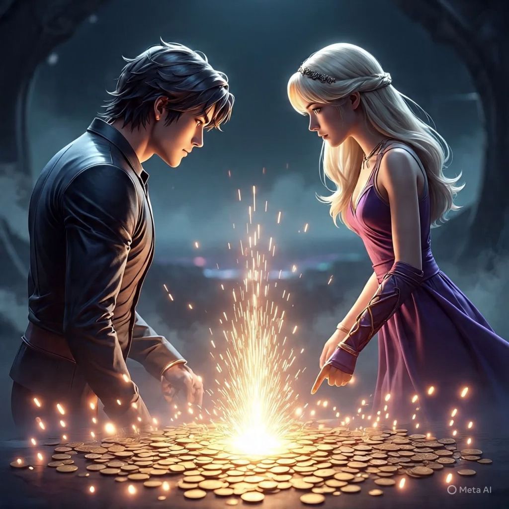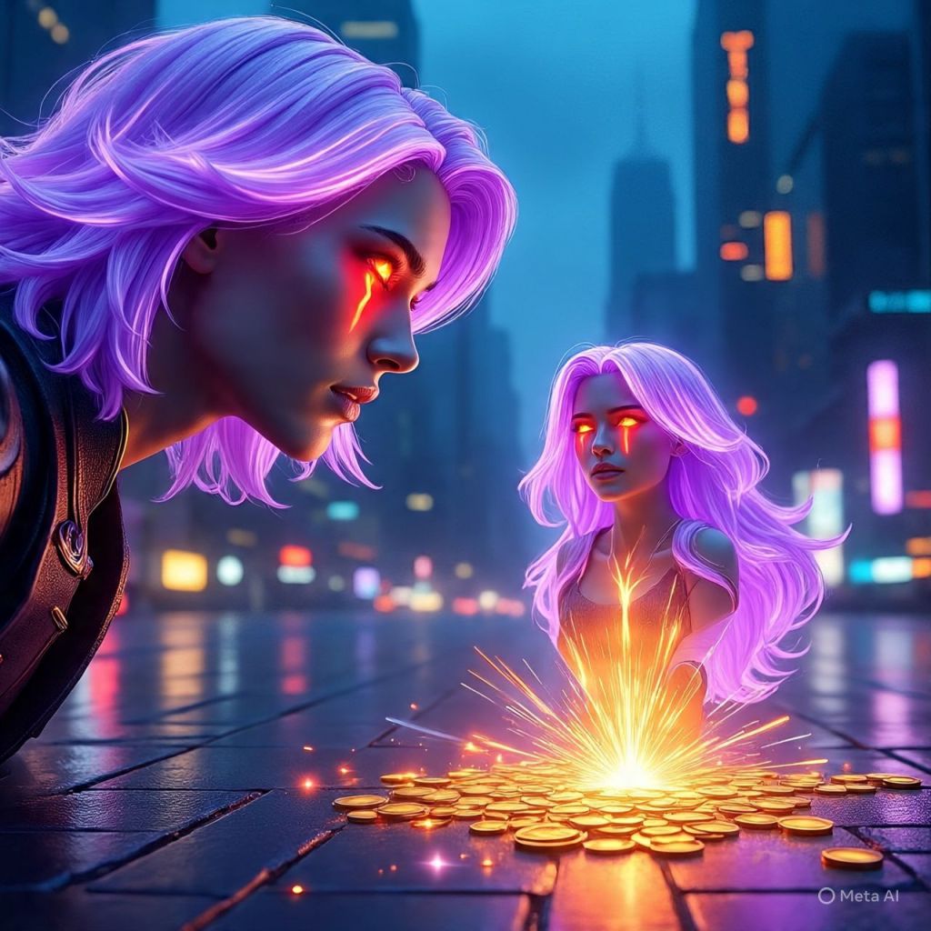 Mirael launches a massive chaos pulse, flipping genders mid-air, glitching every security system, manipulating emotions of the masses. People panic; coins flicker red.