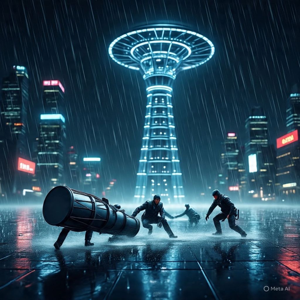 Night rain on metal. Security drones hum around the Resonant Bell Array.
