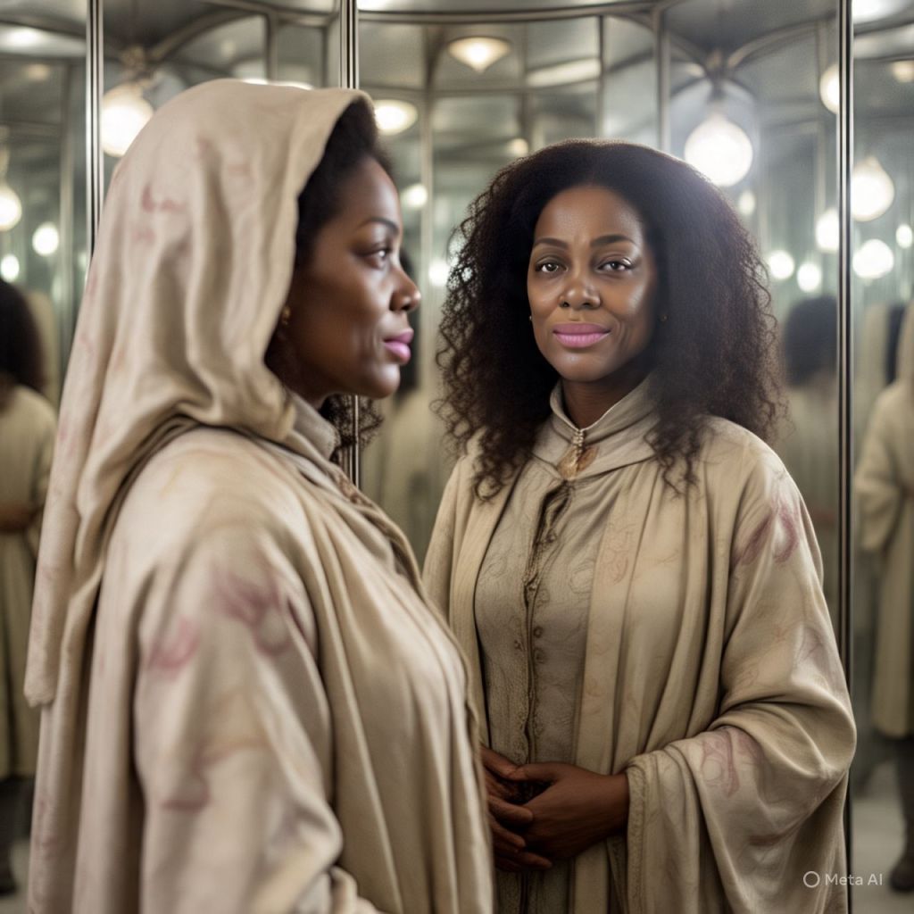 Antoinette stands face to face with her twin, the other her — calm, confident, eyes cold as mercury.