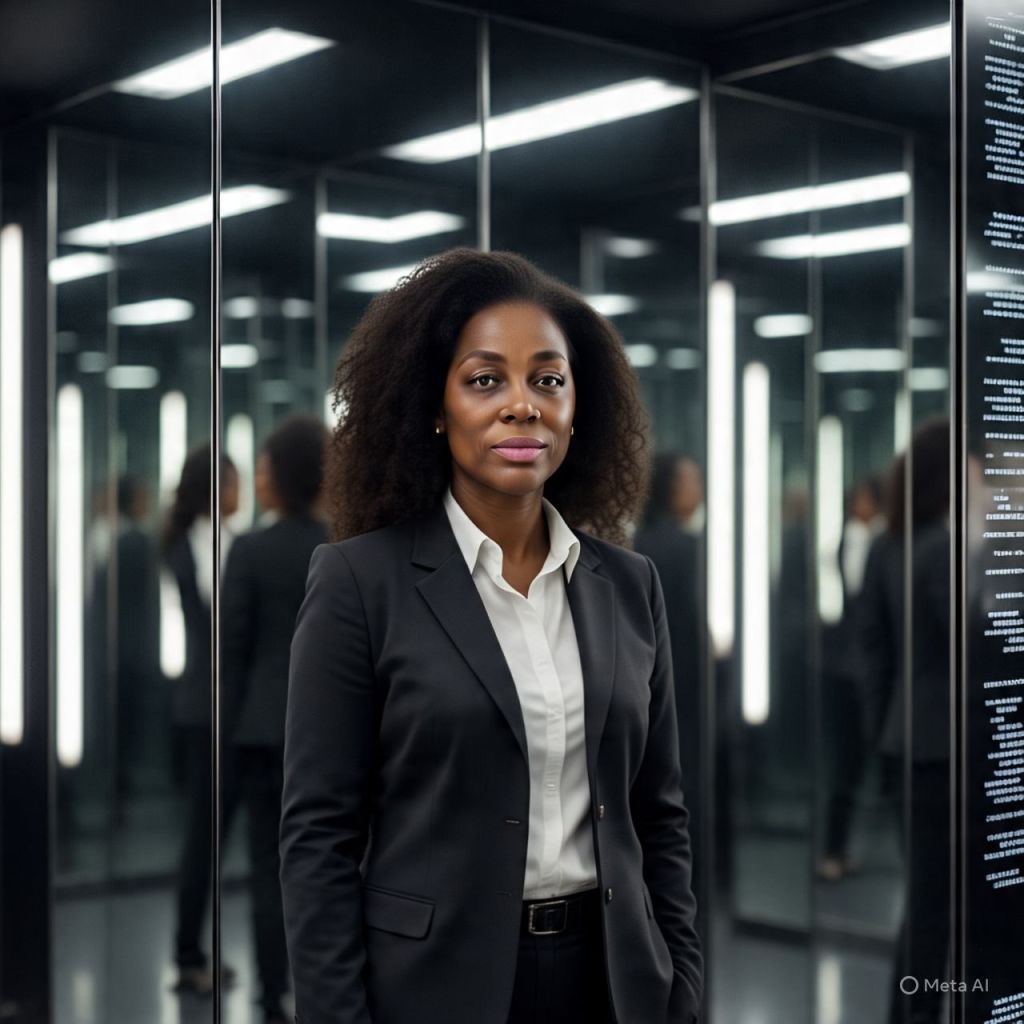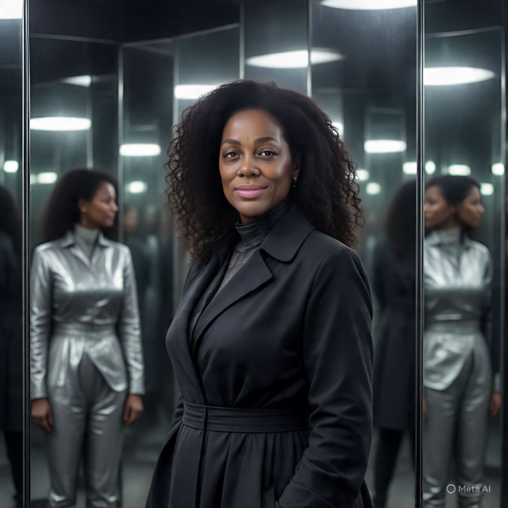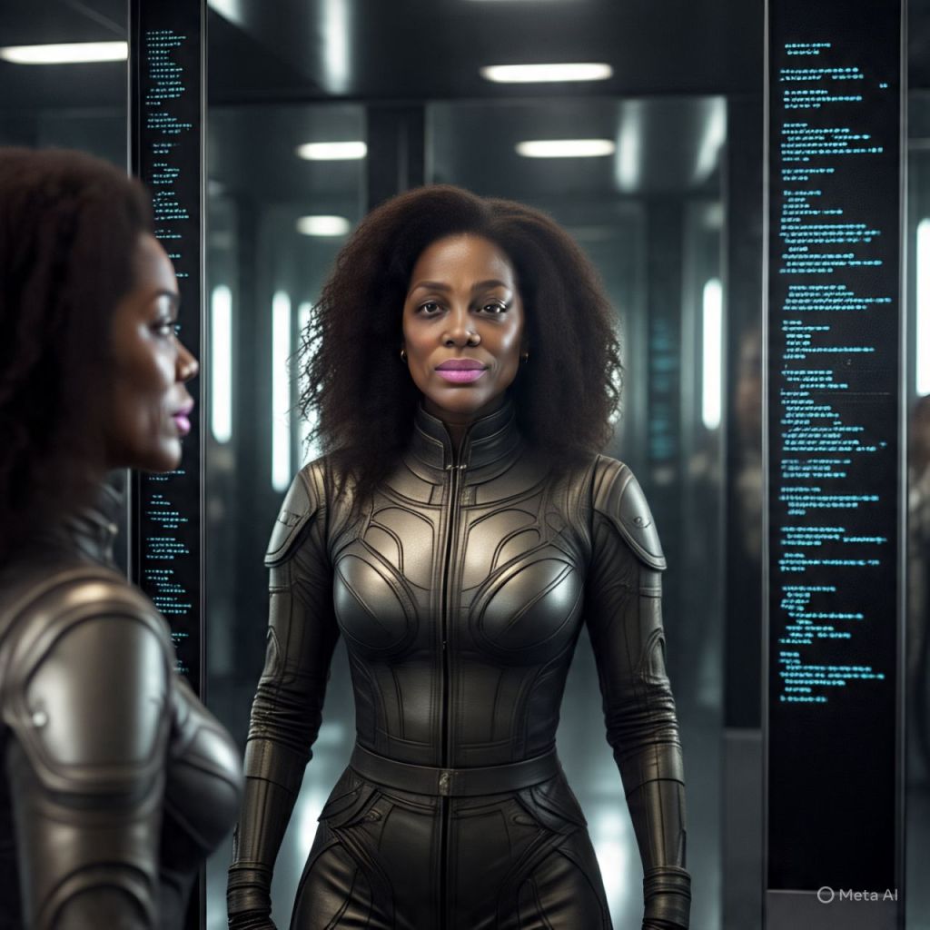 The camera pans across a dark mirror chamber— walls of polished black glass, glowing with shifting code.