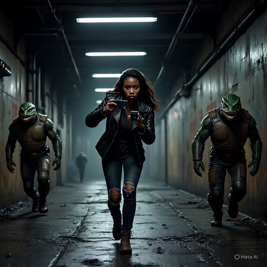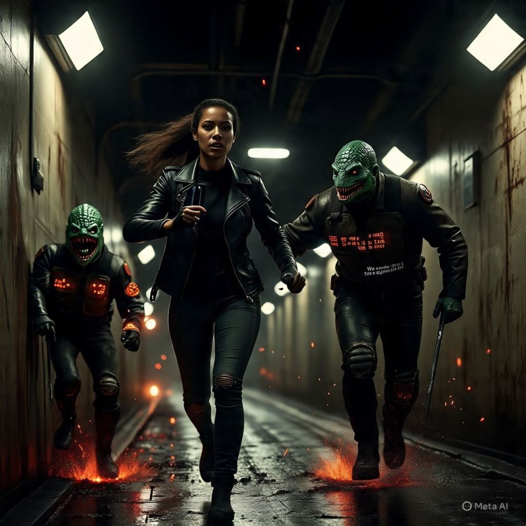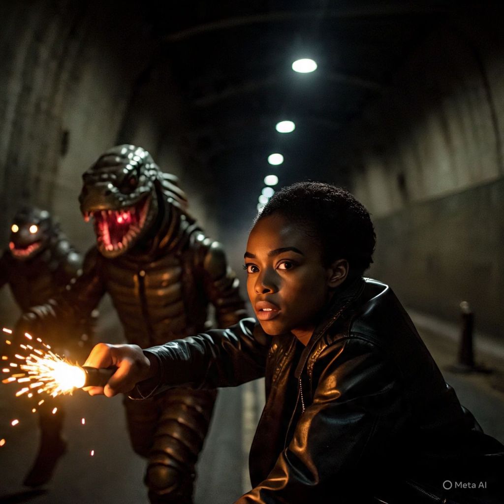 Two reptilian guards chase her through the tunnels. She fights using tools from her car trunk — flare, wrench, holy oil. Pure action, fast cuts, sparks, and blood mist.